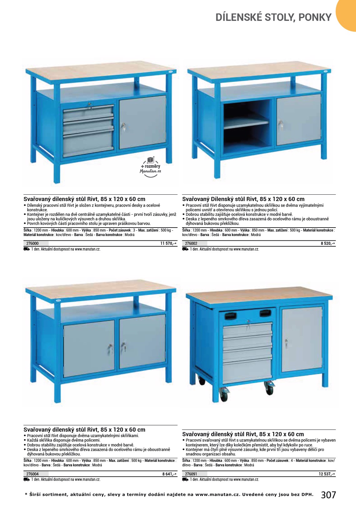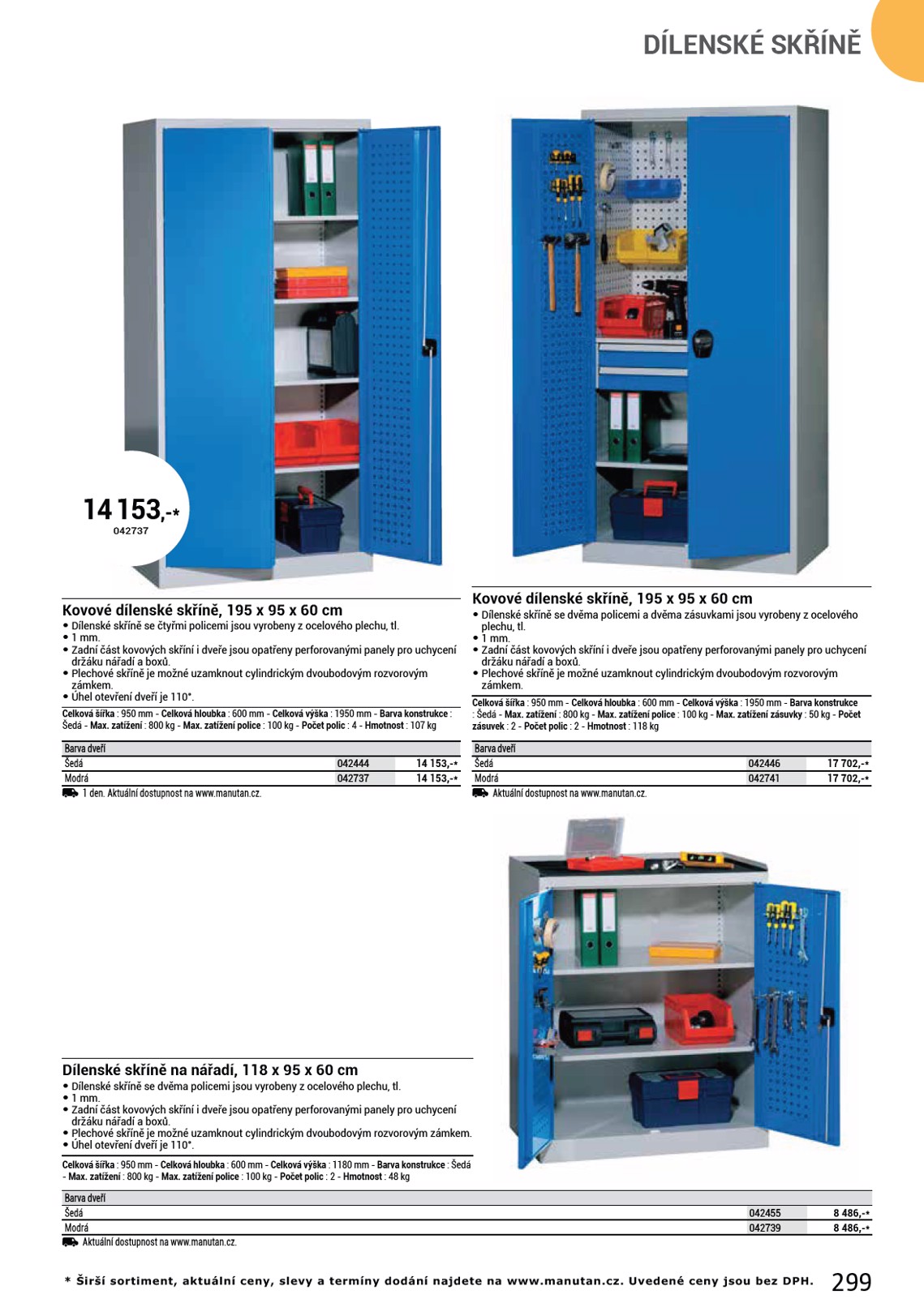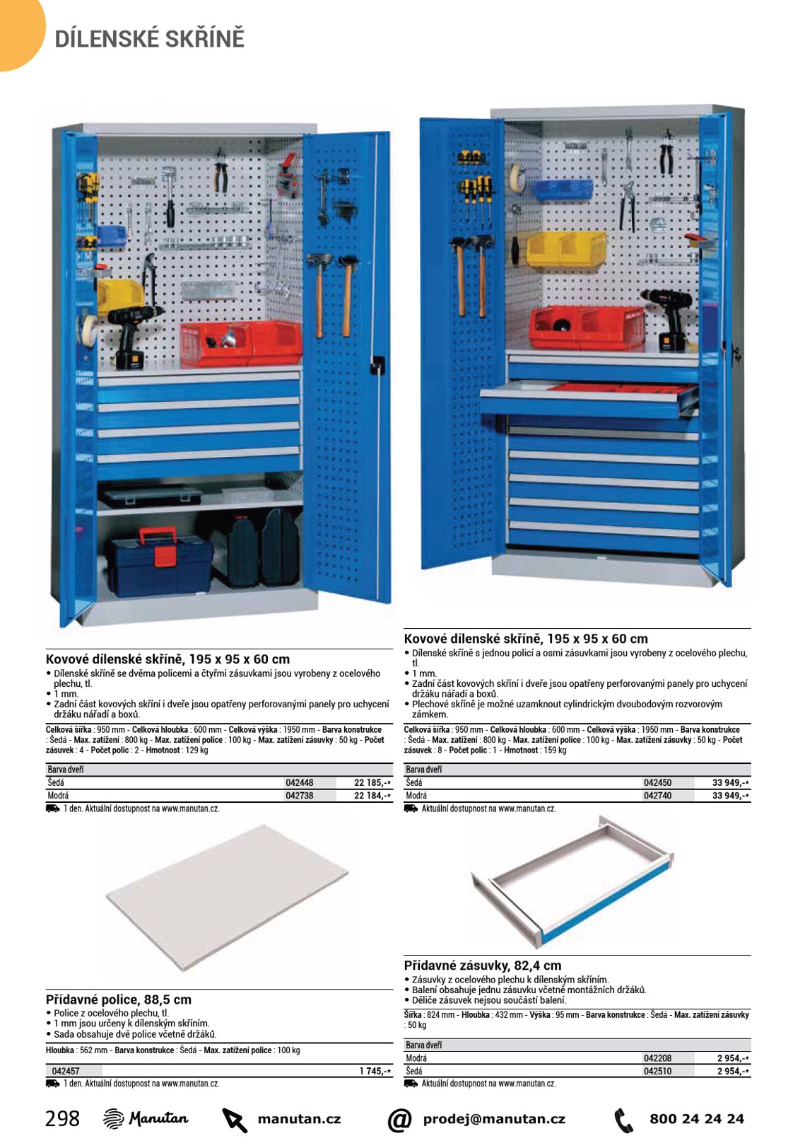 DÍLENSKÉ SKŘÍNĚ Dílenské skříně na nářadí, 195 x 95 x 40 cm • Kovová skříň se čtyřmi výškově nastavitelnými policemi a prosklenými křídlovými dveřmi je vhodná všude tam, kde je nutné mít rychlý přehled o obsahu skříně. • Je uzamykatelná rozvorovým cylindrickým zámkem. • Skříň dodáváme v demontovaném stavu. Materiál : kov - Max. zatížení police : 35 kg - Počet polic : 4 - Celková šířka : 950 mm - Celková hloubka : 400 mm - Celková výška : 1950 mm RAL 7035 5005 1 den. Aktuální dostupnost na www.manutan.cz. 116915 116920 10 043,-* 10 043,-* Kovová dílenská skříň, 80 x 95 x 40 cm • Prosklená skříňka je vhodná jak do kanceláří, tak do laboratoří, dílenských pracovišť i zdravotních zařízení. • Skříňka s konstrukcí z ocelového plechu je vybavena policí, jejíž výška lze podle potřeby nastavit v rastru. • Dveře jsou uzamykatelné cylindrickým zámkem. Šířka : 950 mm - Hloubka : 400 mm - Výška : 800 mm - Materiál : kov - Max. zatížení : 300 kg - Max. zatížení police : 60 kg - Počet polic : 1 - Celková šířka : 950 mm - Celková hloubka : 400 mm - Celková výška : 800 mm 042094 1 den. Aktuální dostupnost na www.manutan.cz. 8 066,-* Kovová dílenská skříň, 115 x 95 x 40 cm • Prosklená skříňka je vhodná jak do kanceláří, tak do laboratoří, dílenských pracovišť i zdravotních zařízení. • Skříňka s konstrukcí z ocelového plechu je vybavena dvěma policemi, jejichž výška lze podle potřeby nastavit. • Dveře jsou uzamykatelné cylindrickým zámkem. Šířka : 950 mm - Hloubka : 400 mm - Výška : 1150 mm - Materiál : kov - Max. zatížení : 300 kg - Max. zatížení police : 60 kg - Počet polic : 2 - Celková šířka : 950 mm - Celková hloubka : 400 mm - Celková výška : 1150 mm Kovová dílenská skříň, 195 x 95 x 40 cm • Kovová uzamykatelná skříň se čtyřmi výškově nastavitelnými policemi a prosklenými křídlovými dveřmi. • Svařovaná robustní konstrukce je z ocelového plechu. Materiál : kov - Max. zatížení : 300 kg - Max. zatížení police : 60 kg - Počet polic : 4 - Celková šířka : 950 mm - Celková hloubka : 400 mm - Celková výška : 1950 mm 042095 1 den. Aktuální dostupnost na www.manutan.cz. 9 220,-* 042972 1 den. Aktuální dostupnost na www.manutan.cz. 10 614,-* * Širší sortiment, aktuální ceny, slevy a termíny dodání najdete na www.manutan.cz. Uvedené ceny jsou bez DPH. 303
