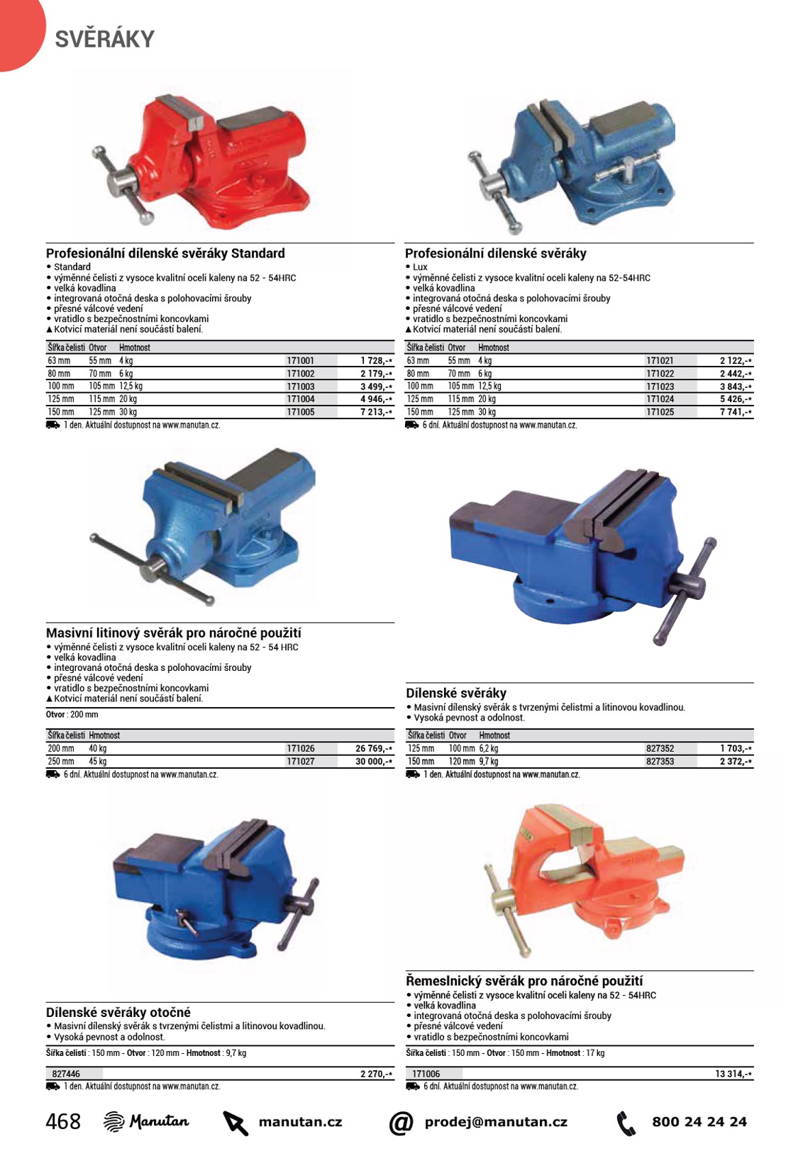 ELEKTRICKÉ NÁŘADÍ Vyvažovače, max. odtah 1,6 - 2 m • Balancéry pro zavěšení nástrojů. • Přebírají hmotnost nástrojů a značně usnadňují zaměstnancům jejich práci. • Snižují únavů zaměstnanců. OO Součástí balení je oko pro montáž balancéru a karabina pro upevnění nástroje. Min. kapacita (hmotnost) Max. kapacita (hmotnost) Dráha 0,5 kg 0,9 kg 1,6 m 0,9 kg 1,8 kg 1,6 m 1,8 kg 2,7 kg 2 m 2,7 kg 3,6 kg 2 m Aktuální dostupnost na www.manutan.cz. 514065 514066 514067 514068 2 859,-* 2 859,-* 5 859,-* 5 859,-* Frézka • určeny do menších zámečnických, opravárenských, údržbářských a podobných provozů pro kusovou nebo malosériovou výrobu • vhodné pro široký rozsah běžných i přesných frézovacích operací • tuhá konstrukce zabezpečuje dostatečnou kvalitu opracování ocelových materiálů, litiny, barevných kovů a dalších • široký rozsah otáček vřetene umožňuje použít stroj i na vrtací a vyvrtávací operace • typ 1 je zvlášť vhodný k provádění jednoduchých frézovacích prací menších součástek Příkon : 350 W - Model : frézky - Hmotnost : 55 kg 021060 Aktuální dostupnost na www.manutan.cz. 23 768,-* Hoblovka s protahem • Hoblovka s protahem k obrábění měkkého i tvrdého dřeva • Napětí 400 V • Příkon 2 000 W • Průměr odsávacího hrdla: 100 mm • Rozměr (d x š x v): 1150 x 530 x 950 mm • Celková hmotnost: 150 kg • Max. šířka hoblování: 250 mm • Max. tříska: 5 mm • Otáčky válce: 4 000 /min. • Počet nožů: 3 ks • Rozměr nože: 250 x 30 x 3 mm Příkon : 2000 W • Průměr nožového válce: 75 mm • Rozměr hoblovacího stolu: 250 x 1050 mm • Náklon pravítka: 0 - 45° • Max. šíře protahu: 250 mm • Max. tloušťka materiálu: 190 mm • Max. tříska: 1 mm • Rychlost protahu: 4 m/min. • Otáčky válce: 4000 /min. • Průměr posuvného válce: 32 mm • Počet nožů: 3 ks • Rozměr stolu: 525 x 250 mm 021299 Aktuální dostupnost na www.manutan.cz. 32 365,-* Vyvažovače, max. odtah 1,6 m • Pružinové navijáky slouží k zavěšení ručního dílenského nářadí a případné fixaci v libovolné výšce. • Nářadí tak máte vždy po ruce, bez nároku na odkládací plochu. • Lze použít také jako závěsné body při montážních pracích. • Zavěšené břemeno se po každém vytažení do libovolné pracovní polohy vrátí zpět do výchozí polohy. • Výchozí polohu lze v rámci délky závěsu nastavit předpětím tahu pružiny. • Vyvažovač má doplňkové bezpečnostní uchycení a izolované uchycení karabinového háku. Min. kapacita (hmotnost) Max. kapacita (hmotnost) Hmotnost 0,4 kg 1 kg 0,6 kg 1 kg 2 kg 0,6 kg 2 kg 3 kg 0,7 kg 1 den. Aktuální dostupnost na www.manutan.cz. 145001 145002 145003 1 285,-* 1 533,-* 1 667,-* * Širší sortiment, aktuální ceny, slevy a termíny dodání najdete na www.manutan.cz. Uvedené ceny jsou bez DPH. 465