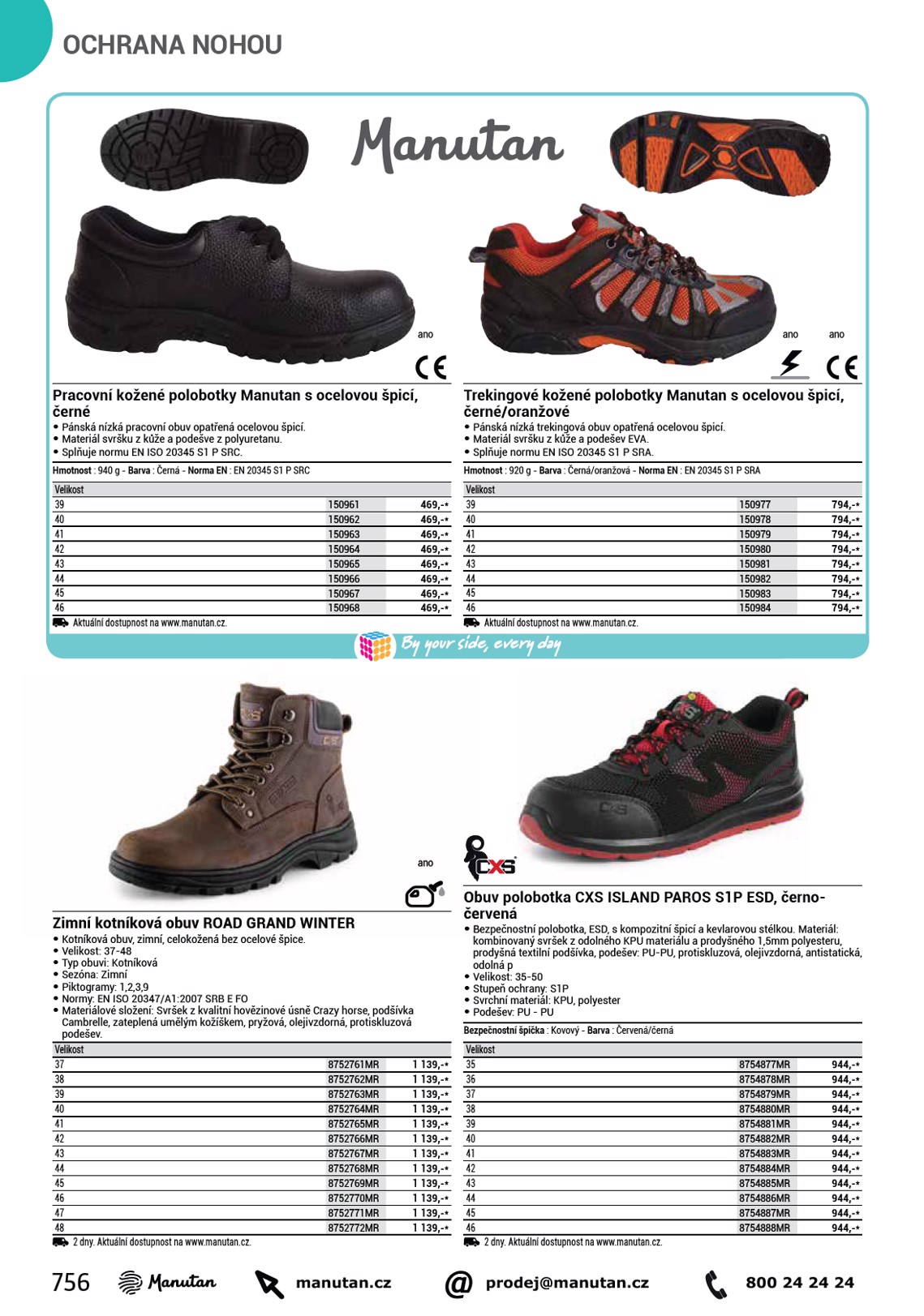 OCHRANA NOHOU ano ano ano Pracovní tenisky Manutan s ocelovou špicí, dámské, černé • Dámské tenisky opatřené ocelovou špicí. • Materiál svršeku ze syntetické kůže a podešve z polyuretanu. • Splňují normu EN ISO 20345 SB SRA. Barva : Černá - Norma EN : EN 20345 SB SRA Velikost 36 37 38 39 40 41 Aktuální dostupnost na www.manutan.cz. 150926 150927 150928 150929 150930 150931 543,-* 543,-* 543,-* 543,-* 543,-* 543,-* Pracovní kožené polobotky CXS Road Belmont, světle hnědé • Pracovní polobotky s protiskluzovou a olejivzdornou podešví. • Svršek z nubukové kůže, podšívka Cambrelle, pryžová podešev. • Splňují normu EN ISO 20347 E FO SRB. Materiál podrážky : pryž - Barva : Světle hnědá - Norma EN : EN 20347 Velikost 38 39 40 41 42 43 44 45 46 47 48 1 den. Aktuální dostupnost na www.manutan.cz. 8751103 8751104 8752638 875184 875185 875186 8752639 875187 875188 8751258 8758021 857,-* 857,-* 857,-* 857,-* 857,-* 857,-* 857,-* 857,-* 857,-* 857,-* 857,-* 200 J ocelová ano planžeta ano 200 J ocelová ano planžeta ano Pracovní kožené polobotky CXS Stone s ocelovou špicí, černé • Kožené pracovní polobotky s ocelovou špicí a planžetou. • Boty jsou opatřeny antistatickou, protiskluzovou a olejivzdornou podešví. Barva : Černá - Norma EN : EN 20347 Velikost 35 36 37 38 39 40 41 42 43 44 45 46 47 48 50 1 den. Aktuální dostupnost na www.manutan.cz. 8752088 8752625 8758016 8758015 8751190 8750750 875169 875170 875171 8752627 875172 875173 8751189 8752164 8380194 408,-* 408,-* 408,-* 408,-* 408,-* 408,-* 408,-* 408,-* 408,-* 408,-* 408,-* 408,-* 408,-* 408,-* 408,-* Zimní pracovní kožené poloholeňové boty CXS Stone s ocelovou špicí, černé • Kožené vysoké boty zateplené umělým kožíškem. • Boty jsou opatřeny ocelovou špicí a antistatickou, protiskluzovou a olejivzdornou podešví. Barva : Černá - Norma EN : EN 20345 Velikost 37 38 39 40 41 42 43 44 45 46 47 48 1 den. Aktuální dostupnost na www.manutan.cz. 8758937 8758938 8758939 8758940 8758941 8758942 8758943 8758944 8758945 8758946 8758947 8758948 587,-* 587,-* 587,-* 587,-* 587,-* 587,-* 587,-* 587,-* 587,-* 587,-* 587,-* 587,-* 758 manutan.cz @ prodej@manutan.cz 800 24 24 24
