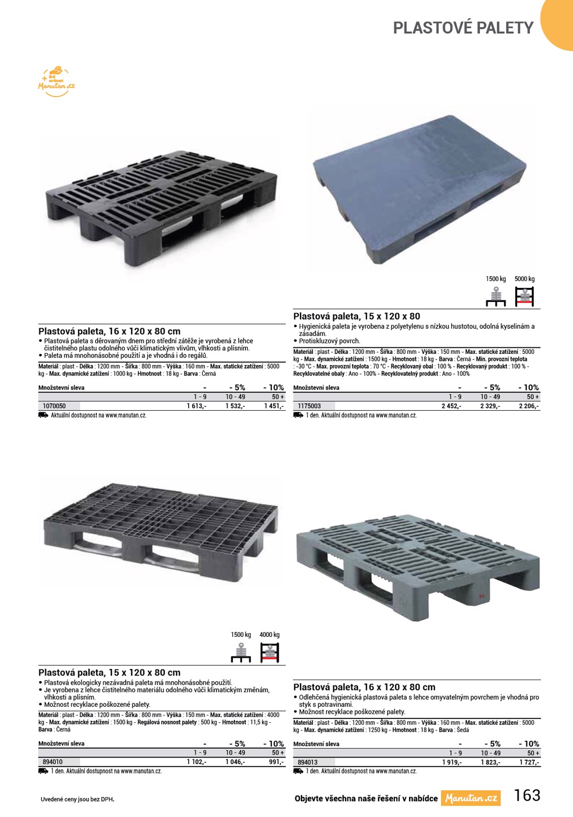 PLASTOVÉ PALETY širší sortiment 1500 kg 5000 kg Plastová paleta, 16 x 120 x 80 cm • Plastová paleta s děrovaným dnem pro střední zátěže je vyrobená z lehce čistitelného plastu odolného vůči klimatickým vlivům, vlhkosti a plísním. • Paleta má mnohonásobné použití a je vhodná i do regálů. Materiál : plast - Délka : 1200 mm - Šířka : 800 mm - Výška : 160 mm - Max. statické zatížení : 5000 kg - Max. dynamické zatížení : 1000 kg - Hmotnost : 18 kg - Barva : Černá Množstevní sleva 1070050 Aktuální dostupnost na www.manutan.cz. - 1 - 9 1 613,- - 5% 10 - 49 1 532,- - 10% 50 + 1 451,- Plastová paleta, 15 x 120 x 80 • Hygienická paleta je vyrobena z polyetylenu s nízkou hustotou, odolná kyselinám a zásadám. • Protiskluzový povrch. Materiál : plast - Délka : 1200 mm - Šířka : 800 mm - Výška : 150 mm - Max. statické zatížení : 5000 kg - Max. dynamické zatížení : 1500 kg - Hmotnost : 18 kg - Barva : Černá - Min. provozní teplota : -30 °C - Max. provozní teplota : 70 °C - Recyklovaný obal : 100 % - Recyklovaný produkt : 100 % - Recyklovatelné obaly : Ano - 100% - Recyklovatelný produkt : Ano - 100% Množstevní sleva 1175003 1 den. Aktuální dostupnost na www.manutan.cz. - 1 - 9 2 452,- - 5% 10 - 49 2 329,- - 10% 50 + 2 206,- 1500 kg 4000 kg Plastová paleta, 15 x 120 x 80 cm • Plastová ekologicky nezávadná paleta má mnohonásobné použití. • Je vyrobena z lehce čistitelného materiálu odolného vůči klimatickým změnám, vlhkosti a plísním. • Možnost recyklace poškozené palety. Materiál : plast - Délka : 1200 mm - Šířka : 800 mm - Výška : 150 mm - Max. statické zatížení : 4000 kg - Max. dynamické zatížení : 1500 kg - Regálová nosnost palety : 500 kg - Hmotnost : 11,5 kg - Barva : Černá Množstevní sleva 894010 1 den. Aktuální dostupnost na www.manutan.cz. - 1 - 9 1 102,- - 5% 10 - 49 1 046,- - 10% 50 + 991,- Plastová paleta, 16 x 120 x 80 cm • Odlehčená hygienická plastová paleta s lehce omyvatelným povrchem je vhodná pro styk s potravinami. • Možnost recyklace poškozené palety. Materiál : plast - Délka : 1200 mm - Šířka : 800 mm - Výška : 160 mm - Max. statické zatížení : 5000 kg - Max. dynamické zatížení : 1250 kg - Hmotnost : 18 kg - Barva : Šedá Množstevní sleva 894013 1 den. Aktuální dostupnost na www.manutan.cz. - 1 - 9 1 919,- - 5% 10 - 49 1 823,- - 10% 50 + 1 727,- 163