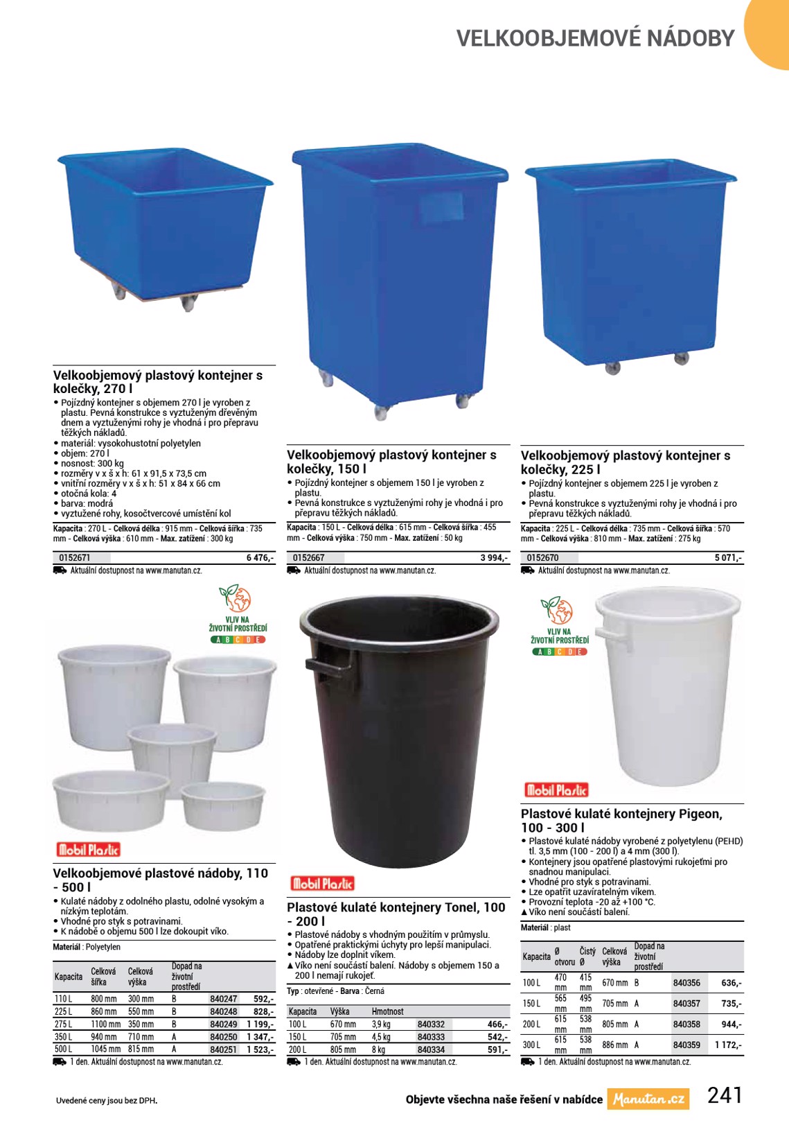 VELKOOBJEMOVÉ NÁDOBY Velkoobjemový plastový kontejner s kolečky, 270 l • Pojízdný kontejner s objemem 270 l je vyroben z plastu. Pevná konstrukce s vyztuženým dřevěným dnem a vyztuženými rohy je vhodná i pro přepravu těžkých nákladů. • materiál: vysokohustotní polyetylen • objem: 270 l • nosnost: 300 kg • rozměry v x š x h: 61 x 91,5 x 73,5 cm • vnitřní rozměry v x š x h: 51 x 84 x 66 cm • otočná kola: 4 • barva: modrá • vyztužené rohy, kosočtvercové umístění kol Kapacita : 270 L - Celková délka : 915 mm - Celková šířka : 735 mm - Celková výška : 610 mm - Max. zatížení : 300 kg 0152671 Aktuální dostupnost na www.manutan.cz. 6 476,- Velkoobjemový plastový kontejner s kolečky, 150 l • Pojízdný kontejner s objemem 150 l je vyroben z plastu. • Pevná konstrukce s vyztuženými rohy je vhodná i pro přepravu těžkých nákladů. Kapacita : 150 L - Celková délka : 615 mm - Celková šířka : 455 mm - Celková výška : 750 mm - Max. zatížení : 50 kg 0152667 Aktuální dostupnost na www.manutan.cz. 3 994,- Velkoobjemový plastový kontejner s kolečky, 225 l • Pojízdný kontejner s objemem 225 l je vyroben z plastu. • Pevná konstrukce s vyztuženými rohy je vhodná i pro přepravu těžkých nákladů. Kapacita : 225 L - Celková délka : 735 mm - Celková šířka : 570 mm - Celková výška : 810 mm - Max. zatížení : 275 kg 0152670 Aktuální dostupnost na www.manutan.cz. 5 071,- Velkoobjemové plastové nádoby, 110 - 500 l • Kulaté nádoby z odolného plastu, odolné vysokým a nízkým teplotám. • Vhodné pro styk s potravinami. • K nádobě o objemu 500 l lze dokoupit víko. Materiál : Polyetylen Kapacita Celková šířka Celková výška Dopad na životní prostředí 110 L 800 mm 300 mm B 840247 225 L 860 mm 550 mm B 840248 275 L 1100 mm 350 mm B 840249 350 L 940 mm 710 mm A 840250 500 L 1045 mm 815 mm A 840251 1 den. Aktuální dostupnost na www.manutan.cz. 592,- 828,- 1 199,- 1 347,- 1 523,- Plastové kulaté kontejnery Tonel, 100 - 200 l • Plastové nádoby s vhodným použitím v průmyslu. • Opatřené praktickými úchyty pro lepší manipulaci. • Nádoby lze doplnit víkem. SS Víko není součástí balení. Nádoby s objemem 150 a 200 l nemají rukojeť. Typ : otevřené - Barva : Černá Kapacita Výška Hmotnost 100 L 670 mm 3,9 kg 840332 150 L 705 mm 4,5 kg 840333 200 L 805 mm 8 kg 840334 1 den. Aktuální dostupnost na www.manutan.cz. 466,- 542,- 591,- Plastové kulaté kontejnery Pigeon, 100 - 300 l • Plastové kulaté nádoby vyrobené z polyetylenu (PEHD) tl. 3,5 mm (100 - 200 l) a 4 mm (300 l). • Kontejnery jsou opatřené plastovými rukojeťmi pro snadnou manipulaci. • Vhodné pro styk s potravinami. • Lze opatřit uzavíratelným víkem. • Provozní teplota -20 až +100 °C. SS Víko není součástí balení. Materiál : plast Ø Čistý Celková Dopad na Kapacita otvoru Ø výška životní prostředí 100 L 470 415 670 mm B mm mm 840356 150 L 565 495 705 mm A mm mm 840357 200 L 615 538 805 mm A mm mm 840358 300 L 615 538 886 mm A mm mm 840359 1 den. Aktuální dostupnost na www.manutan.cz. 636,- 735,- 944,- 1 172,- 241
