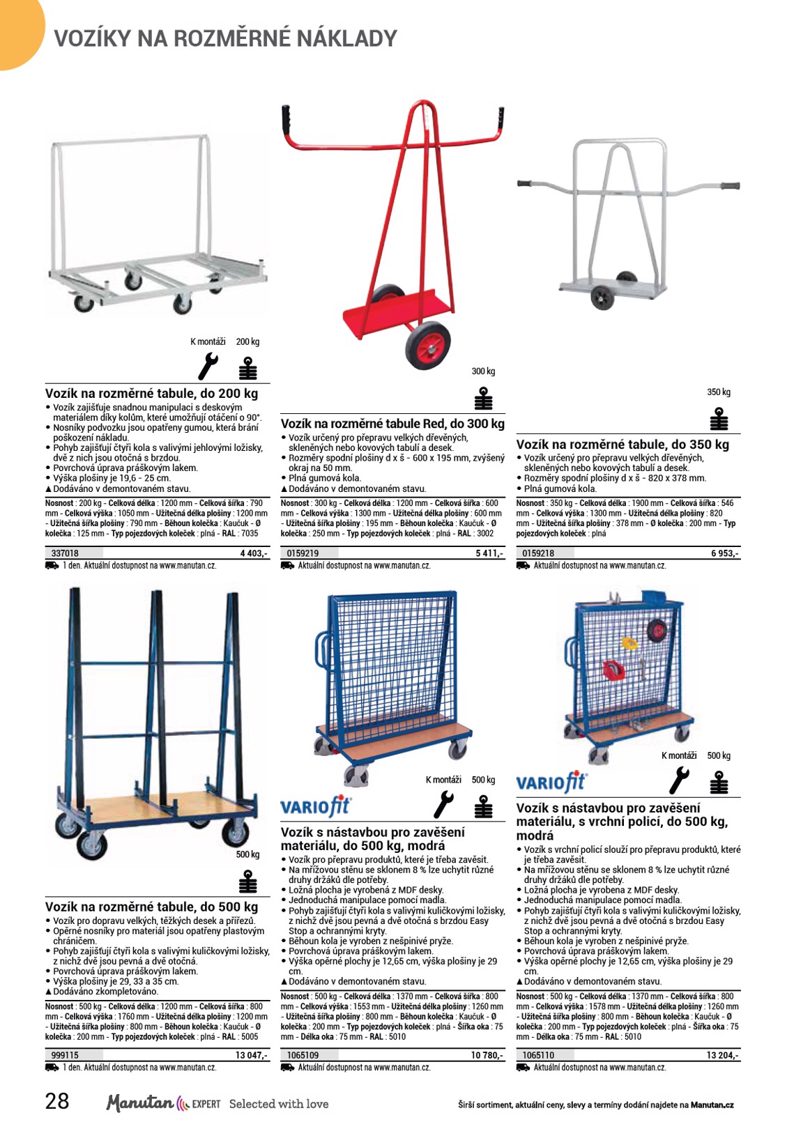 VOZÍKY NA ROZMĚRNÉ NÁKLADY K montáži 200 kg Vozík na rozměrné tabule, do 200 kg • Vozík zajišťuje snadnou manipulaci s deskovým materiálem díky kolům, které umožňují otáčení o 90°. • Nosníky podvozku jsou opatřeny gumou, která brání poškození nákladu. • Pohyb zajišťují čtyři kola s valivými jehlovými ložisky, dvě z nich jsou otočná s brzdou. • Povrchová úprava práškovým lakem. • Výška plošiny je 19,6 - 25 cm. SS Dodáváno v demontovaném stavu. Nosnost : 200 kg - Celková délka : 1200 mm - Celková šířka : 790 mm - Celková výška : 1050 mm - Užitečná délka plošiny : 1200 mm - Užitečná šířka plošiny : 790 mm - Běhoun kolečka : Kaučuk - Ø kolečka : 125 mm - Typ pojezdových koleček : plná - RAL : 7035 337018 1 den. Aktuální dostupnost na www.manutan.cz. 4 403,- 300 kg Vozík na rozměrné tabule Red, do 300 kg • Vozík určený pro přepravu velkých dřevěných, skleněných nebo kovových tabulí a desek. • Rozměry spodní plošiny d x š - 600 x 195 mm, zvýšený okraj na 50 mm. • Plná gumová kola. SS Dodáváno v demontovaném stavu. Nosnost : 300 kg - Celková délka : 1200 mm - Celková šířka : 600 mm - Celková výška : 1300 mm - Užitečná délka plošiny : 600 mm - Užitečná šířka plošiny : 195 mm - Běhoun kolečka : Kaučuk - Ø kolečka : 250 mm - Typ pojezdových koleček : plná - RAL : 3002 0159219 Aktuální dostupnost na www.manutan.cz. 5 411,- 350 kg Vozík na rozměrné tabule, do 350 kg • Vozík určený pro přepravu velkých dřevěných, skleněných nebo kovových tabulí a desek. • Rozměry spodní plošiny d x š - 820 x 378 mm. • Plná gumová kola. Nosnost : 350 kg - Celková délka : 1900 mm - Celková šířka : 546 mm - Celková výška : 1300 mm - Užitečná délka plošiny : 820 mm - Užitečná šířka plošiny : 378 mm - Ø kolečka : 200 mm - Typ pojezdových koleček : plná 0159218 Aktuální dostupnost na www.manutan.cz. 6 953,- K montáži 500 kg K montáži 500 kg 500 kg Vozík na rozměrné tabule, do 500 kg • Vozík pro dopravu velkých, těžkých desek a přířezů. • Opěrné nosníky pro materiál jsou opatřeny plastovým chráničem. • Pohyb zajišťují čtyři kola s valivými kuličkovými ložisky, z nichž dvě jsou pevná a dvě otočná. • Povrchová úprava práškovým lakem. • Výška plošiny je 29, 33 a 35 cm. SS Dodáváno zkompletováno. Nosnost : 500 kg - Celková délka : 1200 mm - Celková šířka : 800 mm - Celková výška : 1760 mm - Užitečná délka plošiny : 1200 mm - Užitečná šířka plošiny : 800 mm - Běhoun kolečka : Kaučuk - Ø kolečka : 200 mm - Typ pojezdových koleček : plná - RAL : 5005 999115 1 den. Aktuální dostupnost na www.manutan.cz. 13 047,- Vozík s nástavbou pro zavěšení materiálu, do 500 kg, modrá • Vozík pro přepravu produktů, které je třeba zavěsit. • Na mřížovou stěnu se sklonem 8 % lze uchytit různé druhy držáků dle potřeby. • Ložná plocha je vyrobená z MDF desky. • Jednoduchá manipulace pomocí madla. • Pohyb zajišťují čtyři kola s valivými kuličkovými ložisky, z nichž dvě jsou pevná a dvě otočná s brzdou Easy Stop a ochrannými kryty. • Běhoun kola je vyroben z nešpinivé pryže. • Povrchová úprava práškovým lakem. • Výška opěrné plochy je 12,65 cm, výška plošiny je 29 cm. SS Dodáváno v demontovaném stavu. Nosnost : 500 kg - Celková délka : 1370 mm - Celková šířka : 800 mm - Celková výška : 1553 mm - Užitečná délka plošiny : 1260 mm - Užitečná šířka plošiny : 800 mm - Běhoun kolečka : Kaučuk - Ø kolečka : 200 mm - Typ pojezdových koleček : plná - Šířka oka : 75 mm - Délka oka : 75 mm - RAL : 5010 1065109 Aktuální dostupnost na www.manutan.cz. 10 780,- Vozík s nástavbou pro zavěšení materiálu, s vrchní policí, do 500 kg, modrá • Vozík s vrchní policí slouží pro přepravu produktů, které je třeba zavěsit. • Na mřížovou stěnu se sklonem 8 % lze uchytit různé druhy držáků dle potřeby. • Ložná plocha je vyrobena z MDF desky. • Jednoduchá manipulace pomocí madla. • Pohyb zajišťují čtyři kola s valivými kuličkovými ložisky, z nichž dvě jsou pevná a dvě otočná s brzdou Easy Stop a ochrannými kryty. • Běhoun kola je vyroben z nešpinivé pryže. • Povrchová úprava práškovým lakem. • Výška opěrné plochy je 12,65 cm, výška plošiny je 29 cm. SS Dodáváno v demontovaném stavu. Nosnost : 500 kg - Celková délka : 1370 mm - Celková šířka : 800 mm - Celková výška : 1578 mm - Užitečná délka plošiny : 1260 mm - Užitečná šířka plošiny : 800 mm - Běhoun kolečka : Kaučuk - Ø kolečka : 200 mm - Typ pojezdových koleček : plná - Šířka oka : 75 mm - Délka oka : 75 mm - RAL : 5010 1065110 Aktuální dostupnost na www.manutan.cz. 13 204,- 28