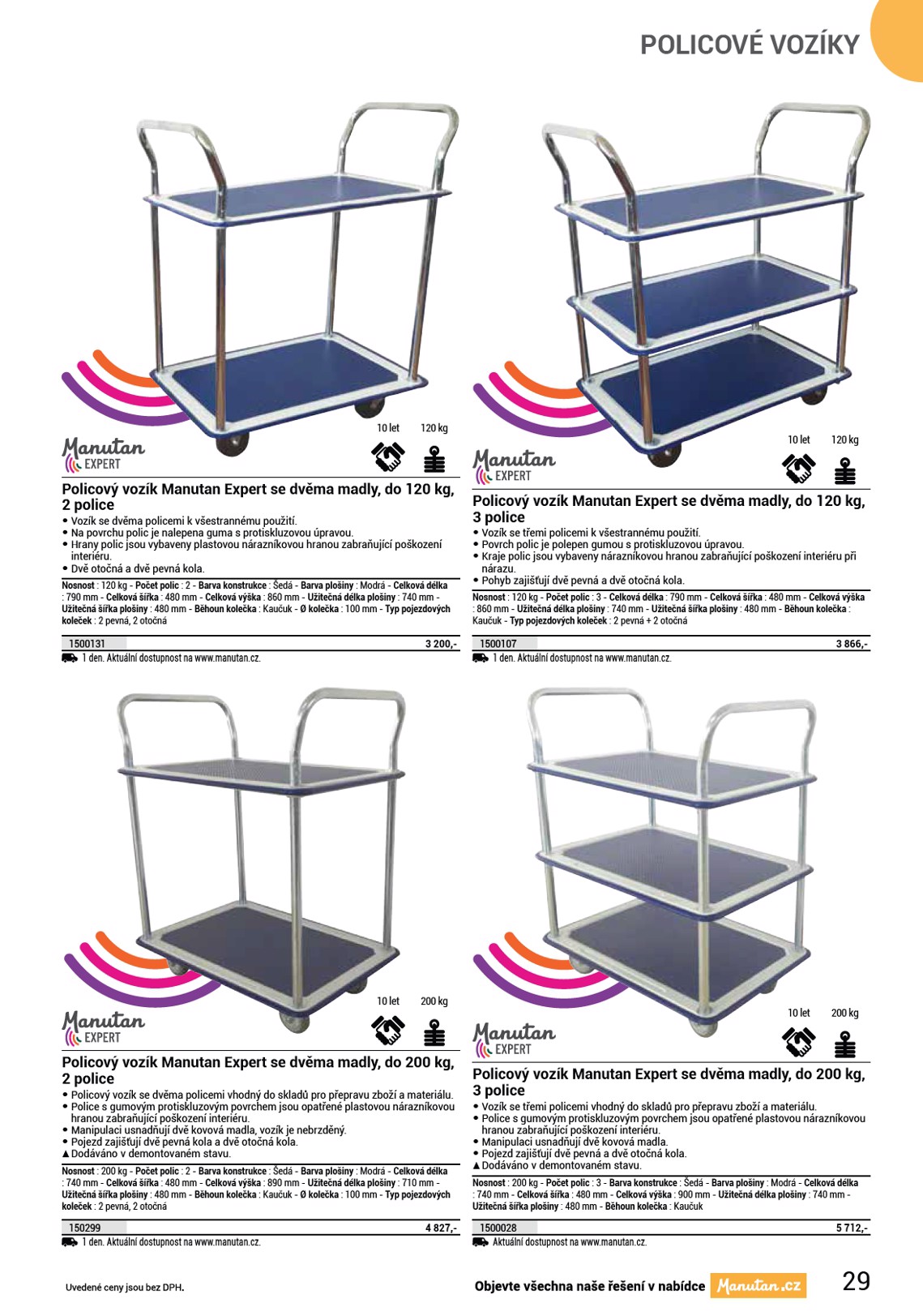 POLICOVÉ VOZÍKY 10 let 120 kg 10 let 120 kg Policový vozík Manutan Expert se dvěma madly, do 120 kg, 2 police • Vozík se dvěma policemi k všestrannému použití. • Na povrchu polic je nalepena guma s protiskluzovou úpravou. • Hrany polic jsou vybaveny plastovou nárazníkovou hranou zabraňující poškození interiéru. • Dvě otočná a dvě pevná kola. Nosnost : 120 kg - Počet polic : 2 - Barva konstrukce : Šedá - Barva plošiny : Modrá - Celková délka : 790 mm - Celková šířka : 480 mm - Celková výška : 860 mm - Užitečná délka plošiny : 740 mm - Užitečná šířka plošiny : 480 mm - Běhoun kolečka : Kaučuk - Ø kolečka : 100 mm - Typ pojezdových koleček : 2 pevná, 2 otočná 1500131 1 den. Aktuální dostupnost na www.manutan.cz. 3 200,- Policový vozík Manutan Expert se dvěma madly, do 120 kg, 3 police • Vozík se třemi policemi k všestrannému použití. • Povrch polic je polepen gumou s protiskluzovou úpravou. • Kraje polic jsou vybaveny nárazníkovou hranou zabraňující poškození interiéru při nárazu. • Pohyb zajišťují dvě pevná a dvě otočná kola. Nosnost : 120 kg - Počet polic : 3 - Celková délka : 790 mm - Celková šířka : 480 mm - Celková výška : 860 mm - Užitečná délka plošiny : 740 mm - Užitečná šířka plošiny : 480 mm - Běhoun kolečka : Kaučuk - Typ pojezdových koleček : 2 pevná + 2 otočná 1500107 1 den. Aktuální dostupnost na www.manutan.cz. 3 866,- 10 let 200 kg 10 let 200 kg Policový vozík Manutan Expert se dvěma madly, do 200 kg, 2 police • Policový vozík se dvěma policemi vhodný do skladů pro přepravu zboží a materiálu. • Police s gumovým protiskluzovým povrchem jsou opatřené plastovou nárazníkovou hranou zabraňující poškození interiéru. • Manipulaci usnadňují dvě kovová madla, vozík je nebrzděný. • Pojezd zajišťují dvě pevná kola a dvě otočná kola. SS Dodáváno v demontovaném stavu. Nosnost : 200 kg - Počet polic : 2 - Barva konstrukce : Šedá - Barva plošiny : Modrá - Celková délka : 740 mm - Celková šířka : 480 mm - Celková výška : 890 mm - Užitečná délka plošiny : 710 mm - Užitečná šířka plošiny : 480 mm - Běhoun kolečka : Kaučuk - Ø kolečka : 100 mm - Typ pojezdových koleček : 2 pevná, 2 otočná 150299 1 den. Aktuální dostupnost na www.manutan.cz. 4 827,- Policový vozík Manutan Expert se dvěma madly, do 200 kg, 3 police • Vozík se třemi policemi vhodný do skladů pro přepravu zboží a materiálu. • Police s gumovým protiskluzovým povrchem jsou opatřené plastovou nárazníkovou hranou zabraňující poškození interiéru. • Manipulaci usnadňují dvě kovová madla. • Pojezd zajišťují dvě pevná a dvě otočná kola. SS Dodáváno v demontovaném stavu. Nosnost : 200 kg - Počet polic : 3 - Barva konstrukce : Šedá - Barva plošiny : Modrá - Celková délka : 740 mm - Celková šířka : 480 mm - Celková výška : 900 mm - Užitečná délka plošiny : 740 mm - Užitečná šířka plošiny : 480 mm - Běhoun kolečka : Kaučuk 1500028 Aktuální dostupnost na www.manutan.cz. 5 712,- 29