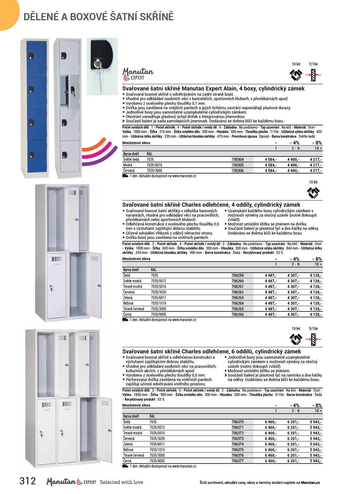 DĚLENÉ A BOXOVÉ ŠATNÍ SKŘÍNĚ 10 let Svařované šatní skříně Sam, 4 oddíly, cylindrický zámek • Svařované boxové šatní skříňky v několika barevných variantách, vhodné pro odkládání věcí na pracovištích, převlékárnách nebo sportovních klubech. • Účinné odvádění vlhkosti z oděvů větracími otvory. • Dvířka boxů jsou zavěšena na vnitřních pantech. • Uzamykání každého boxu cylindrickým zámkem s možností výměny za otočný uzávěr (nutné dokoupit zvlášť). • Možnost umístění štítku se jménem na dvířka. OO Součástí balení je police, tyč na ramínka a dva plastové háčky. Dodáváno se dvěma klíči ke každému boxu. Počet svislých dílů : 2 - Počet skříněk : 4 - Počet skříněk / svislý díl : 2 - Základna : Na podstavci - Typ uzavírání : Na klíč - Materiál : Ocel - Výška : 1800 mm - Šířka : 600 mm - Šířka svislého dílu : 300 mm - Hloubka : 500 mm - Užitečná výška skříňky : 845 mm - Užitečná šířka skříňky : 295 mm - Užitečná hloubka skříňky : 470 mm - Barva konstrukce : Šedá Množstevní sleva Barva dveří RAL Šedá 7035 Modrá 7035/5015 Červená 7035/3000 1 den. Aktuální dostupnost na www.manutan.cz. 276125 276126 276127 - 1 5 170,- 5 170,- 5 170,- - 4% 2 - 9 4 962,- 4 962,- 4 962,- - 8% 10 + 4 756,- 4 756,- 4 756,- 10 let Svařované šatní skříně Luis, 6 oddílů, cylindrický zámek • Svařované boxové šatní skříňky v několika barevných variantách, vhodné pro odkládání věcí na pracovištích, převlékárnách nebo sportovních klubech. • Účinné odvádění vlhkosti z oděvů větracími otvory. • Dvířka boxů jsou zavěšena na vnitřních pantech. • Uzamykání každého boxu cylindrickým zámkem s možností výměny za otočný uzávěr (nutné dokoupit zvlášť). • Možnost umístění štítku se jménem na dvířka. OO Součástí balení je police, tyč na ramínka a dva plastové háčky. Dodáváno se dvěma klíči ke každému boxu. Počet svislých dílů : 3 - Počet skříněk : 6 - Počet skříněk / svislý díl : 2 - Základna : Na podstavci - Typ uzavírání : Na klíč - Materiál : Ocel - Výška : 1800 mm - Šířka : 900 mm - Šířka svislého dílu : 300 mm - Hloubka : 500 mm - Užitečná výška skříňky : 845 mm - Užitečná šířka skříňky : 295 mm - Užitečná hloubka skříňky : 470 mm - Barva konstrukce : Šedá Množstevní sleva Barva dveří RAL Šedá 7035 Modrá 7035/5015 1 den. Aktuální dostupnost na www.manutan.cz. 276440 276448 - 1 8 473,- 8 473,- - 4% 2 - 9 8 134,- 8 134,- - 8% 10 + 7 795,- 7 795,- 10 let 5/10e Svařované šatní skříně Eric odlehčené, 8 boxů, cylindrický zámek • Svařované boxové skříně s odlehčenou konstrukcí a výztuhami zajišťujícími dobrou stabilitu. • Vhodné pro odkládání osobních věcí na pracovištích, kulturních akcích, v převlékárnách apod. • Vyrobeno z ocelového plechu tloušťky 0,5 mm. • Perforovaná dvířka zavěšená na vnitřních pantech zajišťují účinné odvětrávání vnitřního prostoru. • Jednotlivé boxy jsou samostatně uzamykatelné cylindrickým zámkem s možností výměny za otočný uzávěr (nutno dokoupit zvlášť). • Možnost umístění štítku se jménem. Počet svislých dílů : 2 - Počet skříněk : 8 - Počet skříněk / svislý díl : 4 - Základna : Na nohách - Typ uzavírání : Na klíč - Materiál : Ocel - Výška : 1940 mm - Šířka : 600 mm - Šířka svislého dílu : 300 mm - Hloubka : 500 mm - Tloušťka plechu : 5/10e - Užitečná výška skříňky : 408 mm - Užitečná šířka skříňky : 249 mm - Užitečná hloubka skříňky : 490 mm - Barva konstrukce : Šedá - Recyklovaný produkt : 53 % Množstevní sleva - - 4% - 8% 1 2 - 9 10 + Barva dveří RAL Šedá 7035 706540 6 169,- 5 921,- 5 675,- Světle modrá 7035/5012 706541 6 169,- 5 921,- 5 675,- Aktuální dostupnost na www.manutan.cz. 313