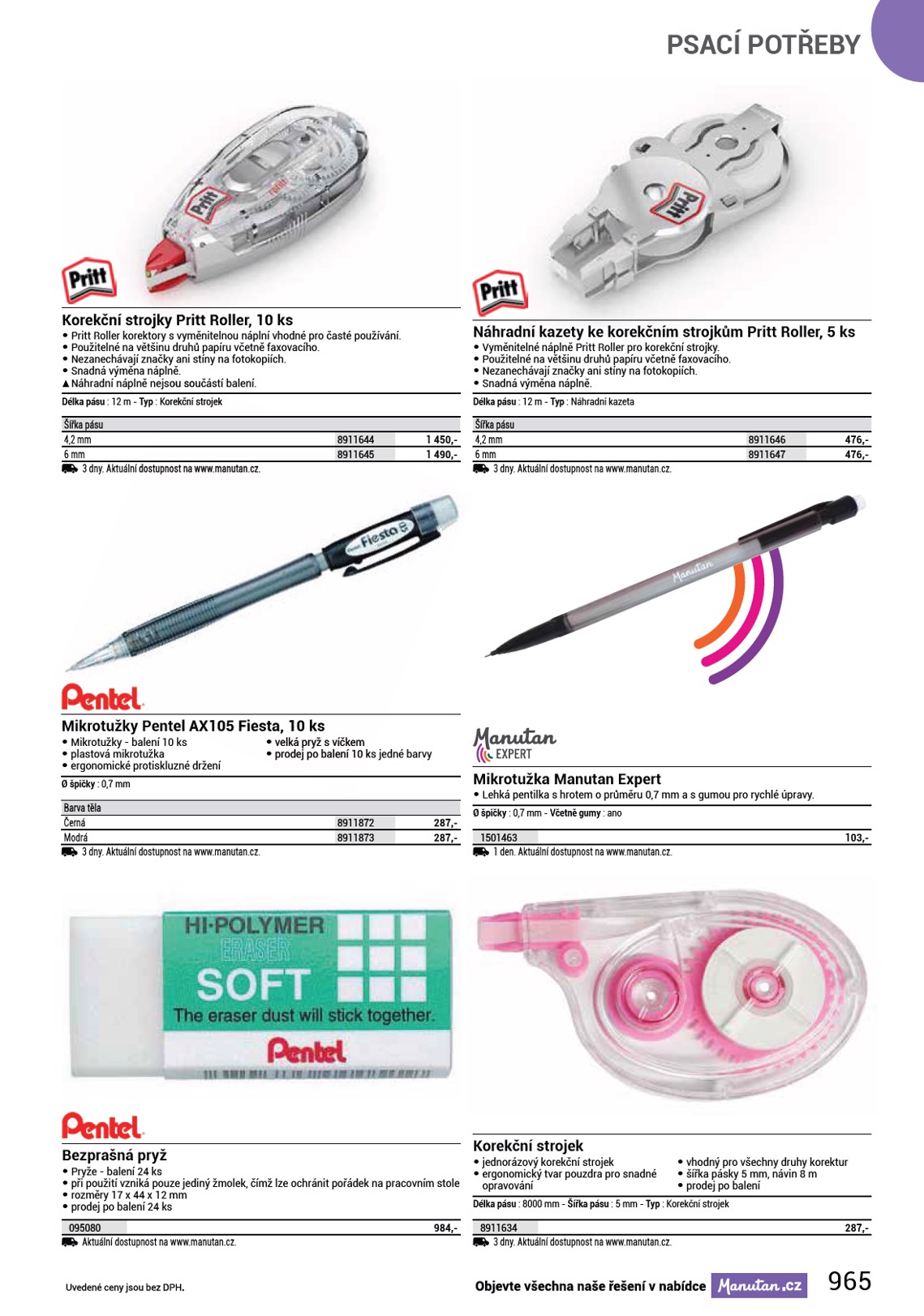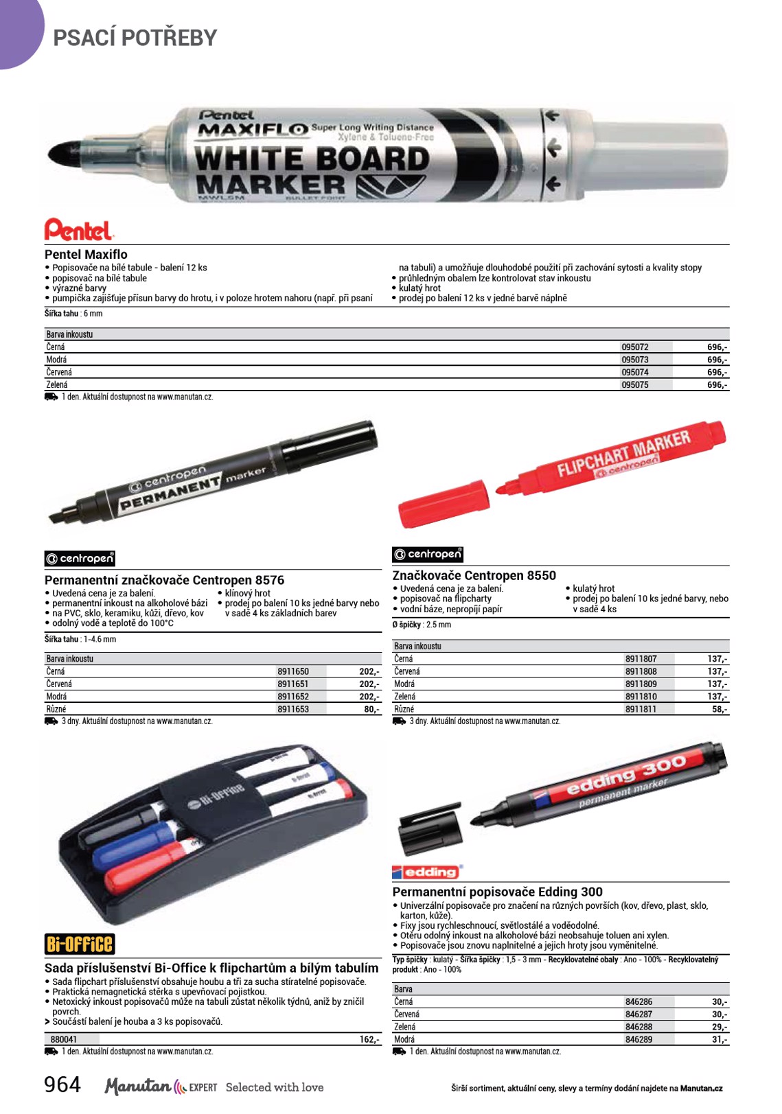 PSACÍ POTŘEBY Fixové popisovače micro • Popisovač s nesmyvatelnou barvou • perfektní přilnavost pro popisování prakticky všech typů čistých materiálů • barva s velmi slabým zápachem a bez obsahu škodlivých rozpouštědel je neprůhledná a dokonale viditelná i na Ø špičky : 0.8 mm tmavých podkladových plochách • barva je odolná proti vodě a UV záření • teplota použití: -20 °C / +50 °C • průměr hrotu: 0,8 mm • balení 12 ks Barva inkoustu Bílá Žlutá Černá Červená 1 den. Aktuální dostupnost na www.manutan.cz. 287060 287061 287062 287063 103,- 103,- 103,- 103,- Popisovač dlaždiček Edding 8200 • Bílý popisovač pro renovaci zašedlých spár v koupelně či v kuchyni. • Vysoce krycí a voděodolný inkoust je světlostálý a otěru odolný. • Inkoust se snadno nanáší, rychle zasychá a odolá vůči rozmazání. • Popisovač je opatřen ventilovým systémem, a proto je před prvním použitím potřeba popisovač protřepat a lehkým pumpováním umožnit inkoustu stéci do hrotu. OO Balení obsahuje bílý popisovač a tři náhradní hroty. Barva inkoustu : Bílá - Min. šířka tahu : 2 mm - Max. šířka tahu : 4 mm - Recyklovatelné obaly : Ano - 100% - Recyklovatelný produkt : Ano - 100% 846227 5 dní. Aktuální dostupnost na www.manutan.cz. 1 331,- Mazatelné popisovače Manutan Expert, 10 ks • Mazatelné popisovače s kuželovým hrotem. • Barva víčka v barvě inkoustu. OO Balení obsahuje 10 ks popisovačů. Ø špičky : 3 mm Barva inkoustu Balení Černá 10 ks Zelená 10 ks 1 den. Aktuální dostupnost na www.manutan.cz. 1501455 1501457 158,- 141,- Fixový popisovač • perfektní přilnavost na všechny hladké povrchy: sklo, kovy, guma, kůže, látka, karton, PVC atd. • barva je netransparentní, rychleschnoucí, nesmazatelná a Ø špičky : 4 mm netoxická, odpovídá evropské normě EN 71/3 bez přísad toulenu a xylenu • průměr hrotu: 4 mm • objem: 12 ml Barva inkoustu Bílá Žlutá Modrá Červená 1 den. Aktuální dostupnost na www.manutan.cz. 287056 99,- 287057 99,- 287058 99,- 287059 99,- Ultrafialový popisovač Edding 8280, 10 ks • UV popisovač s kulatým hrotem jehož stopa je viditlená pouze pod ultrafialovým světlem. • Označovat lze téměř všechny druhy materiálů. • Využitelné všude tam, kde je z bezpečnostních důvodů potřeba označovat nejrůznější předměty neviditelnými značkami např. umělecká díla, bankovky, certifikáty atp. • Tělo popisovače je z hliníku, který je odolnější než plast. Šířka tahu : 1.5-3 mm - Min. šířka tahu : 1,5 mm - Max. šířka tahu : 3 mm - Recyklovatelné obaly : Ano - 100% - Recyklovatelný produkt : Ano - 100% 846228 1 den. Aktuální dostupnost na www.manutan.cz. 1 062,- Popisovač pro tesaře Edding 8850, 10 ks • Permanentní popisovač s dlouhým tenkým hrotem pro značení v těžko dostupných místech (např. při vrtání). • Vhodné pro většinu materiálů (sklo, dřevo, kov, plast, kámen, karton). • Inkoust rychle zasychá, je vodě a otěru odolný. • Tenký hrot v kovové objímce pro precizní značení. • Praktický pomocník pro všechny údržbáře, montéry a domácí kutily. Barva inkoustu : Černá - Min. šířka tahu : 0,7 mm - Max. šířka tahu : 1 mm - Recyklovatelné obaly : Ano - 100% - Recyklovatelný produkt : Ano - 100% 846229 1 den. Aktuální dostupnost na www.manutan.cz. 816,- 966