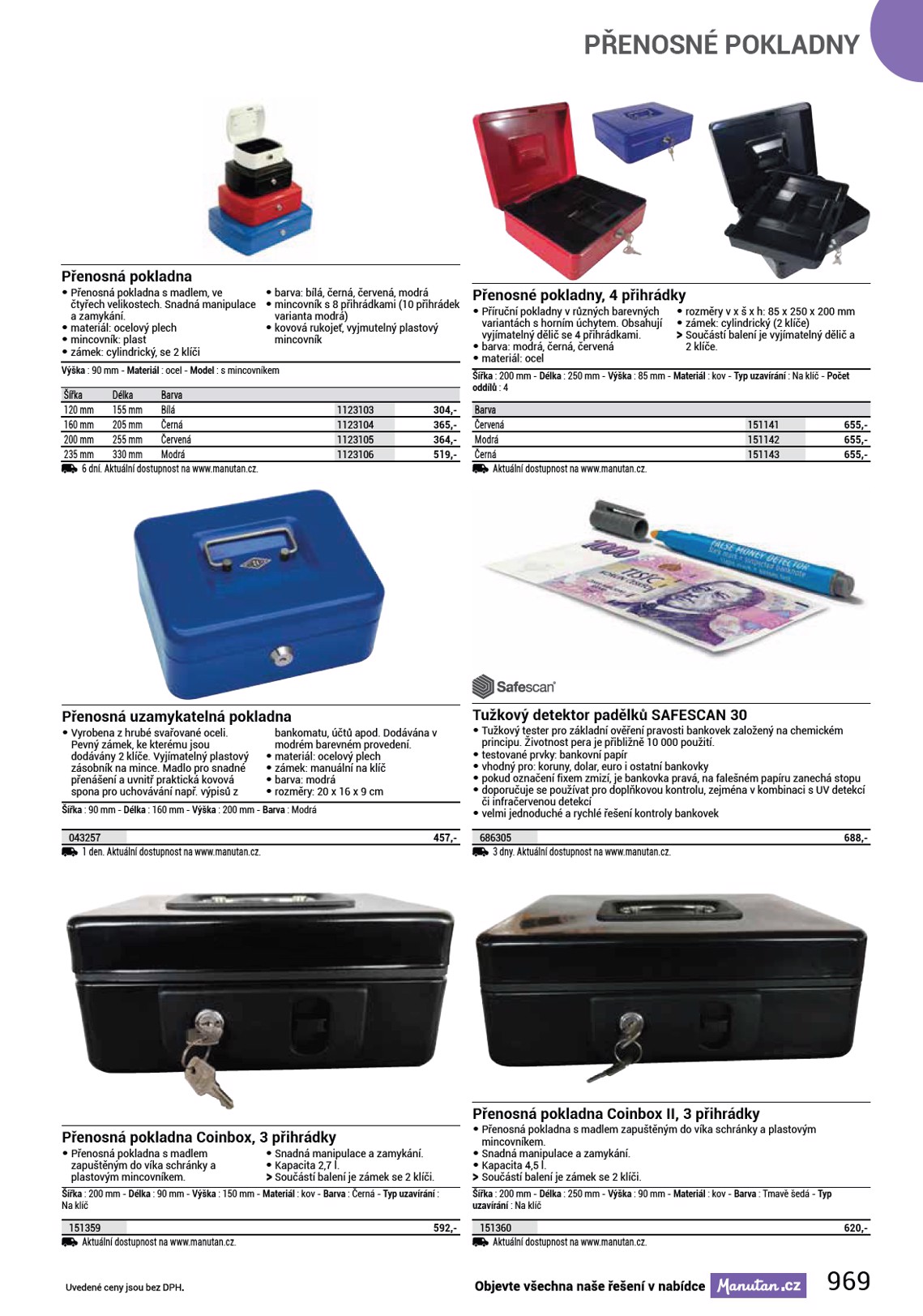 POČÍTAČKY BANKOVEK A MINCÍ Přenosná počítačka bankovek SAFESCAN 2000 • Přenosná počítačka bankovek AB230 vhodná nejen pro všechny měny a typy bankovek, ale také pro stravenky apod. • Dodávána včetně koženkového pouzdra k uchycení za opasek. Šířka : 75 mm - Délka : 102 mm - Výška : 190 mm - Barva : Bílá 686304 3 dny. Aktuální dostupnost na www.manutan.cz. 4 059,- Kapesní UV lampa s LED diodou SAFESCAN 40H • Kapesní svítilna s ultrafialovou zářivkou 4 W vhodná pro předběžnou kontrolu UV symbolů na bankovkách, pro práci v terénu či laboratoři. • Boční dioda slouží ke kontrole vodoznaku. 686312 3 dny. Aktuální dostupnost na www.manutan.cz. 562,- Přenosná počítačka bankovek SAFESCAN 2210-3 • Přenosná počítačka bankovek AB300 s dobíjecím akumulátorem a detektorem pravosti vhodná nejen pro všechny měny a typy bankovek, ale také pro stravenky apod. • Počítačka má také kontrolu šířky bankovek. • Dodávána včetně černé koženkové brašny přes rameno. Šířka : 292 mm - Délka : 246 mm - Výška : 178 mm - Barva : Bílá 686340 3 dny. Aktuální dostupnost na www.manutan.cz. 7 399,- Počítačka a třídička CZK mincí Safescan 1250 • Počítačka a třídička mincí pro CZK počítá a současně třídí mince. • Mince lze počítat volitelně ve dvou módech - počítání mincí nebo počítání hodnoty. Šířka : 330 mm - Délka : 355 mm - Výška : 266 mm - Barva : Bílá 686360 Aktuální dostupnost na www.manutan.cz. 6 274,- 970