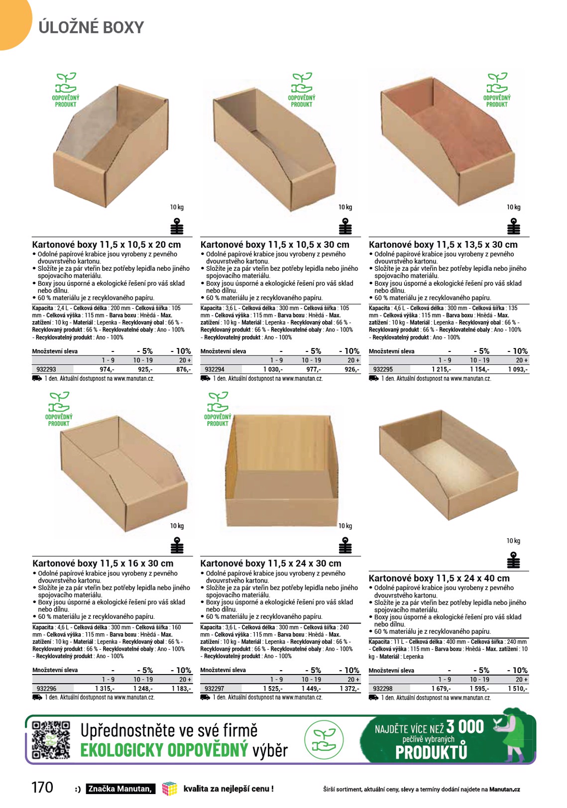 ÚLOŽNÉ BOXY širší sortiment širší sortiment 0,4 kg 2 kg Plastové boxy Ecobox mini 5 x 9 x 11 cm • Plastové boxy řady ECOBOX MINI jsou ideální ke skladování materiálu např. v dílnách či obchodech. • Jsou klasicky stohovatelné a rovněž je lze uchytit na stěnu pomocí speciální lišty a nebo perfopanelu. • Jsou opatřeny držákem etiket a jsou dodávány v pěti barevných variantách. SS Perfopanel a lišta nejsou součástí dodávky. Kapacita : 0,14 L - Celková délka : 90 mm - Celková šířka : 110 mm - Celková výška : 50 mm - Max. zatížení : 0,4 kg - Materiál : Polypropylen - Hmotnost : 0,03 kg Množstevní sleva Barva boxu Černá Červená Modrá Zelená Žlutá 1 den. Aktuální dostupnost na www.manutan.cz. 1179164 1179165 1179166 1179167 1179168 - 1 - 40 19,- 21,- 21,- 21,- 20,- - 13% 41 + 16,- 19,- 19,- 19,- 18,- Plastové boxy Ecobox small 7,5 x 11 x 16,5 cm • Plastové boxy řady ECOBOX jsou ideální ke skladování materiálu např. v dílnách či obchodech. • Jsou klasicky stohovatelné a rovněž je lze uchytit na stěnu pomocí speciální lišty a nebo perfopanelu. • Jsou opatřeny držákem etiket a jsou dodávány v pěti barevných variantách. SS Perfopanel a lišta nejsou součástí dodávky. Kapacita : 0,5 L - Celková délka : 165 mm - Celková šířka : 110 mm - Celková výška : 75 mm - Max. zatížení : 2 kg - Materiál : Polypropylen - Hmotnost : 0,08 kg Množstevní sleva Barva boxu Černá Červená Modrá Zelená Žlutá 1 den. Aktuální dostupnost na www.manutan.cz. 1179169 1179170 1179171 1179172 1179173 - 1 - 34 30,- 33,- 33,- 33,- 33,- - 12% 35 + 26,- 30,- 30,- 30,- 30,- širší sortiment širší sortiment 9 kg 15,5 kg Plastové boxy Ecobox medium 12,5 x 15,5 x 24 cm • Plastové boxy řady ECOBOX MEDIUM jsou ideální ke skladování materiálu např. v dílnách či obchodech. • Jsou klasicky stohovatelné a rovněž je lze uchytit na stěnu pomocí speciální lišty a nebo perfopanelu. • Jsou opatřeny držákem etiket a jsou dodávány v pěti barevných variantách. SS Perfopanel a lišta nejsou součástí dodávky. Kapacita : 1,78 L - Celková délka : 240 mm - Celková šířka : 155 mm - Celková výška : 125 mm - Max. zatížení : 9 kg - Materiál : Polypropylen - Hmotnost : 0,19 kg Množstevní sleva Barva boxu Černá Červená Modrá Zelená Žlutá 1 den. Aktuální dostupnost na www.manutan.cz. 1179174 1179175 1179176 1179177 1179178 - 1 - 34 70,- 88,- 88,- 88,- 87,- - 10% 35 + 63,- 78,- 78,- 78,- 77,- Plastové boxy Ecobox large 16,5 x 22 x 35 cm • Plastové boxy řady ECOBOX LARGE jsou ideální ke skladování materiálu např. v dílnách či obchodech. • Jsou klasicky stohovatelné a rovněž je lze uchytit na stěnu pomocí speciální lišty a nebo perfopanelu. • Jsou opatřeny držákem etiket a jsou dodávány v pěti barevných variantách. SS Perfopanel a lišta nejsou součástí dodávky. Kapacita : 4,8 L - Celková délka : 350 mm - Celková šířka : 220 mm - Celková výška : 165 mm - Max. zatížení : 15,5 kg - Materiál : Polypropylen - Hmotnost : 0,43 kg Množstevní sleva Barva boxu Černá Červená Modrá Zelená Žlutá 1 den. Aktuální dostupnost na www.manutan.cz. 1179179 1179180 1179181 1179182 1179183 - 1 - 9 178,- 186,- 186,- 186,- 186,- - 10% 10 + 160,- 167,- 167,- 167,- 167,- 174