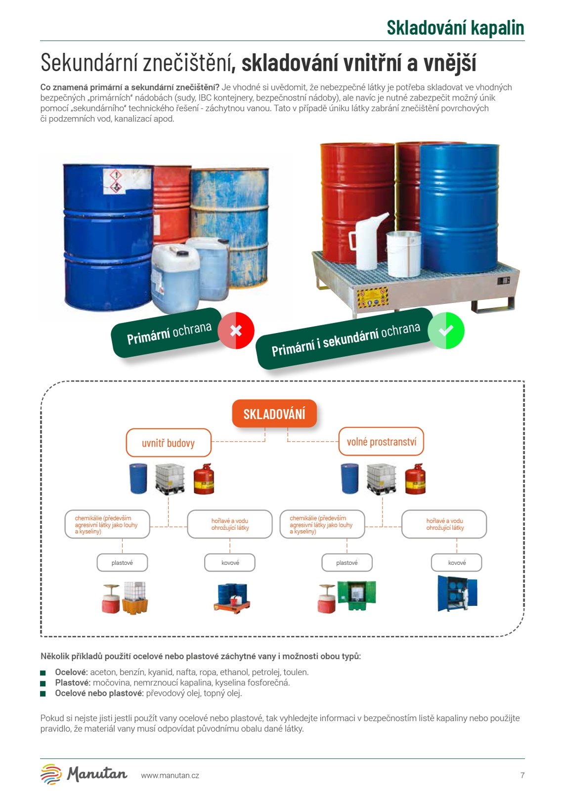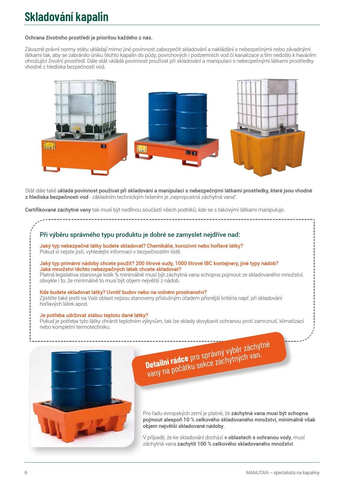 strana 6 - 66 6 - 7 8 - 9 10 - 12 13 14 - 15 16 17 18 - 21 20 22 - 23 24 - 25 26 - 31 32 - 33 34 - 36 37 38 39 - 42 43 44 - 45 46 - 47 48 - 49 50 - 53 54 - 59 60 - 61 62 63 64 - 65 66 70 - 89 70 71 - 72 73 74 - 75 76 77 78 - 79 80 81 - 82 83 - 87 88 - 89 92 - 113 92 - 94 95 - 97 98 - 100 101 - 103 104 105 - 106 107 108 109 110 - 111 112 - 113 116 - 152 116 - 117 118 119 - 120 121 - 122 123 - 124 125 - 126 127 128 129 130 - 133 134 - 144 145 - 146 148 149 150 151 152 ZÁCHYTNÉ VANY A KONTEJNERY Úvod do skladování kapalin Ocelové bezpečnostní nádoby Ocelové i polyetylénové bezpečnostní nádoby Kanystry, ochranné obaly na sudy Návod jak si vybrat vhodnou záchytnou vanu Doporučení k záchytným vanám Malé kovové záchytné vany Kovové záchytné vany Stojany na sudy Kovové sudy a manipulace s nimi Mobilní záchytné vany Kovové záchytné vany pod IBC kontejnery Malé plastové záchytné vany Plastové záchytné vany Plastové sudy a barely Polyetylenové nástavce na sudy Plastové záchytné vany pod IBC kontejnery Systém krytí záchytných van Skládací záchytné vany Ocelové záchytné podlahy Plastové záchytné podlahy Plastové depoty na nebezpečné látky Kovové depoty na nebezpečné látky Kontejnery na nebezpečné látky Kontejnery na zářivky Nádrže na použitý olej Řešení mobilního výdeje nafty Venkovní sklady na nebezpečné látky REGÁLY NA NEBEZPEČNÉ LÁTKY Paletové regály s pletivem Policové regály s pletivem Regály se záchytnými policemi Regály na sudy se záchytnými vanami Kontejnery na plynové láhve Kontejnery paletové Regály na IBC Regály na malé nádoby Regály na sudy Kontejnery na plynové láhve Manipulace s plynovými lahvemi SORBENTY Použití a likvidace průmyslových sorbentů Sorbenty univerzální Sorbenty olejové Sorbenty chemické Proč používat sypké sorbenty Sorpční granuláty Sorpční soupravy univerzální Sorpční soupravy olejové Sorpční soupravy chemické Zábrany proti znečištění Sorbenty - chemická kompatibilita SKŘÍNĚ NA NEBEZPEČNÉ LÁTKY Proč a jak je používat Přehled skříní Skříně na chemikálie BASIC Skříně na nehořlavé chemikálie a toxické látky Bezpečnostní skříně na chemikálie a jedy Bezpečnostní skříně pro fytosanitární látky Skříně na žíravé a toxické látky Skříně na chemikálie kombinované Skříně na hořlavé i agresivní látky Skříně pro agresivní látky Protipožární skříně na hořlaviny, chemikálie Protipožární skříně na hořlaviny s recirkulací Bezpečnostní skříně pro radioaktivní materiál Vertikální protipožární skříně Skříně pro sudy Bezpečnostní skříně na plynové láhve Skříně pro lithium-iontové baterie www.manutan.cz Obsah MANUTAN – specialista na kapaliny