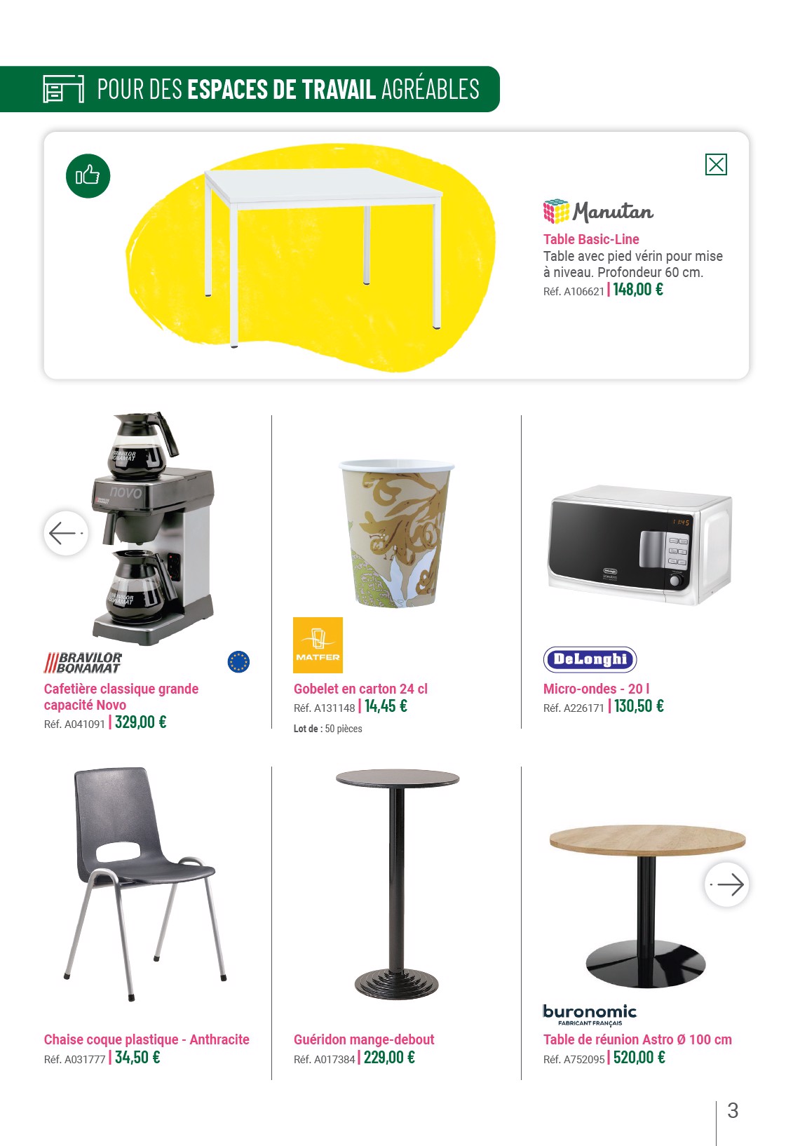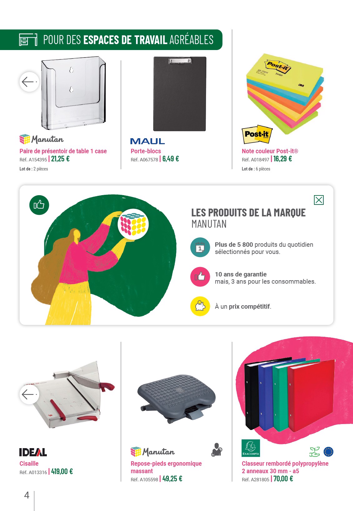POUR DES ESPACES DE TRAVAIL AGRÉABLES Paire de présentoir de table 1 case Réf. A154395 | 21,25 € Lot de : 2 pièces Porte-blocs Réf. A067578 | 6,49 € Note couleur Post-it® Réf. A018497 | 16,29 € Lot de : 6 pièces LES PRODUITS DE LA MARQUE MANUTAN Plus de 5 800 produits du quotidien sélectionnés pour vous. 10 ans de garantie mais, 3 ans pour les consommables. À un prix compétitif . Cisaille Réf. A013316 | 419,00 € 4 Repose-pieds ergonomique massant Réf. A105598 | 49,25 € Classeur rembordé polypropylène 2 anneaux 30 mm - a5 Réf. A281805 | 70,00 €
