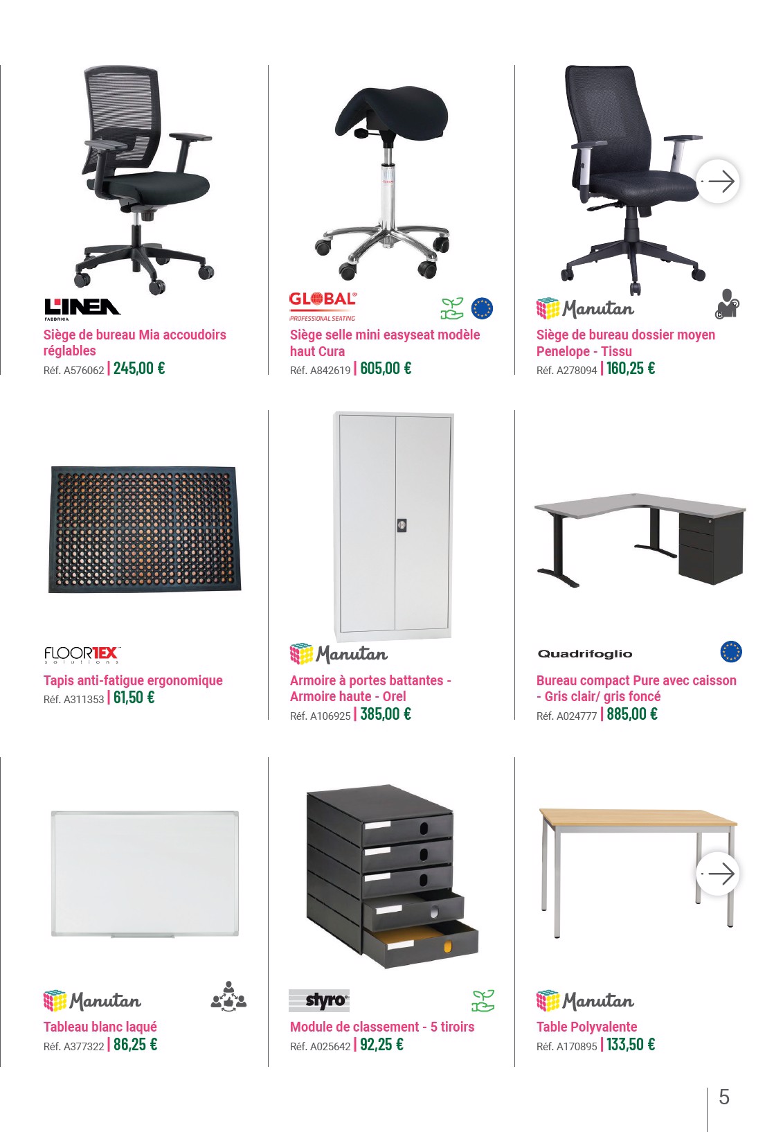 Siège de bureau Mia accoudoirs réglables Réf. A576062 | 245,00 € Siège selle mini easyseat modèle haut Cura Réf. A842619 | 605,00 € Siège de bureau dossier moyen Penelope - Tissu Réf. A278094 | 160,25 € Tapis anti-fatigue ergonomique Réf. A311353 | 61,50 € Armoire à portes battantes - Armoire haute - Orel Réf. A106925 | 385,00 € Bureau compact Pure avec caisson - Gris clair/ gris foncé Réf. A024777 | 885,00 € Tableau blanc laqué Réf. A377322 | 86,25 € Module de classement - 5 tiroirs Réf. A025642 | 92,25 € Table Polyvalente Réf. A170895 | 133,50 € 5