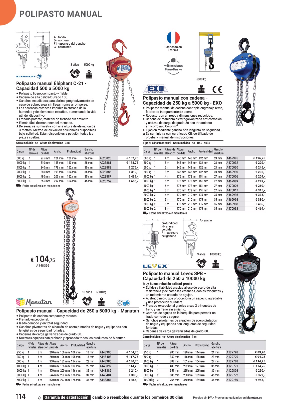 POLIPASTO MANUAL A - fondo D - anchura F1 - apertura del gancho G - altura mín. 3 años 5000 kg Polipasto manual Éléphant C-21 - Capacidad 500 a 5000 kg • Polipasto ligero, compacto y fiable. • Cadena de alta calidad: Grado 100. • Ganchos estudiados para abrirse progresivamente en caso de sobrecarga, sin llegar nunca a romperse. • Las carcasas estancas impiden la entrada de la humedad y de elementos extraños, aumentando la vida útil del dispositivo. • Frenado potente, material de frenado sin amianto. • El más fácil de mantener del mercado. SS De serie, se suministra con una altura de elevación de 3 metros. Metros de elevación adicionales disponibles bajo solicitud. Están disponibles a petición todas las piezas sueltas. Carro incluido : no - Altura de elevación : 3 m Carga Nº de Altura ramales perdida Ancho 500 kg 1 275 mm 121 mm 1000 kg 1 310 mm 148 mm 1500 kg 1 340 mm 178 mm 2000 kg 1 380 mm 193 mm 3000 kg 2 480 mm 209 mm 5000 kg 3 555 mm 297 mm Fecha actualizada en manutan.es Profundidad 129 mm 143 mm 152 mm 164 mm 152 mm 164 mm Gancho abertura 24 mm 28 mm 30 mm 36 mm 35 mm 45 mm A023826 A023881 A023883 A023885 A023887 A023752 Fabricado en Francia 5000 kg € 157,75 € 178,75 € 275,- € 319,- € 439,- € 635,- Polipasto manual con cadena - Capacidad de 250 kg a 5000 kg - EXO • Polipasto manual de cadena con triple engranaje recto, fabricado íntegramente de acero. • Robusto, con un peso y dimensiones reducidos. • Cadena de maniobra electrogalvanizada anticorrosión y cadena de carga de grado 80 con tratamiento anticorrosivo Corolim™ • Fijación mediante gancho con lengüeta de seguridad. SS Se suministra con certificado CE, certificado de prueba y manual de instrucciones. Tipo : Polipasto manual - Carro incluido : no - RAL : 5005 Carga Nº de Altura de Altura Ancho Profundidad Gancho ramales elevación perdida abertura 500 kg 1 4 m 345 mm 148 mm 132 mm 23 mm 500 kg 1 5 m 345 mm 148 mm 132 mm 23 mm 500 kg 1 6 m 345 mm 148 mm 132 mm 23 mm 500 kg 1 8 m 345 mm 148 mm 132 mm 23 mm 1000 kg 1 4 m 376 mm 172 mm 151 mm 27 mm 1000 kg 1 5 m 376 mm 172 mm 151 mm 27 mm 1000 kg 1 6 m 376 mm 172 mm 151 mm 27 mm 1000 kg 1 8 m 376 mm 172 mm 151 mm 27 mm 2000 kg 2 4 m 470 mm 210 mm 175 mm 35 mm 2000 kg 2 5 m 470 mm 210 mm 175 mm 35 mm 2000 kg 2 6 m 470 mm 210 mm 175 mm 35 mm 2000 kg 2 8 m 470 mm 210 mm 175 mm 35 mm Fecha actualizada en manutan.es A469995 A470032 A470030 A469990 A470006 A469989 A470026 A470017 A469998 A469993 A469988 A470033 B - profundidad H - altura perdida F1 - apertura del gancho A - ancho € 196,75 € 229,- € 245,- € 295,- € 209,- € 249,- € 260,- € 315,- € 335,- € 380,- € 405,- € 469,- € 104 ,75 A148395 10 años 5000 kg Polipasto manual - Capacidad de 250 a 5000 kg - Manutan • Polipasto de cadena compacto y robusto. • Frenado excepcional. • Izado cómodo y en total seguridad. • Ganchos pivotantes de aleación de acero pintados de negro y equipados con lengüetas de seguridad forjadas. • Cadenas de carga galvanizadas de grado 80. • Nuestros equipos han probado y aprobado todos los productos de Manutan. Carga Nº de Altura de Altura Ancho Profundidad Gancho ramales elevación perdida abertura 250 kg 1 3 m 260 mm 106 mm 108 mm 18 mm 250 kg 1 4 m 260 mm 106 mm 108 mm 18 mm 500 kg 1 4 m 330 mm 133 mm 114 mm 22 mm 1000 kg 1 4 m 380 mm 158 mm 132 mm 26 mm 2000 kg 1 4 m 470 mm 200 mm 146 mm 35 mm 3000 kg 1 4 m 546 mm 232 mm 178 mm 39 mm 5000 kg 2 4 m 620 mm 277 mm 178 mm 43 mm Fecha actualizada en manutan.es A148395 A148408 A148385 A148397 A148386 A148404 A148387 € 104,75 € 117,75 € 130,75 € 144,25 € 210,- € 305,- € 465,- 3 años 10000 kg Polipasto manual Levex SPB - Capacidad de 250 a 10000 kg Muy buena relación calidad-precio • Solidez y fiabilidad gracias al uso de acero de alta resistencia y de carcasas estancas, dobles trinquetes y un rodamiento cerrado de agujas. • Acabado negro que proporciona un aspecto agradable y una protección duradera. • Frenado excepcional gracias a sus 2 trinquetes de freno y un freno sin amianto. • Coronas de agujas en la horquilla para permitir un izado cómodo y seguro. • Ganchos pivotantes de aleación de acero pintados de negro y equipados con lengüetas de seguridad forjadas. • Cadenas de carga galvanizadas de grado 80. Carro incluido : no - Altura de elevación : 3 m Carga Nº de Altura ramales perdida Ancho 250 kg 1 280 mm 120 mm 500 kg 1 350 mm 146 mm 1000 kg 1 383 mm 161 mm 2000 kg 1 485 mm 202 mm 3000 kg 1 554 mm 255 mm 5000 kg 2 688 mm 250 mm 10000 kg 3 765 mm 460 mm Fecha actualizada en manutan.es Profundidad 114 mm 138 mm 154 mm 177 mm 205 mm 189 mm 189 mm Gancho abertura 21 mm 23 mm 27 mm 35 mm 39 mm 45 mm 54 mm A129798 A129770 A129788 A129771 A129803 A129772 A129789 114 € 89,90 € 94,25 € 114,25 € 174,75 € 250,- € 379,- € 945,-