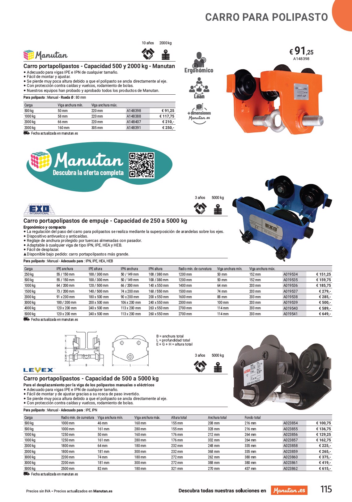 CARRO PARA POLIPASTO 10 años 2000 kg Carro portapolipastos - Capacidad 500 y 2000 kg - Manutan • Adecuado para vigas IPE e IPN de cualquier tamaño. • Fácil de montar y ajustar. • Se pierde muy poca altura debido a que el polipasto se ancla directamente al eje. • Con protección contra caídas y vuelcos, rodamiento de bolas. • Nuestros equipos han probado y aprobado todos los productos de Manutan. Para polipasto : Manual - Rueda Ø : 80 mm Carga Viga anchura mín. 500 kg 50 mm 1000 kg 58 mm 2000 kg 66 mm 2000 kg 160 mm Fecha actualizada en manutan.es Viga anchura máx. 220 mm 220 mm 220 mm 305 mm A148398 A148388 A148407 A148391 € 91,25 € 117,75 € 210,- € 250,- Ergonómico Lean € 91 ,25 A148398 Descubra la oferta completa 3 años 5000 kg Carro portapolipastos de empuje - Capacidad de 250 a 5000 kg Ergonómico y compacto • La regulación del paso del carro para polipastos se realiza mediante la superposición de arandelas sobre los ejes. • Dispositivo antivuelco y anticaídas. • Reglaje de anchura protegido por tuercas almenadas con pasador. • Adaptable à cualquier viga de tipo IPN, IPE, HEA y HEB. • Fácil de desplazar. SS Disponible bajo pedido: carro portapolipastos más grande. Para polipasto : Manual - Adecuado para : IPN, IPE, HEA, HEB Carga IPE anchura 250 kg 55 / 150 mm 500 kg 55 / 150 mm 1000 kg 64 / 200 mm 1500 kg 73 / 200 mm 2000 kg 91 x 200 mm 3000 kg 100 / 200 mm 4000 kg 120 x 200 mm 5000 kg 120 x 200 mm Fecha actualizada en manutan.es IPE altura 100 / 300 mm 100 / 300 mm 120 / 500 mm 140 / 500 mm 180 x 500 mm 200 x 500 mm 240 x 500 mm 240 x 500 mm IPN anchura 50 / 149 mm 50 / 149 mm 66 / 200 mm 74 x 200 mm 90 x 200 mm 106 x 200 mm 113 x 200 mm 113 x 200 mm IPN altura 100 / 380 mm 100 / 380 mm 140 x 550 mm 160 / 550 mm 200 x 550 mm 240 x 550 mm 263 x 550 mm 260 x 550 mm Radio min. de curvatura 1200 mm 1200 mm 1400 mm 1500 mm 1600 mm 2300 mm 2700 mm 2700 mm Viga anchura mín. 50 mm 50 mm 64 mm 74 mm 88 mm 100 mm 114 mm 114 mm Viga anchura máx. 152 mm 152 mm 203 mm 203 mm 203 mm 203 mm 203 mm 203 mm A019534 A019535 A019536 A019537 A019538 A019539 A019540 A019541 B = anchura total L = profundidad total E + G + H = altura total 3 años 5000 kg Carro portapolipastos - Capacidad de 500 a 5000 kg Para el desplazamiento por la viga de los polipastos manuales o eléctricos • Adecuado para vigas IPE e IPN de cualquier tamaño. • Fácil de montar y de ajustar gracias a su rosca de paso invertido. • Se pierde muy poca altura debido a que el polipasto se ancla directamente al eje. • Con protección contra caídas y vuelcos, rodamiento de bolas. Para polipasto : Manual - Adecuado para : IPE, IPN Carga Radio min. de curvatura 500 kg 1000 mm 500 kg 1000 mm 1000 kg 1250 mm 1000 kg 1250 mm 2000 kg 1800 mm 2000 kg 1800 mm 3000 kg 2200 mm 3000 kg 2200 mm 5000 kg 2500 mm Fecha actualizada en manutan.es Viga anchura mín. 46 mm 161 mm 50 mm 161 mm 64 mm 181 mm 74 mm 181 mm 82 mm Viga anchura máx. 160 mm 280 mm 160 mm 280 mm 180 mm 300 mm 180 mm 300 mm 180 mm Altura total 155 mm 155 mm 176 mm 176 mm 232 mm 232 mm 272 mm 272 mm 321 mm Anchura total 208 mm 328 mm 212 mm 332 mm 248 mm 368 mm 262 mm 388 mm 270 mm Fondo total 216 mm 216 mm 264 mm 264 mm 335 mm 335 mm 380 mm 380 mm 437 mm A023854 A023855 A023856 A023857 A023858 A023859 A023860 A023861 A023862 € 151,25 € 159,75 € 185,75 € 279,- € 285,- € 500,- € 589,- € 649,- € 100,75 € 136,75 € 129,25 € 162,75 € 225,- € 265,- € 375,- € 419,- € 615,- 115