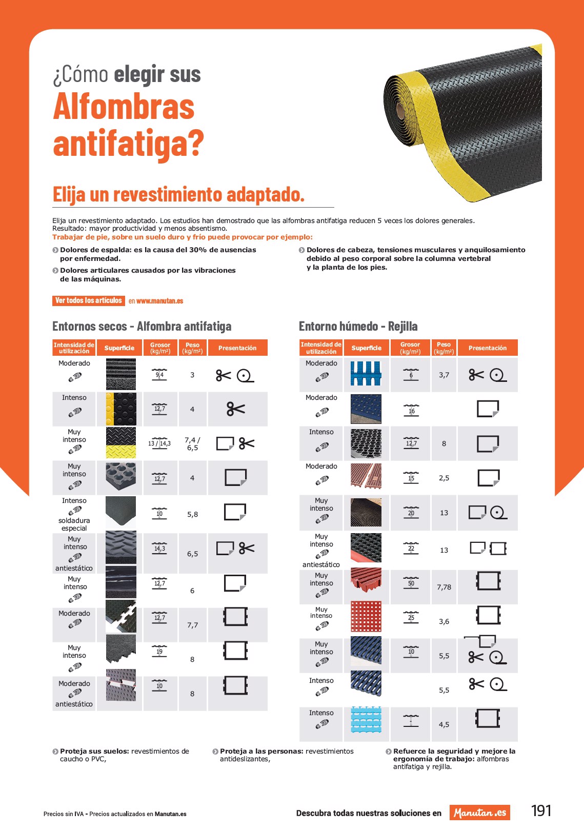 ¿Cómo elegir sus Alfombras antifatiga? Elija un revestimiento adaptado. Elija un revestimiento adaptado. Los estudios han demostrado que las alfombras antifatiga reducen 5 veces los dolores generales. Resultado: mayor productividad y menos absentismo. Trabajar de pie, sobre un suelo duro y frío puede provocar por ejemplo: Dolores de espalda: es la causa del 30% de ausencias por enfermedad. Dolores articulares causados por las vibraciones de las máquinas. Dolores de cabeza, tensiones musculares y anquilosamiento debido al peso corporal sobre la columna vertebral y la planta de los pies. Ver todos los artículos en www.manutan.es Entornos secos - Alfombra antifatiga Intensidad de utilización Moderado Superficie Grosor (kg/m 2 ) Peso (kg/m 2 ) 9,4 3 Presentación Entorno húmedo - Rejilla Intensidad de utilización Moderado Superficie Grosor (kg/m 2 ) 6 Peso (kg/m 2 ) 3,7 Presentación Intenso 12,7 4 Moderado 16 Muy intenso Muy intenso 13 / 14,3 7,4 / 6,5 12,7 4 Intenso Moderado 12,7 8 15 2,5 Intenso soldadura especial Muy intenso antiestático Muy intenso Moderado Muy intenso Moderado antiestático 10 5,8 14,3 6,5 12,7 6 12,7 7,7 19 8 10 8 Muy intenso Muy intenso antiestático Muy intenso Muy intenso Muy intenso Intenso Intenso 20 13 22 13 50 7,78 25 3,6 10 5,5 5,5 - 4,5 Proteja sus suelos: revestimientos de caucho o PVC, Proteja a las personas: revestimientos antideslizantes, Refuerce la seguridad y mejore la ergonomía de trabajo: alfombras antifatiga y rejilla. 191