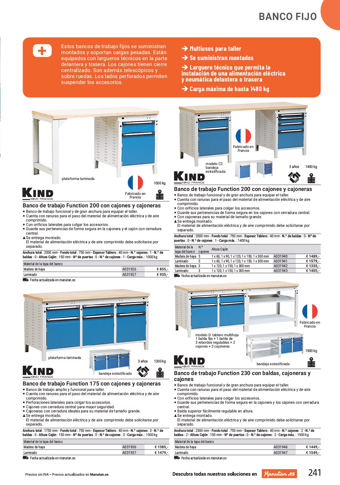 BANCO FIJO + Estos bancos de trabajo fijos se suministran montados y soportan cargas pesadas. Están equipados con largueros técnicos en la parte delantera y trasera. Los cajones tienen cierre centralizado. Son además telescópicos y sobre ruedas. Los lados perforados permiten suspender los accesorios. Î Multiusos para taller Î Se suministran montados Î Larguero técnico que permita la instalación de una alimentación eléctrica y neumática delantera o trasera Î Carga máxima de hasta 1480 kg Fabricado en Francia plataforma laminada 1000 kg Fabricado en Francia Banco de trabajo Function 200 con cajones y cajoneras • Banco de trabajo funcional y de gran anchura para equipar el taller. • Cuenta con ranuras para el paso del material de alimentación eléctrica y de aire comprimido. • Con orificios laterales para colgar los accesorios. • Guarde sus pertenencias de forma segura en la cajonera y el cajón con cerradura central. SS Se entrega montado. El material de alimentación eléctrica y de aire comprimido debe solicitarse por separado. Anchura total : 2000 mm - Fondo total : 750 mm - Espesor Tablero : 40 mm - N.º cajones : 1 - N.º de baldas : 0 - Altura Cajón : 150 mm - Nº de puertas : 0 - N.º de cajones : 1 - Carga máx. : 1000 kg Material de la tapa del banco Madera de haya Laminado Fecha actualizada en manutan.es A031926 A031927 € 855,- € 935,- modelo C2 bandeja estratificada 3 años 1400 kg Banco de trabajo Function 200 con cajones y cajoneras • Banco de trabajo funcional y de gran anchura para equipar el taller. • Cuenta con ranuras para el paso del material de alimentación eléctrica y de aire comprimido. • Con orificios laterales para colgar los accesorios. • Guarde sus pertenencias de forma segura en los cajones con cerradura central. • Con cajoneras para su material de tamaño grande. SS Se entrega montado. El material de alimentación eléctrica y de aire comprimido debe solicitarse por separado. Anchura total : 2000 mm - Fondo total : 750 mm - Espesor Tablero : 40 mm - N.º de baldas : 0 - Nº de puertas : 0 - N.º de cajones : 1 - Carga máx. : 1400 kg Mtaaptaedrieall bdaenlcao Nca.ºjones Altura Cajón Madera de haya 5 1 x 60, 1 x 90, 1 x 120, 1 x 150, 1 x 300 mm Laminado 5 1 x 60, 1 x 90, 1 x 120, 1 x 150, 1 x 300 mm Madera de haya 3 1 x 120, 1 x 150, 1 x 300 mm Laminado 3 1 x 120, 1 x 150, 1 x 300 mm Fecha actualizada en manutan.es A031940 A031941 A031942 A031943 € 1489,- € 1579,- € 1335,- € 1405,- plataforma laminada 3 años 1300 kg bandeja estratificada Banco de trabajo Function 175 con cajones y cajoneras • Banco de trabajo amplio y funcional para taller. • Cuenta con ranuras para el paso del material de alimentación eléctrica y de aire comprimido. • Perforaciones laterales para colgar los accesorios. • Cajones con cerradura central para mayor seguridad. • Cajoneras con cerradura ideales para su material de tamaño grande. SS Se entrega montado. El material de alimentación eléctrica y de aire comprimido debe solicitarse por separado. Anchura total : 1750 mm - Fondo total : 750 mm - Espesor Tablero : 40 mm - N.º cajones : 3 - N.º de baldas : 0 - Altura Cajón : 150 mm - Nº de puertas : 0 - N.º de cajones : 3 - Carga máx. : 1300 kg Material de la tapa del banco Madera de haya Laminado Fecha actualizada en manutan.es A031936 A031937 € 1385,- € 1479,- modelo D: tablero multihoja 1 balda fija + 1 balda de 3 rebordes regulables + 2 cajones + 2 cajoneras Fabricado en Francia 1500 kg bandeja estratificada Banco de trabajo Function 230 con baldas, cajoneras y cajones • Banco de trabajo funcional y de gran anchura para equipar el taller. • Cuenta con ranuras para el paso del material de alimentación eléctrica y de aire comprimido. • Con orificios laterales para colgar los accesorios. • Guarde sus pertenencias de forma segura en la cajonera y los cajones con cerradura central. • Balda superior fácilmente regulable en altura. SS Se entrega montado. El material de alimentación eléctrica y de aire comprimido debe solicitarse por separado. Anchura total : 2300 mm - Fondo total : 750 mm - Espesor Tablero : 40 mm - N.º cajones : 2 - N.º de baldas : 2 - Altura Cajón : 150 mm - Nº de puertas : 0 - N.º de cajones : 2 - Carga máx. : 1500 kg Material de la tapa del banco Madera de haya Laminado Fecha actualizada en manutan.es A031946 A031947 € 1449,- € 1549,- 241