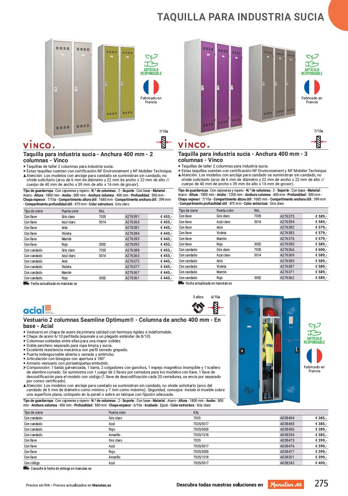 TAQUILLA PARA INDUSTRIA SUCIA Fabricado en Francia Fabricado en Francia 7/10a 7/10a Taquilla para industria sucia - Anchura 400 mm - 2 columnas - Vinco • Taquillas de taller 2 columnas para industria sucia. • Estas taquillas cuentan con certificación NF Environnement y NF Mobilier Technique. SS Atención: Los modelos con anclaje para candado se suministran sin candado, no olvide solicitarlo (arco de 6 mm de diámetro y 22 mm de ancho x 22 mm de alto // cuerpo de 40 mm de ancho x 39 mm de alto x 16 mm de grosor). Tipo de guardarropa : Con cajoneras y ropero - N.º de columnas : 2 - Soporte : Con base - Material : Acero - Altura : 1800 mm - Ancho : 800 mm - Anchura columna : 400 mm - Profundidad : 500 mm - Chapa espesor : 7/10a - Compartimento altura útil : 1685 mm - Compartimento anchura útil : 399 mm - Compartimento profundidad útil : 473 mm - Color estructura : Gris claro Tipo de cierre Puerta color Con llave Gris claro Con llave Azul claro Con llave Anís Con llave Violeta Con llave Marrón Con llave Rojo Con candado Gris claro Con candado Azul claro Con candado Anís Con candado Violeta Con candado Marrón Con candado Rojo Fecha actualizada en manutan.es RAL 7035 A276391 5014 A276365 A276381 A276384 A276393 3002 A276392 7035 A276388 5014 A276363 A276372 A276377 A276367 3002 A276361 € 455,- € 455,- € 445,- € 445,- € 445,- € 455,- € 455,- € 455,- € 445,- € 445,- € 445,- € 445,- Taquilla para industria sucia - Anchura 400 mm - 3 columnas - Vinco • Taquillas de taller 2 columnas para industria sucia. • Estas taquillas cuentan con certificación NF Environnement y NF Mobilier Technique. SS Atención: Los modelos con anclaje para candado se suministran sin candado, no olvide solicitarlo (arco de 6 mm de diámetro y 22 mm de ancho x 22 mm de alto // cuerpo de 40 mm de ancho x 39 mm de alto x 16 mm de grosor). Tipo de guardarropa : Con cajoneras y ropero - N.º de columnas : 3 - Soporte : Con base - Material : Acero - Altura : 1800 mm - Ancho : 1200 mm - Anchura columna : 400 mm - Profundidad : 500 mm - Chapa espesor : 7/10a - Compartimento altura útil : 1685 mm - Compartimento anchura útil : 399 mm - Compartimento profundidad útil : 473 mm - Color estructura : Gris claro Tipo de cierre Puerta color Con llave Gris claro Con llave Azul claro Con llave Anís Con llave Violeta Con llave Marrón Con llave Rojo Con candado Gris claro Con candado Azul claro Con candado Anís Con candado Violeta Con candado Marrón Con candado Rojo Fecha actualizada en manutan.es RAL 7035 A276375 5014 A276394 A276382 A276383 A276376 3002 A276390 7035 A276366 5014 A276369 A276385 A276387 A276371 3002 A276362 € 589,- € 589,- € 579,- € 579,- € 579,- € 589,- € 600,- € 589,- € 589,- € 589,- € 589,- € 589,- 3 años 6/10a Vestuario 2 columnas Seamline Optimum® - Columna de ancho 400 mm - En base - Acial • Vestuario en chapa de acero de primera calidad con hermosa rigidez e indeformable. • Chapa de acero 6/10 perfilada (equivale a un plegado estándar de 8/10). • Columnas soldadas entre ellas para una mayor solidez. • Doble perchero separado para ropa limpia y sucia. • Excelente resistencia mecánica con perfil cerrado grapado. • Puerta indesgoznable abierta o cerrada y antirrobo. • Articulación con bisagras con apertura a 180°. • Armario vestuario con portaetiquetas embutido. O Composición: 1 balda galvanizada, 1 barra, 2 colgadores con ganchos, 1 espejo magnético irrompible y 1 toallero de alambre curvado. Se suministra con 1 juego de 2 llaves por cerradura para los modelos con llave, 1 llave de descodificación para el modelo con código (1 llave de descodificación cada 20 cerraduras, se envía por separado por correo certificado). SS Atención: Los modelos con anclaje para candado se suministran sin candado, no olvide solicitarlo (arco del candado de 6 mm de diámetro como mínimo y 7 mm como máximo). Seguridad, consejos: instale el mueble sobre una superficie plana, colóquelo en la pared o sobre un tabique con fijación adecuada. Tipo de guardarropa : Con cajoneras y ropero - N.º de columnas : 2 - Soporte : Con base - Material : Acero - Altura : 1800 mm - Ancho : 800 mm - Anchura columna : 400 mm - Profundidad : 500 mm - Chapa espesor : 6/10a - Acabado : Epoxi - Color estructura : Gris claro Tipo de cierre Con candado Con candado Con candado Con candado Con llave Con llave Con llave Con llave Con código Consulte la fecha de entrega en manutan.es Puerta color Gris claro Azul Rojo Amarillo Gris claro Azul Rojo Amarillo Azul RAL 7035 7035/5017 7035/3003 7035/1018 7035 7035/5017 7035/3003 7035/1018 7035/5017 Fabricado en Francia A038454 A038455 A038456 A038294 A038475 A038476 A038477 A038301 A038243 € 385,- € 385,- € 389,- € 385,- € 399,- € 399,- € 399,- € 399,- € 409,- 275
