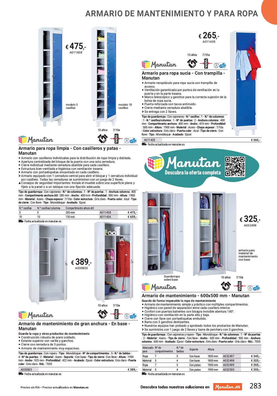 ARMARIO DE MANTENIMIENTO Y PARA ROPA € 475 ,- A011438 € 265 ,- A011435 10 años 7/10a modelo 5 casillas modelo 10 casillas 10 años 7/10a Armario para ropa limpia - Con casilleros y patas - Manutan • Armario con casilleros individuales para la distribución de ropa limpia y doblada. • Apertura centralizada del bloque de la puerta con una sola cerradura. • Cierre individual mediante cerradura abatible para cada casillero. • Estructura bien ventilada e higiénica con ventilación trasera. • Armario con portaetiquetas encastrado en cada casillero. O Armario equipado con 1 cerradura central para abrir el bloque y 1 cerradura individual por casillero. Todas las cerraduras se suministran con un juego de 2 llaves. SS Consejos de seguridad importantes: Instale el mueble sobre una superficie plana y fíjelo a la pared o a un tabique con una fijación adecuada. Tipo de guardarropa : Con cajoneras - N.º de columnas : 1 - Nº de puertas : 1 - Anchura columna : 400 mm - Compartimento anchura útil : 280 mm - Ancho : 400 mm - Profundidad : 500 mm - Altura : 1900 mm - Material : Acero - Chapa espesor : 7/10a - Color estructura : Gris claro - Puerta color : Azul - Tipo de cierre : Con llave - Tipo : Monobloque - Acabado : Epoxi N.º casillas N.º casillas/columna 5 5 10 10 Fecha actualizada en manutan.es Compartimento altura útil 285 mm 130 mm A011438 A011436 € 475,- € 659,- Armario para ropa sucia - Con trampilla - Manutan • Armario receptáculo para ropa sucia con trampilla de acceso. • Ventilación garantizada por puntos de ventilación en la puerta y en la parte trasera. • Marco telescópico y ganchos para la correcta sujeción de la bolsa de ropa sucia. • Puerta reforzada con tacos antirruido. • Cierre mediante cerradura abatible. O Se entrega con 2 llaves. Tipo de guardarropa : Con cajoneras - N.º casillas : 1 - N.º de columnas : 1 - N.º casillas/columna : 1 - Nº de puertas : 2 - Anchura columna : 400 mm - Compartimento anchura : 400 mm - Ancho : 415 mm - Profundidad : 500 mm - Altura : 1900 mm - Material : Acero - Chapa espesor : 7/10a - Color estructura : Gris claro - Puerta color : Azul - Tipo de cierre : Con llave - Tipo : Monobloque - Acabado : Epoxi A011435 Fecha actualizada en manutan.es Descubra la oferta completa € 265,- € 325 ,- A032498 € 389 ,- A035803 Guardarropa sobre base armario para material de mantenimiento con base 10 años 7/10a 10 años 7/10a Armario de mantenimiento de gran anchura - En base - Manutan Guarde la ropa y otros productos de mantenimiento • Construcción robusta de acero soldado. • Estante superior con varilla y ganchos. • Cierre con cerradura de 3 puntos. • Armario de mantenimiento muy espacioso. Tipo de guardarropa : Con ropero - Tipo : Monobloque - Nº de compartimentos : 5 - N.º de baldas : 4 - Nº de puertas : 2 - Material : Acero - Soporte : Con base - Tipo de cierre : Con llave - Altura : 1950 mm - Ancho : 925 mm - Profundidad : 422 mm - Acabado : Epoxi - Color estructura : Gris claro - Puerta color : Gris claro - RAL : 7035 A035803 € 389,- Fecha actualizada en manutan.es Armario de mantenimiento - 600x500 mm - Manutan Guarde de forma impecable la ropa de mantenimiento • Armario de mantenimiento simple y práctico con múltiples compartimentos. • Higiénico con pared de separación entre cada casillero interior. • Confort con puertas batientes con bisagra invisible abertura 180°. • Higiénico con ventilación en la parte alta y baja. • Cierre con llave con portaetiquetas embutido. • Barra con 3 ganchos deslizantes. • Nuestros equipos han probado y aprobado todos los productos de Manutan. O Se suministra con 1 juego de 2 llaves y barra de perchero con 3 ganchos. Tipo de guardarropa : Con cajoneras y ropero - Tipo : Monobloque - N.º de columnas : 1 - Nº de puertas : 2 - Material : Acero - Tipo de cierre : Con llave - Ancho : 600 mm - Profundidad : 500 mm - Anchura columna : 600 mm - Acabado : Epoxi - Color estructura : Gris claro - Puerta color : Gris claro - RAL : 7035 Adecuado Nº de N.º de para compartimentos baldas Ropa 7 5 Material 5 4 Ropa 7 5 Material 5 4 Fecha actualizada en manutan.es Soporte Con base Con base Con patas Con patas Altura 1800 mm 1800 mm 1900 mm 1900 mm A032497 A032498 A032499 A032500 € 345,- € 325,- € 355,- € 355,- 283