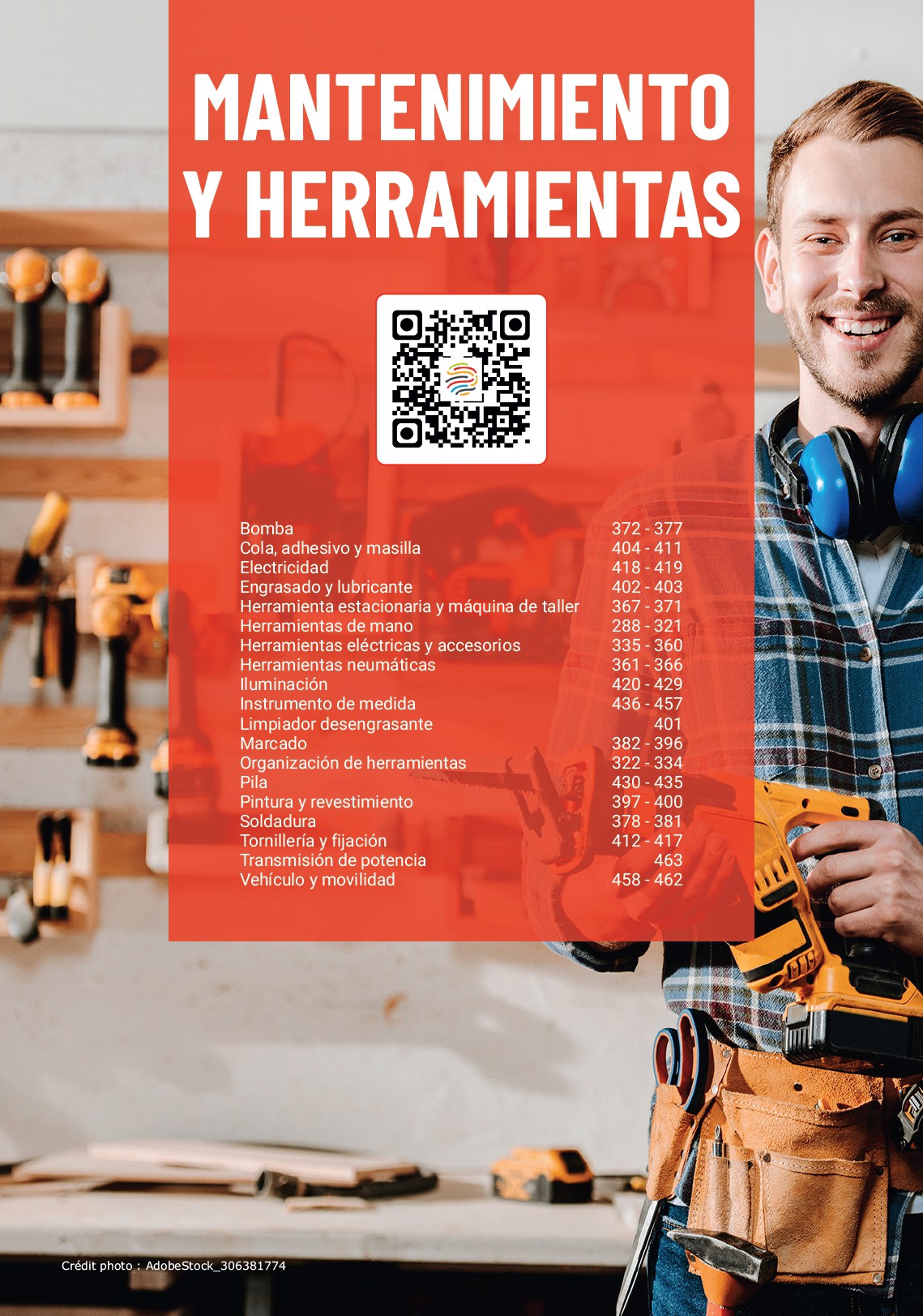 MANTENIMIENTO Y HERRAMIENTAS Bomba Cola, adhesivo y masilla Electricidad Engrasado y lubricante Herramienta estacionaria y máquina de Herramientas de mano Herramientas eléctricas y accesorios Herramientas neumáticas Iluminación Instrumento de medida Limpiador desengrasante Marcado Organización de herramientas Pila Pintura y revestimiento Soldadura Tornillería y fijación Transmisión de potencia Vehículo y movilidad taller 372 - 377 404 - 411 418 - 419 402 - 403 367 - 371 288 - 321 335 - 360 361 - 366 420 - 429 436 - 457 401 382 - 396 322 - 334 430 - 435 397 - 400 378 - 381 412 - 417 463 458 - 462 Crédit photo : AdobeStock_306381774
