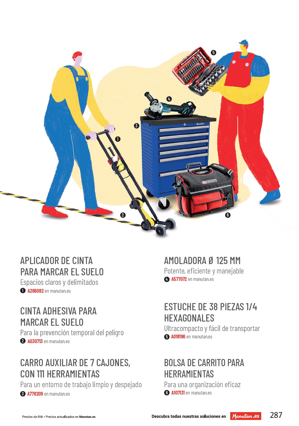 5 4 3 1 2 6 APLICADOR DE CINTA PARA MARCAR EL SUELO Espacios claros y delimitados 1 A266082 en manutan.es CINTA ADHESIVA PARA MARCAR EL SUELO Para la prevención temporal del peligro 2 A030713 en manutan.es CARRO AUXILIAR DE 7 CAJONES, CON 111 HERRAMIENTAS Para un entorno de trabajo limpio y despejado 3 A778209 en manutan.es AMOLADORA Ø 125 MM Potente, eficiente y manejable 4 A577072 en manutan.es ESTUCHE DE 38 PIEZAS 1/4 HEXAGONALES Ultracompacto y fácil de transportar 5 A018196 en manutan.es BOLSA DE CARRITO PARA HERRAMIENTAS Para una organización eficaz 6 A107131 en manutan.es 287
