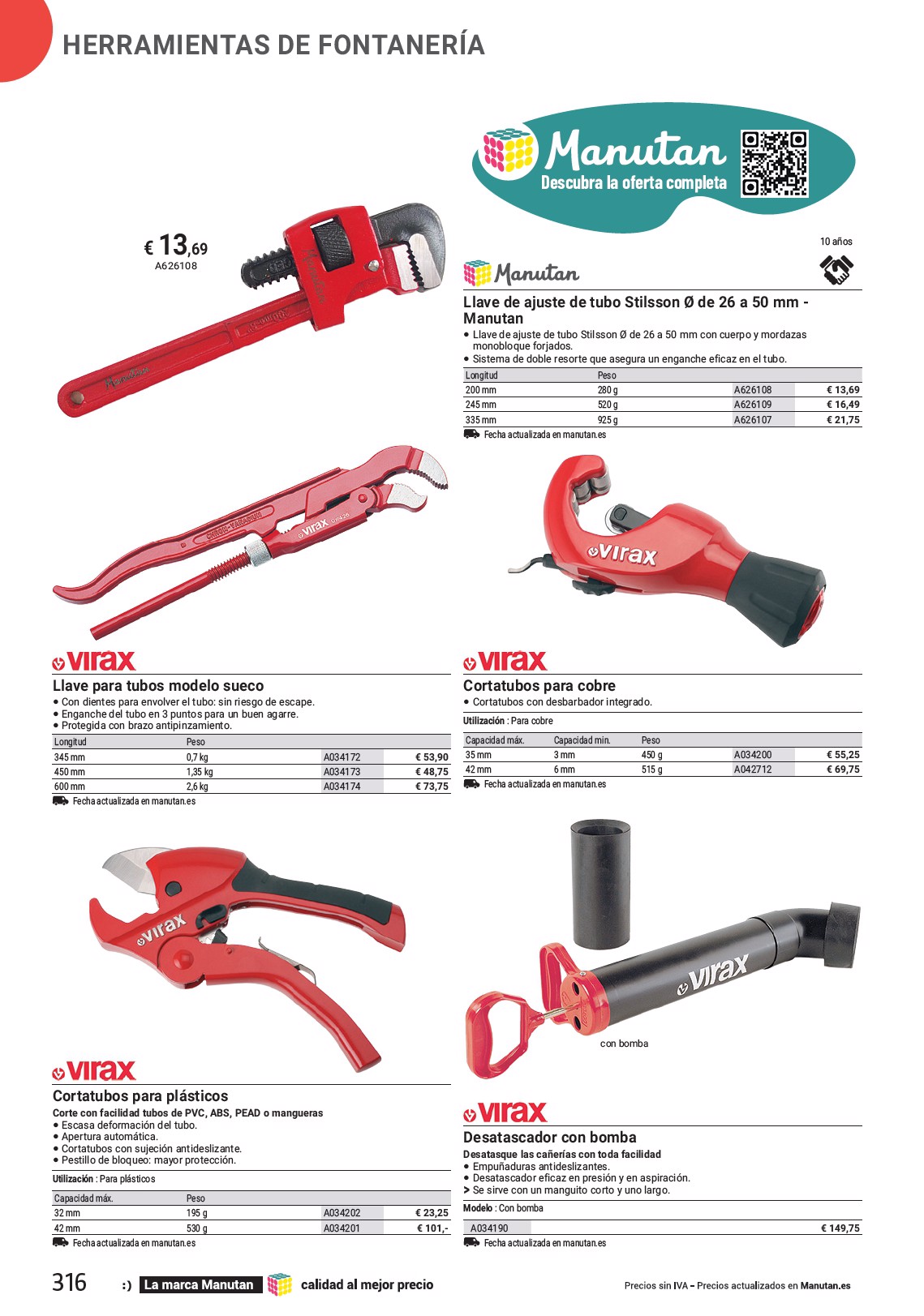 HERRAMIENTAS DE FONTANERÍA € 13 ,69 A626108 Descubra la oferta completa 10 años Llave de ajuste de tubo Stilsson Ø de 26 a 50 mm - Manutan • Llave de ajuste de tubo Stilsson Ø de 26 a 50 mm con cuerpo y mordazas monobloque forjados. • Sistema de doble resorte que asegura un enganche eficaz en el tubo. Longitud Peso 200 mm 280 g A626108 245 mm 520 g A626109 335 mm 925 g A626107 Fecha actualizada en manutan.es € 13,69 € 16,49 € 21,75 Llave para tubos modelo sueco • Con dientes para envolver el tubo: sin riesgo de escape. • Enganche del tubo en 3 puntos para un buen agarre. • Protegida con brazo antipinzamiento. Longitud Peso 345 mm 0,7 kg 450 mm 1,35 kg 600 mm 2,6 kg Fecha actualizada en manutan.es A034172 A034173 A034174 € 53,90 € 48,75 € 73,75 Cortatubos para cobre • Cortatubos con desbarbador integrado. Utilización : Para cobre Capacidad máx. Capacidad min. 35 mm 3 mm 42 mm 6 mm Fecha actualizada en manutan.es Peso 450 g 515 g A034200 A042712 € 55,25 € 69,75 Cortatubos para plásticos Corte con facilidad tubos de PVC, ABS, PEAD o mangueras • Escasa deformación del tubo. • Apertura automática. • Cortatubos con sujeción antideslizante. • Pestillo de bloqueo: mayor protección. Utilización : Para plásticos Capacidad máx. Peso 32 mm 195 g 42 mm 530 g Fecha actualizada en manutan.es A034202 A034201 316 con bomba € 23,25 € 101,- Desatascador con bomba Desatasque las cañerías con toda facilidad • Empuñaduras antideslizantes. • Desatascador eficaz en presión y en aspiración. O Se sirve con un manguito corto y uno largo. Modelo : Con bomba A034190 Fecha actualizada en manutan.es € 149,75