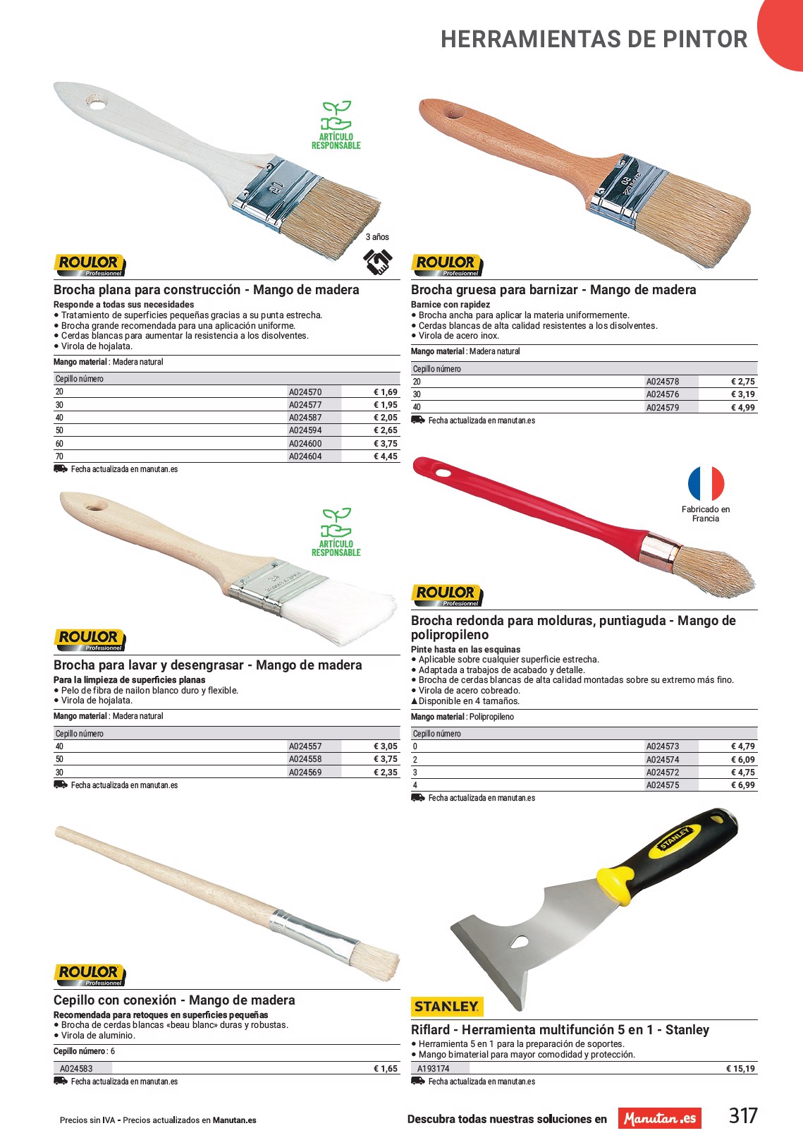 HERRAMIENTAS DE PINTOR 3 años Brocha plana para construcción - Mango de madera Responde a todas sus necesidades • Tratamiento de superficies pequeñas gracias a su punta estrecha. • Brocha grande recomendada para una aplicación uniforme. • Cerdas blancas para aumentar la resistencia a los disolventes. • Virola de hojalata. Mango material : Madera natural Cepillo número 20 30 40 50 60 70 Fecha actualizada en manutan.es A024570 A024577 A024587 A024594 A024600 A024604 € 1,69 € 1,95 € 2,05 € 2,65 € 3,75 € 4,45 Brocha gruesa para barnizar - Mango de madera Barnice con rapidez • Brocha ancha para aplicar la materia uniformemente. • Cerdas blancas de alta calidad resistentes a los disolventes. • Virola de acero inox. Mango material : Madera natural Cepillo número 20 30 40 Fecha actualizada en manutan.es A024578 A024576 A024579 € 2,75 € 3,19 € 4,99 Fabricado en Francia Brocha para lavar y desengrasar - Mango de madera Para la limpieza de superficies planas • Pelo de fibra de nailon blanco duro y flexible. • Virola de hojalata. Mango material : Madera natural Cepillo número 40 50 30 Fecha actualizada en manutan.es A024557 A024558 A024569 € 3,05 € 3,75 € 2,35 Brocha redonda para molduras, puntiaguda - Mango de polipropileno Pinte hasta en las esquinas • Aplicable sobre cualquier superficie estrecha. • Adaptada a trabajos de acabado y detalle. • Brocha de cerdas blancas de alta calidad montadas sobre su extremo más fino. • Virola de acero cobreado. SS Disponible en 4 tamaños. Mango material : Polipropileno Cepillo número 0 2 3 4 Fecha actualizada en manutan.es A024573 A024574 A024572 A024575 € 4,79 € 6,09 € 4,75 € 6,99 Cepillo con conexión - Mango de madera Recomendada para retoques en superficies pequeñas • Brocha de cerdas blancas «beau blanc» duras y robustas. • Virola de aluminio. Cepillo número : 6 A024583 Fecha actualizada en manutan.es € 1,65 Riflard - Herramienta multifunción 5 en 1 - Stanley • Herramienta 5 en 1 para la preparación de soportes. • Mango bimaterial para mayor comodidad y protección. A193174 Fecha actualizada en manutan.es € 15,19 317