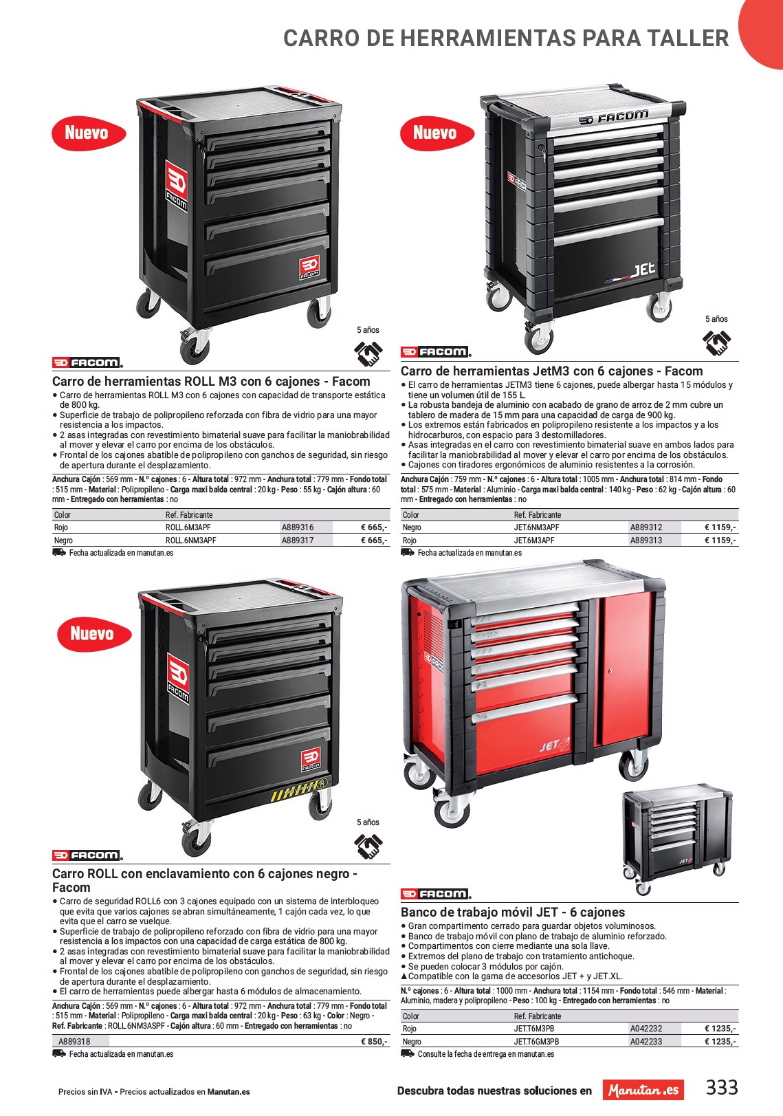 CARRO DE HERRAMIENTAS PARA TALLER 5 años 5 años Carro de herramientas ROLL M3 con 6 cajones - Facom • Carro de herramientas ROLL M3 con 6 cajones con capacidad de transporte estática de 800 kg. • Superficie de trabajo de polipropileno reforzada con fibra de vidrio para una mayor resistencia a los impactos. • 2 asas integradas con revestimiento bimaterial suave para facilitar la maniobrabilidad al mover y elevar el carro por encima de los obstáculos. • Frontal de los cajones abatible de polipropileno con ganchos de seguridad, sin riesgo de apertura durante el desplazamiento. Anchura Cajón : 569 mm - N.º cajones : 6 - Altura total : 972 mm - Anchura total : 779 mm - Fondo total : 515 mm - Material : Polipropileno - Carga maxi balda central : 20 kg - Peso : 55 kg - Cajón altura : 60 mm - Entregado con herramientas : no Color Ref. Fabricante Rojo ROLL.6M3APF Negro ROLL.6NM3APF Fecha actualizada en manutan.es A889316 A889317 € 665,- € 665,- Carro de herramientas JetM3 con 6 cajones - Facom • El carro de herramientas JETM3 tiene 6 cajones, puede albergar hasta 15 módulos y tiene un volumen útil de 155 L. • La robusta bandeja de aluminio con acabado de grano de arroz de 2 mm cubre un tablero de madera de 15 mm para una capacidad de carga de 900 kg. • Los extremos están fabricados en polipropileno resistente a los impactos y a los hidrocarburos, con espacio para 3 destornilladores. • Asas integradas en el carro con revestimiento bimaterial suave en ambos lados para facilitar la maniobrabilidad al mover y elevar el carro por encima de los obstáculos. • Cajones con tiradores ergonómicos de aluminio resistentes a la corrosión. Anchura Cajón : 759 mm - N.º cajones : 6 - Altura total : 1005 mm - Anchura total : 814 mm - Fondo total : 575 mm - Material : Aluminio - Carga maxi balda central : 140 kg - Peso : 62 kg - Cajón altura : 60 mm - Entregado con herramientas : no Color Ref. Fabricante Negro JET.6NM3APF Rojo JET.6M3APF Fecha actualizada en manutan.es A889312 A889313 € 1159,- € 1159,- 5 años Carro ROLL con enclavamiento con 6 cajones negro - Facom • Carro de seguridad ROLL6 con 3 cajones equipado con un sistema de interbloqueo que evita que varios cajones se abran simultáneamente, 1 cajón cada vez, lo que evita que el carro se vuelque. • Superficie de trabajo de polipropileno reforzado con fibra de vidrio para una mayor resistencia a los impactos con una capacidad de carga estática de 800 kg. • 2 asas integradas con revestimiento bimaterial suave para facilitar la maniobrabilidad al mover y elevar el carro por encima de los obstáculos. • Frontal de los cajones abatible de polipropileno con ganchos de seguridad, sin riesgo de apertura durante el desplazamiento. • El carro de herramientas puede albergar hasta 6 módulos de almacenamiento. Anchura Cajón : 569 mm - N.º cajones : 6 - Altura total : 972 mm - Anchura total : 779 mm - Fondo total : 515 mm - Material : Polipropileno - Carga maxi balda central : 20 kg - Peso : 63 kg - Color : Negro - Ref. Fabricante : ROLL.6NM3ASPF - Cajón altura : 60 mm - Entregado con herramientas : no A889318 Fecha actualizada en manutan.es € 850,- Banco de trabajo móvil JET - 6 cajones • Gran compartimento cerrado para guardar objetos voluminosos. • Banco de trabajo móvil con plano de trabajo de aluminio reforzado. • Compartimentos con cierre mediante una sola llave. • Extremos del plano de trabajo con tratamiento antichoque. • Se pueden colocar 3 módulos por cajón. SS Compatible con la gama de accesorios JET + y JET.XL. N.º cajones : 6 - Altura total : 1000 mm - Anchura total : 1154 mm - Fondo total : 546 mm - Material : Aluminio, madera y polipropileno - Peso : 100 kg - Entregado con herramientas : no Color Ref. Fabricante Rojo JET.T6M3PB Negro JET.T6GM3PB Consulte la fecha de entrega en manutan.es A042232 A042233 € 1235,- € 1235,- 333