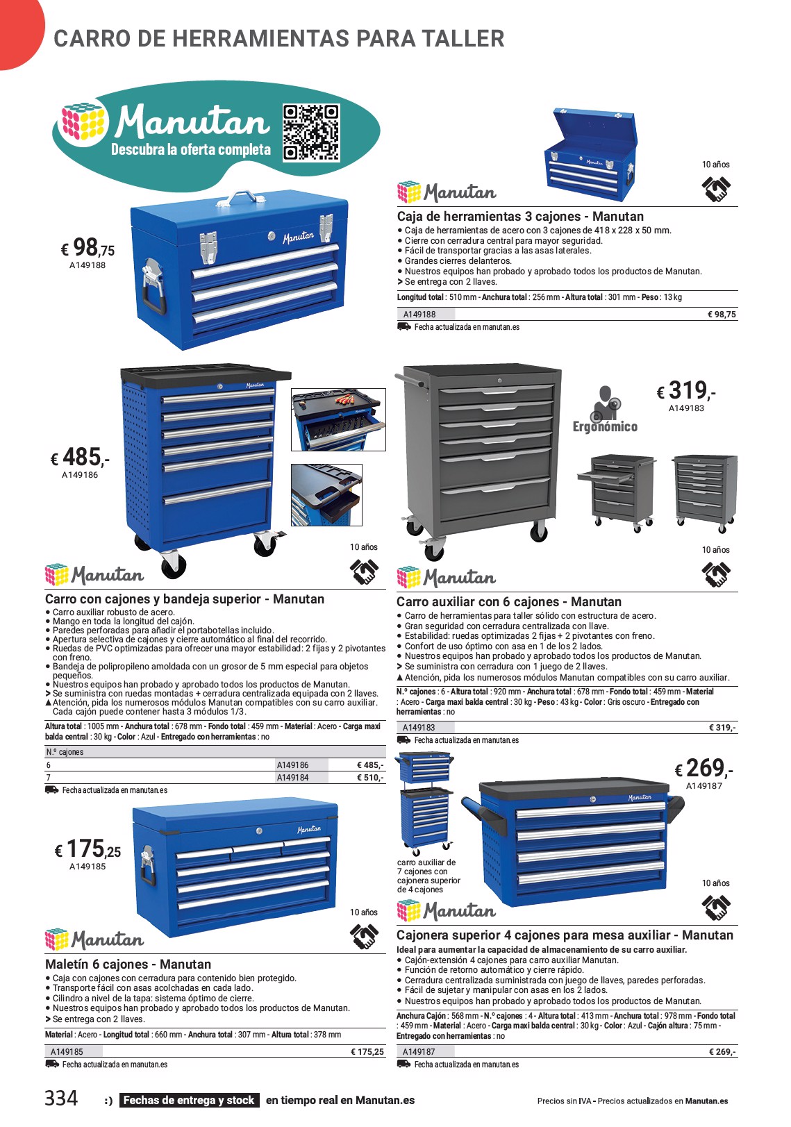CARRO DE HERRAMIENTAS PARA TALLER Descubra la oferta completa 98 € ,75 A149188 485 € ,- A149186 10 años Caja de herramientas 3 cajones - Manutan • Caja de herramientas de acero con 3 cajones de 418 x 228 x 50 mm. • Cierre con cerradura central para mayor seguridad. • Fácil de transportar gracias a las asas laterales. • Grandes cierres delanteros. • Nuestros equipos han probado y aprobado todos los productos de Manutan. O Se entrega con 2 llaves. Longitud total : 510 mm - Anchura total : 256 mm - Altura total : 301 mm - Peso : 13 kg A149188 Fecha actualizada en manutan.es € 98,75 Ergonómico 319 € ,- A149183 10 años 10 años Carro con cajones y bandeja superior - Manutan • Carro auxiliar robusto de acero. • Mango en toda la longitud del cajón. • Paredes perforadas para añadir el portabotellas incluido. • Apertura selectiva de cajones y cierre automático al final del recorrido. • Ruedas de PVC optimizadas para ofrecer una mayor estabilidad: 2 fijas y 2 pivotantes con freno. • Bandeja de polipropileno amoldada con un grosor de 5 mm especial para objetos pequeños. • Nuestros equipos han probado y aprobado todos los productos de Manutan. O Se suministra con ruedas montadas + cerradura centralizada equipada con 2 llaves. SS Atención, pida los numerosos módulos Manutan compatibles con su carro auxiliar. Cada cajón puede contener hasta 3 módulos 1/3. Altura total : 1005 mm - Anchura total : 678 mm - Fondo total : 459 mm - Material : Acero - Carga maxi balda central : 30 kg - Color : Azul - Entregado con herramientas : no N.º cajones 6 7 Fecha actualizada en manutan.es A149186 A149184 € 485,- € 510,- Carro auxiliar con 6 cajones - Manutan • Carro de herramientas para taller sólido con estructura de acero. • Gran seguridad con cerradura centralizada con llave. • Estabilidad: ruedas optimizadas 2 fijas + 2 pivotantes con freno. • Confort de uso óptimo con asa en 1 de los 2 lados. • Nuestros equipos han probado y aprobado todos los productos de Manutan. O Se suministra con cerradura con 1 juego de 2 llaves. SS Atención, pida los numerosos módulos Manutan compatibles con su carro auxiliar. N.º cajones : 6 - Altura total : 920 mm - Anchura total : 678 mm - Fondo total : 459 mm - Material : Acero - Carga maxi balda central : 30 kg - Peso : 43 kg - Color : Gris oscuro - Entregado con herramientas : no A149183 Fecha actualizada en manutan.es € 319,- 269 € ,- A149187 175 € ,25 A149185 10 años Maletín 6 cajones - Manutan • Caja con cajones con cerradura para contenido bien protegido. • Transporte fácil con asas acolchadas en cada lado. • Cilindro a nivel de la tapa: sistema óptimo de cierre. • Nuestros equipos han probado y aprobado todos los productos de Manutan. O Se entrega con 2 llaves. Material : Acero - Longitud total : 660 mm - Anchura total : 307 mm - Altura total : 378 mm A149185 Fecha actualizada en manutan.es € 175,25 carro auxiliar de 7 cajones con cajonera superior de 4 cajones 10 años Cajonera superior 4 cajones para mesa auxiliar - Manutan Ideal para aumentar la capacidad de almacenamiento de su carro auxiliar. • Cajón-extensión 4 cajones para carro auxiliar Manutan. • Función de retorno automático y cierre rápido. • Cerradura centralizada suministrada con juego de llaves, paredes perforadas. • Fácil de sujetar y manipular con asas en los 2 lados. • Nuestros equipos han probado y aprobado todos los productos de Manutan. Anchura Cajón : 568 mm - N.º cajones : 4 - Altura total : 413 mm - Anchura total : 978 mm - Fondo total : 459 mm - Material : Acero - Carga maxi balda central : 30 kg - Color : Azul - Cajón altura : 75 mm - Entregado con herramientas : no A149187 Fecha actualizada en manutan.es € 269,- 334
