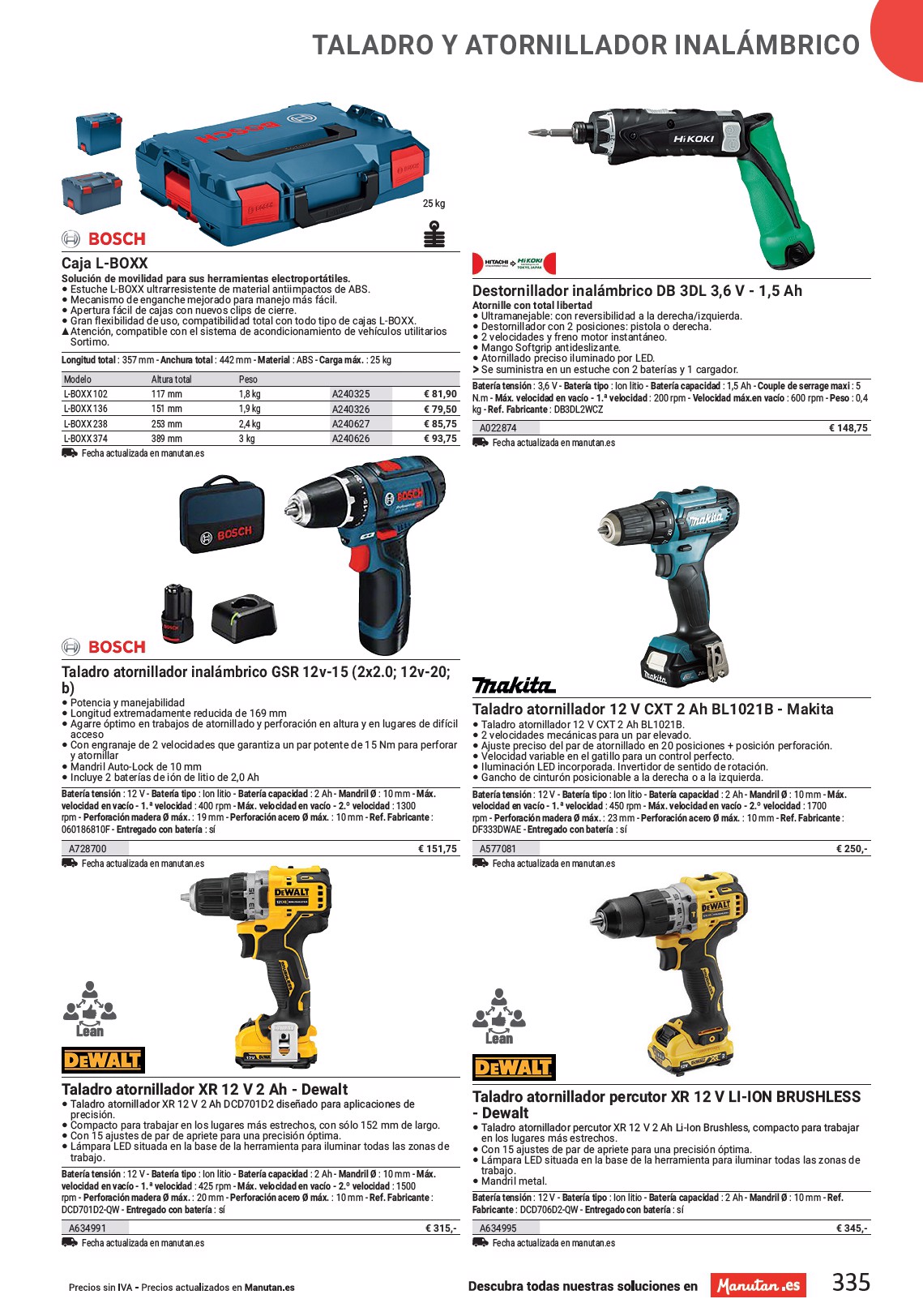 TALADRO Y ATORNILLADOR INALÁMBRICO 25 kg Caja L-BOXX Solución de movilidad para sus herramientas electroportátiles. • Estuche L-BOXX ultrarresistente de material antiimpactos de ABS. • Mecanismo de enganche mejorado para manejo más fácil. • Apertura fácil de cajas con nuevos clips de cierre. • Gran flexibilidad de uso, compatibilidad total con todo tipo de cajas L-BOXX. SS Atención, compatible con el sistema de acondicionamiento de vehículos utilitarios Sortimo. Longitud total : 357 mm - Anchura total : 442 mm - Material : ABS - Carga máx. : 25 kg Modelo Altura total L-BOXX 102 117 mm L-BOXX 136 151 mm L-BOXX 238 253 mm L-BOXX 374 389 mm Fecha actualizada en manutan.es Peso 1,8 kg 1,9 kg 2,4 kg 3 kg A240325 A240326 A240627 A240626 € 81,90 € 79,50 € 85,75 € 93,75 Destornillador inalámbrico DB 3DL 3,6 V - 1,5 Ah Atornille con total libertad • Ultramanejable: con reversibilidad a la derecha/izquierda. • Destornillador con 2 posiciones: pistola o derecha. • 2 velocidades y freno motor instantáneo. • Mango Softgrip antideslizante. • Atornillado preciso iluminado por LED. O Se suministra en un estuche con 2 baterías y 1 cargador. Batería tensión : 3,6 V - Batería tipo : Ion litio - Batería capacidad : 1,5 Ah - Couple de serrage maxi : 5 N.m - Máx. velocidad en vacío - 1.ª velocidad : 200 rpm - Velocidad máx.en vacío : 600 rpm - Peso : 0,4 kg - Ref. Fabricante : DB3DL2WCZ A022874 Fecha actualizada en manutan.es € 148,75 Taladro atornillador inalámbrico GSR 12v-15 (2x2.0; 12v-20; b) • Potencia y manejabilidad • Longitud extremadamente reducida de 169 mm • Agarre óptimo en trabajos de atornillado y perforación en altura y en lugares de difícil acceso • Con engranaje de 2 velocidades que garantiza un par potente de 15 Nm para perforar y atornillar • Mandril Auto-Lock de 10 mm • Incluye 2 baterías de ión de litio de 2,0 Ah Batería tensión : 12 V - Batería tipo : Ion litio - Batería capacidad : 2 Ah - Mandril Ø : 10 mm - Máx. velocidad en vacío - 1.ª velocidad : 400 rpm - Máx. velocidad en vacío - 2.º velocidad : 1300 rpm - Perforación madera Ø máx. : 19 mm - Perforación acero Ø máx. : 10 mm - Ref. Fabricante : 060186810F - Entregado con batería : sí A728700 Fecha actualizada en manutan.es € 151,75 Taladro atornillador 12 V CXT 2 Ah BL1021B - Makita • Taladro atornillador 12 V CXT 2 Ah BL1021B. • 2 velocidades mecánicas para un par elevado. • Ajuste preciso del par de atornillado en 20 posiciones + posición perforación. • Velocidad variable en el gatillo para un control perfecto. • Iluminación LED incorporada. Invertidor de sentido de rotación. • Gancho de cinturón posicionable a la derecha o a la izquierda. Batería tensión : 12 V - Batería tipo : Ion litio - Batería capacidad : 2 Ah - Mandril Ø : 10 mm - Máx. velocidad en vacío - 1.ª velocidad : 450 rpm - Máx. velocidad en vacío - 2.º velocidad : 1700 rpm - Perforación madera Ø máx. : 23 mm - Perforación acero Ø máx. : 10 mm - Ref. Fabricante : DF333DWAE - Entregado con batería : sí A577081 Fecha actualizada en manutan.es € 250,- Lean Lean Taladro atornillador XR 12 V 2 Ah - Dewalt • Taladro atornillador XR 12 V 2 Ah DCD701D2 diseñado para aplicaciones de precisión. • Compacto para trabajar en los lugares más estrechos, con sólo 152 mm de largo. • Con 15 ajustes de par de apriete para una precisión óptima. • Lámpara LED situada en la base de la herramienta para iluminar todas las zonas de trabajo. Batería tensión : 12 V - Batería tipo : Ion litio - Batería capacidad : 2 Ah - Mandril Ø : 10 mm - Máx. velocidad en vacío - 1.ª velocidad : 425 rpm - Máx. velocidad en vacío - 2.º velocidad : 1500 rpm - Perforación madera Ø máx. : 20 mm - Perforación acero Ø máx. : 10 mm - Ref. Fabricante : DCD701D2-QW - Entregado con batería : sí A634991 Fecha actualizada en manutan.es € 315,- Taladro atornillador percutor XR 12 V LI-ION BRUSHLESS - Dewalt • Taladro atornillador percutor XR 12 V 2 Ah Li-Ion Brushless, compacto para trabajar en los lugares más estrechos. • Con 15 ajustes de par de apriete para una precisión óptima. • Lámpara LED situada en la base de la herramienta para iluminar todas las zonas de trabajo. • Mandril metal. Batería tensión : 12 V - Batería tipo : Ion litio - Batería capacidad : 2 Ah - Mandril Ø : 10 mm - Ref. Fabricante : DCD706D2-QW - Entregado con batería : sí A634995 Fecha actualizada en manutan.es € 345,- 335