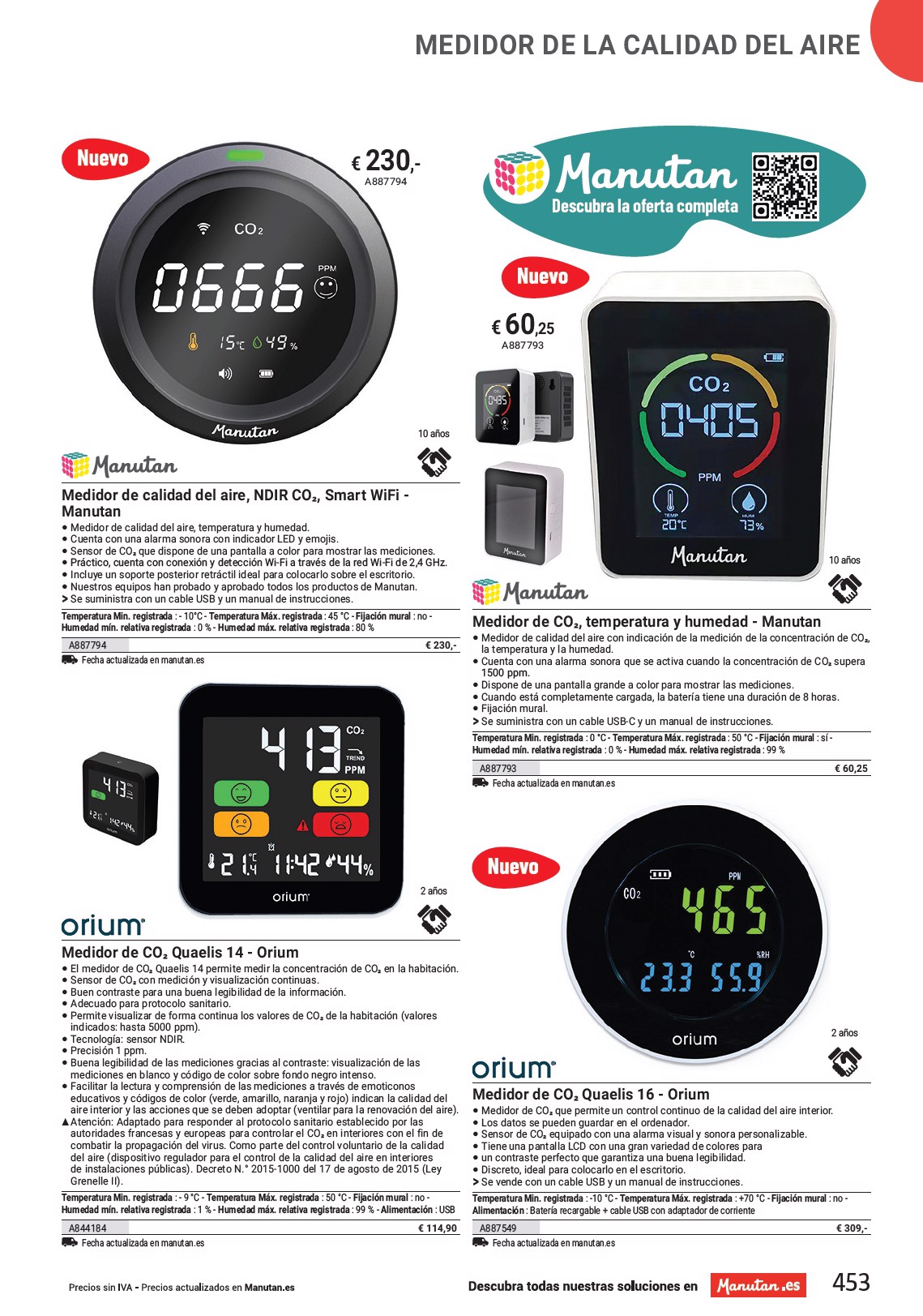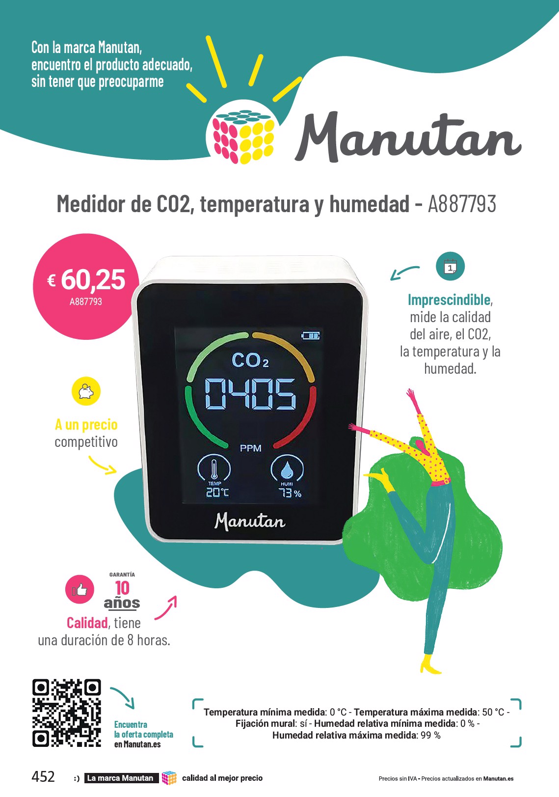 Con la marca Manutan, encuentro el producto adecuado, sin tener que preocuparme Medidor de CO2, temperatura y humedad - A887793 60,25 € A887793 A un precio competitivo Imprescindible , mide la calidad del aire, el CO2, la temperatura y la humedad. añ 10 os GARANTÍA Calidad , tiene una duración de 8 horas. 452 Encuentra la oferta completa en Manutan.es Temperatura mínima medida : 0 °C - Temperatura máxima medida : 50 °C - Fijación mural : sí - Humedad relativa mínima medida : 0 % - Humedad relativa máxima medida : 99 %