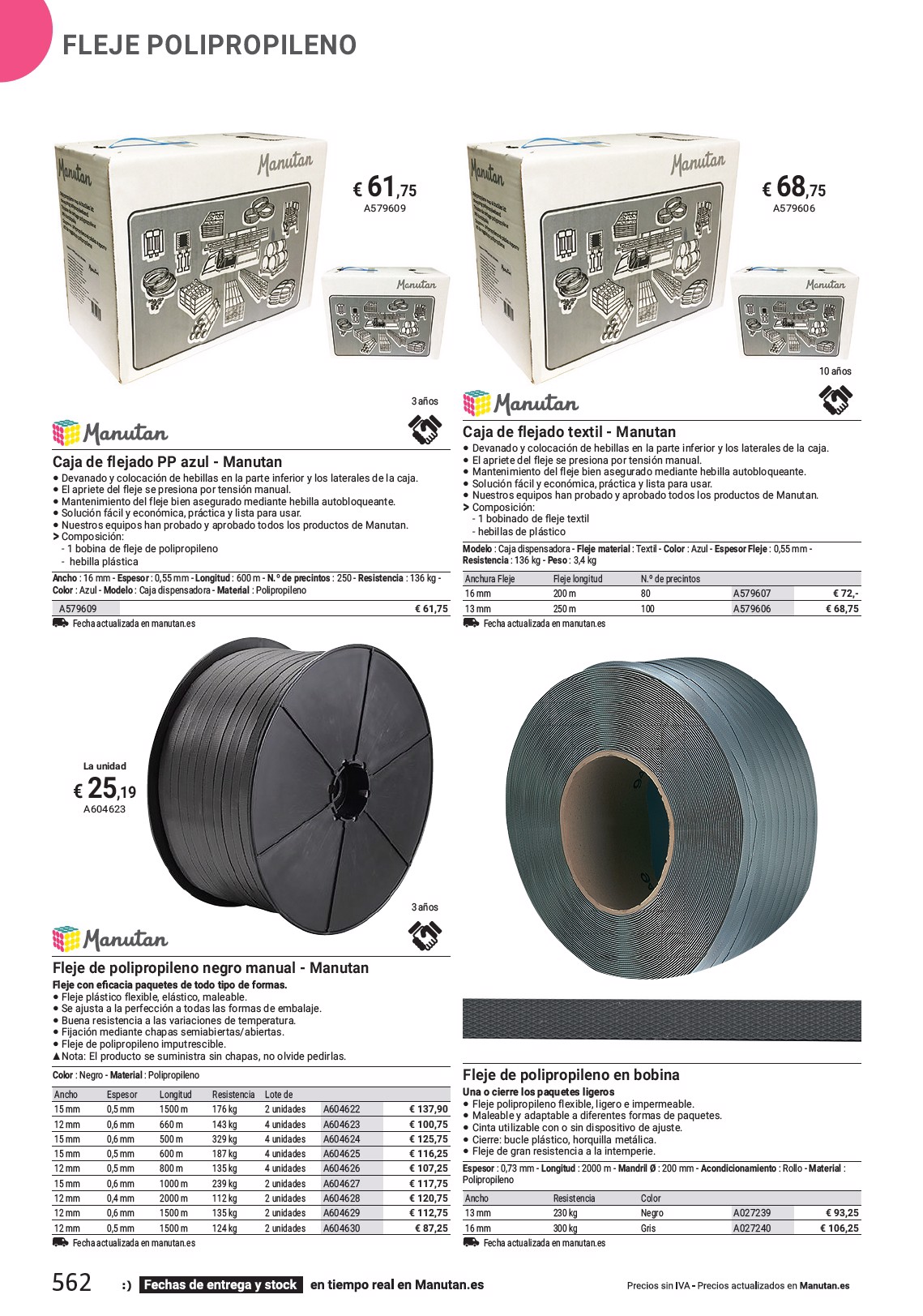 Descubra la oferta completa A partir de 128 € ,75 A172918 Fabricado en la UE FLEJE DE POLIÉSTER 3 años Fleje de poliéster de alta resistencia - Manutan Dele prioridad a este fleje para sus cargas pesadas y el almacenamiento de larga duración • Fleje de alta resistencia a la ruptura incluidos los ángulos salientes. • Débil alargamiento y buena absorción con excelente elasticidad. • Insensible a las variaciones de temperatura y humedad. • Fleje de poliéster flexible de manipulación fácil. • Resistente a la abrasión y a la corrosión. • Nuestros equipos han probado y aprobado todos los productos de Manutan. O La bobina se vende por unidad. 100 % reciclable Mandril Ø : 406 mm - Anchura Bobina : 147 mm - Color : Verde - Tipo : Relieve - Temperatura de almacenaje mín. : -10 °C - Temperatura de almacenaje máx. : +70 °C Ancho Espesor Longitud 12,5 mm 0,55 mm 2500 m 12,5 mm 0,6 mm 2500 m 15,5 mm 0,6 mm 1800 m 16 mm 0,8 mm 1200 m Fecha actualizada en manutan.es Resistencia 250 kg 300 kg 370 kg 550 kg A172918 A172917 A172916 A172915 € 128,75 € 148,75 € 134,- € 139,75 Kit de flejado móvil - Fleje de poliéster • Kit de flejado completo y resistente para fleje de poliéster. • Dispensador de herramientas de flejado con ruedas de goma. • Disco de acero ancho para bobina compatible con todos los flejes. • Combinado manual tensor-engastador-cortador, posibilidad de uso en vertical. O Composición: - 1 dispensador móvil - 2 bobinas de fleje de poliéster - 1 combinado manual tensor-engastador OR4000 - 1000 chapas de acero ORP SS Atención, con el combinado tensor-engastador OR4000, utilice únicamente las chapas semiabiertas ORP. Modelo : Dispensador con ruedas - Fleje material : Poliéster - Anchura Fleje : 16 mm - Fleje longitud : 1800 m - Espesor Fleje : 0,6 mm - Resistencia : 370 kg - Peso : 49,3 kg A023710 Fecha actualizada en manutan.es € 1789,- Fabricado en el Reino Unido Fleje de plástico - Hebilla de plástico Para fleje anchura : 12 mm - Ancho : 12 mm Se venden en lotes de : 1000 unidades A006863 Fecha actualizada en manutan.es fleje con bucle de cierre (el fleje se pide por separado) € 35,90 Fleje de plástico - Hebilla de plástico Quickstrap Color : Negro Se venden en lotes de : 1000 unidades Para fleje anchura Ancho 13 mm 13 mm 16 mm 16 mm Fecha actualizada en manutan.es A006861 A006862 € 30,50 € 31,25 563