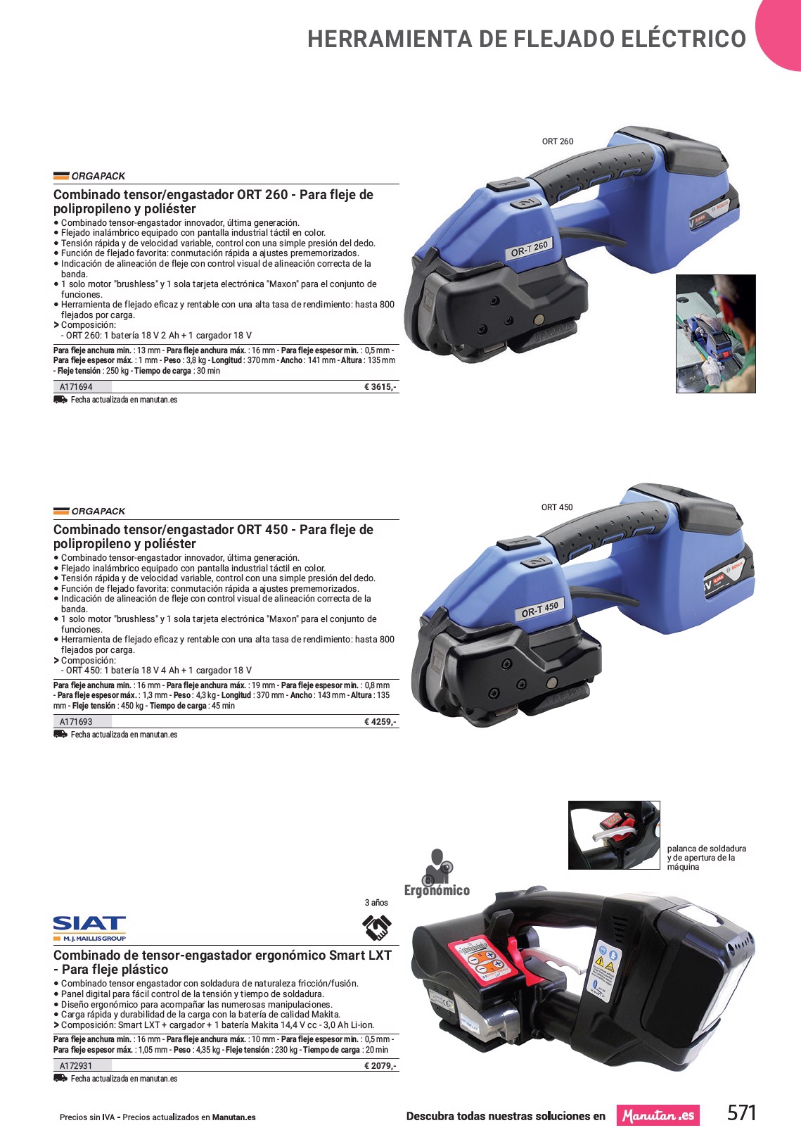 HERRAMIENTA DE FLEJADO ELÉCTRICO Combinado tensor/engastador ORT 260 - Para fleje de polipropileno y poliéster • Combinado tensor-engastador innovador, última generación. • Flejado inalámbrico equipado con pantalla industrial táctil en color. • Tensión rápida y de velocidad variable, control con una simple presión del dedo. • Función de flejado favorita: conmutación rápida a ajustes prememorizados. • Indicación de alineación de fleje con control visual de alineación correcta de la banda. • 1 solo motor "brushless" y 1 sola tarjeta electrónica "Maxon" para el conjunto de funciones. • Herramienta de flejado eficaz y rentable con una alta tasa de rendimiento: hasta 800 flejados por carga. O Composición: - ORT 260: 1 batería 18 V 2 Ah + 1 cargador 18 V Para fleje anchura min. : 13 mm - Para fleje anchura máx. : 16 mm - Para fleje espesor min. : 0,5 mm - Para fleje espesor máx. : 1 mm - Peso : 3,8 kg - Longitud : 370 mm - Ancho : 141 mm - Altura : 135 mm - Fleje tensión : 250 kg - Tiempo de carga : 30 min A171694 Fecha actualizada en manutan.es € 3615,- ORT 260 Combinado tensor/engastador ORT 450 - Para fleje de polipropileno y poliéster • Combinado tensor-engastador innovador, última generación. • Flejado inalámbrico equipado con pantalla industrial táctil en color. • Tensión rápida y de velocidad variable, control con una simple presión del dedo. • Función de flejado favorita: conmutación rápida a ajustes prememorizados. • Indicación de alineación de fleje con control visual de alineación correcta de la banda. • 1 solo motor "brushless" y 1 sola tarjeta electrónica "Maxon" para el conjunto de funciones. • Herramienta de flejado eficaz y rentable con una alta tasa de rendimiento: hasta 800 flejados por carga. O Composición: - ORT 450: 1 batería 18 V 4 Ah + 1 cargador 18 V Para fleje anchura min. : 16 mm - Para fleje anchura máx. : 19 mm - Para fleje espesor min. : 0,8 mm - Para fleje espesor máx. : 1,3 mm - Peso : 4,3 kg - Longitud : 370 mm - Ancho : 143 mm - Altura : 135 mm - Fleje tensión : 450 kg - Tiempo de carga : 45 min A171693 Fecha actualizada en manutan.es € 4259,- ORT 450 Ergonómico 3 años Combinado de tensor-engastador ergonómico Smart LXT - Para fleje plástico • Combinado tensor engastador con soldadura de naturaleza fricción/fusión. • Panel digital para fácil control de la tensión y tiempo de soldadura. • Diseño ergonómico para acompañar las numerosas manipulaciones. • Carga rápida y durabilidad de la carga con la batería de calidad Makita. O Composición: Smart LXT + cargador + 1 batería Makita 14,4 V cc - 3,0 Ah Li-ion. Para fleje anchura min. : 16 mm - Para fleje anchura máx. : 10 mm - Para fleje espesor min. : 0,5 mm - Para fleje espesor máx. : 1,05 mm - Peso : 4,35 kg - Fleje tensión : 230 kg - Tiempo de carga : 20 min A172931 Fecha actualizada en manutan.es € 2079,- palanca de soldadura y de apertura de la máquina 571