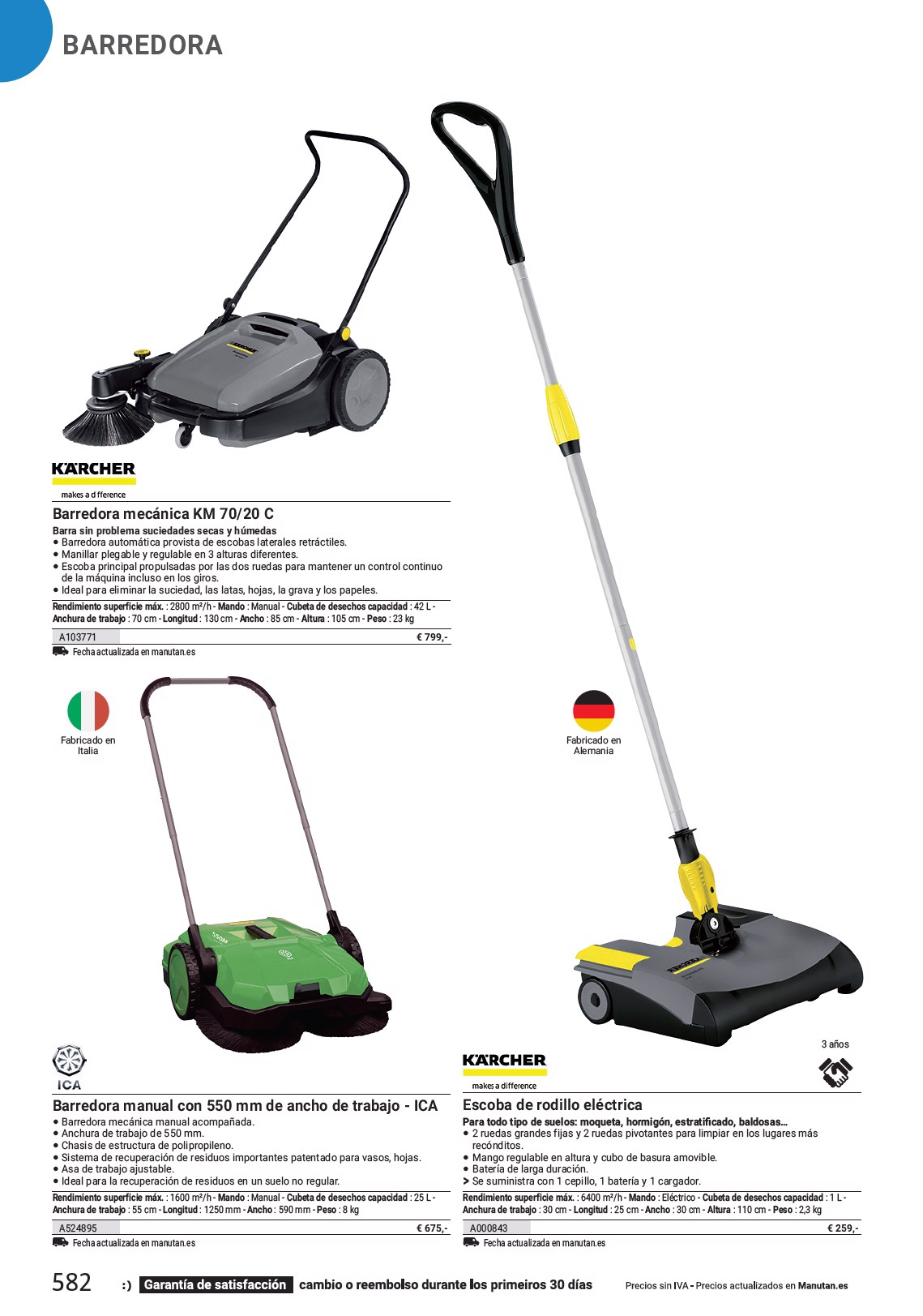 BARREDORA Barredora mecánica KM 70/20 C Barra sin problema suciedades secas y húmedas • Barredora automática provista de escobas laterales retráctiles. • Manillar plegable y regulable en 3 alturas diferentes. • Escoba principal propulsadas por las dos ruedas para mantener un control continuo de la máquina incluso en los giros. • Ideal para eliminar la suciedad, las latas, hojas, la grava y los papeles. Rendimiento superficie máx. : 2800 m²/h - Mando : Manual - Cubeta de desechos capacidad : 42 L - Anchura de trabajo : 70 cm - Longitud : 130 cm - Ancho : 85 cm - Altura : 105 cm - Peso : 23 kg A103771 Fecha actualizada en manutan.es € 799,- Fabricado en Italia Fabricado en Alemania 3 años Barredora manual con 550 mm de ancho de trabajo - ICA • Barredora mecánica manual acompañada. • Anchura de trabajo de 550 mm. • Chasis de estructura de polipropileno. • Sistema de recuperación de residuos importantes patentado para vasos, hojas. • Asa de trabajo ajustable. • Ideal para la recuperación de residuos en un suelo no regular. Rendimiento superficie máx. : 1600 m²/h - Mando : Manual - Cubeta de desechos capacidad : 25 L - Anchura de trabajo : 55 cm - Longitud : 1250 mm - Ancho : 590 mm - Peso : 8 kg A524895 Fecha actualizada en manutan.es € 675,- Escoba de rodillo eléctrica Para todo tipo de suelos: moqueta, hormigón, estratificado, baldosas… • 2 ruedas grandes fijas y 2 ruedas pivotantes para limpiar en los lugares más recónditos. • Mango regulable en altura y cubo de basura amovible. • Batería de larga duración. O Se suministra con 1 cepillo, 1 batería y 1 cargador. Rendimiento superficie máx. : 6400 m²/h - Mando : Eléctrico - Cubeta de desechos capacidad : 1 L - Anchura de trabajo : 30 cm - Longitud : 25 cm - Ancho : 30 cm - Altura : 110 cm - Peso : 2,3 kg A000843 Fecha actualizada en manutan.es € 259,- 582