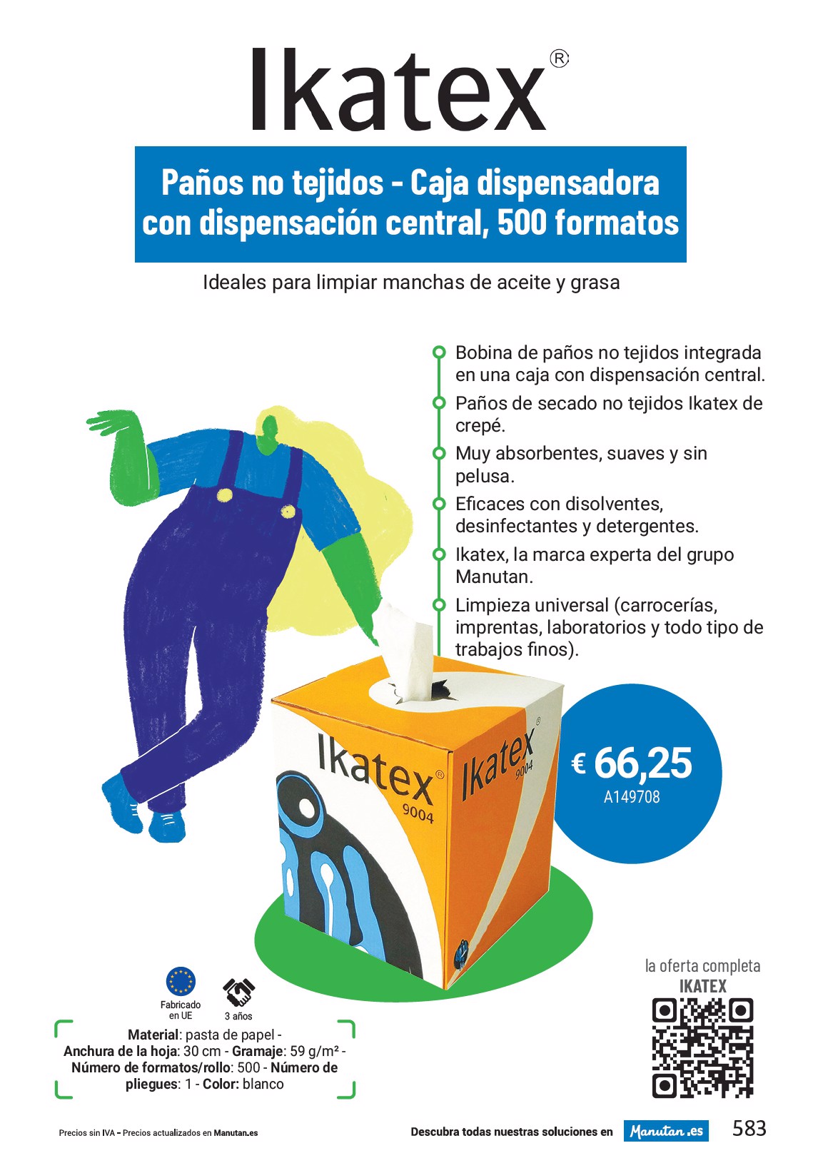 Paños no tejidos - Caja dispensadora con dispensación central, 500 formatos Ideales para limpiar manchas de aceite y grasa Bobina de paños no tejidos integrada en una caja con dispensación central. Paños de secado no tejidos Ikatex de crepé. Muy absorbentes, suaves y sin pelusa. Eficaces con disolventes, desinfectantes y detergentes. Ikatex, la marca experta del grupo Manutan. Limpieza universal (carrocerías, imprentas, laboratorios y todo tipo de trabajos finos). 66,25 € A149708 Fabricado en UE 3 años Material : pasta de papel - Anchura de la hoja : 30 cm - Gramaje : 59 g/m² - Número de formatos/rollo : 500 - Número de pliegues : 1 - Color: blanco la oferta completa IKATEX 583