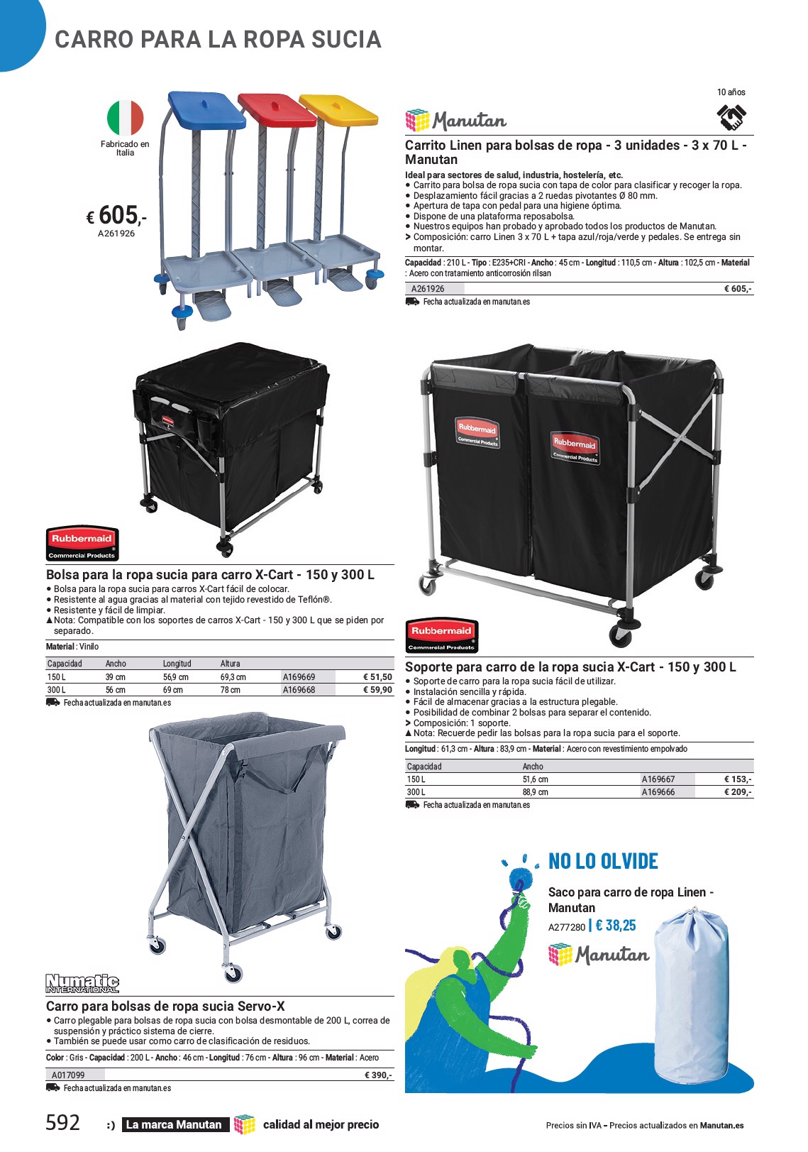 CARRO PARA LA ROPA SUCIA 10 años Fabricado en Italia 605 € ,- A261926 Carrito Linen para bolsas de ropa - 3 unidades - 3 x 70 L - Manutan Ideal para sectores de salud, industria, hostelería, etc. • Carrito para bolsa de ropa sucia con tapa de color para clasificar y recoger la ropa. • Desplazamiento fácil gracias a 2 ruedas pivotantes Ø 80 mm. • Apertura de tapa con pedal para una higiene óptima. • Dispone de una plataforma reposabolsa. • Nuestros equipos han probado y aprobado todos los productos de Manutan. O Composición: carro Linen 3 x 70 L + tapa azul/roja/verde y pedales. Se entrega sin montar. Capacidad : 210 L - Tipo : E235+CRI - Ancho : 45 cm - Longitud : 110,5 cm - Altura : 102,5 cm - Material : Acero con tratamiento anticorrosión rilsan A261926 Fecha actualizada en manutan.es € 605,- Bolsa para la ropa sucia para carro X-Cart - 150 y 300 L • Bolsa para la ropa sucia para carros X-Cart fácil de colocar. • Resistente al agua gracias al material con tejido revestido de Teflón®. • Resistente y fácil de limpiar. SS Nota: Compatible con los soportes de carros X-Cart - 150 y 300 L que se piden por separado. Material : Vinilo Capacidad Ancho Longitud 150 L 39 cm 56,9 cm 300 L 56 cm 69 cm Fecha actualizada en manutan.es Altura 69,3 cm 78 cm A169669 A169668 € 51,50 € 59,90 Soporte para carro de la ropa sucia X-Cart - 150 y 300 L • Soporte de carro para la ropa sucia fácil de utilizar. • Instalación sencilla y rápida. • Fácil de almacenar gracias a la estructura plegable. • Posibilidad de combinar 2 bolsas para separar el contenido. O Composición: 1 soporte. SS Nota: Recuerde pedir las bolsas para la ropa sucia para el soporte. Longitud : 61,3 cm - Altura : 83,9 cm - Material : Acero con revestimiento empolvado Capacidad Ancho 150 L 51,6 cm 300 L 88,9 cm Fecha actualizada en manutan.es A169667 A169666 € 153,- € 209,- NO LO OLVIDE Saco para carro de ropa Linen - Manutan A277280 | € 38,25 Carro para bolsas de ropa sucia Servo-X • Carro plegable para bolsas de ropa sucia con bolsa desmontable de 200 L, correa de suspensión y práctico sistema de cierre. • También se puede usar como carro de clasificación de residuos. Color : Gris - Capacidad : 200 L - Ancho : 46 cm - Longitud : 76 cm - Altura : 96 cm - Material : Acero A017099 Fecha actualizada en manutan.es € 390,- 592