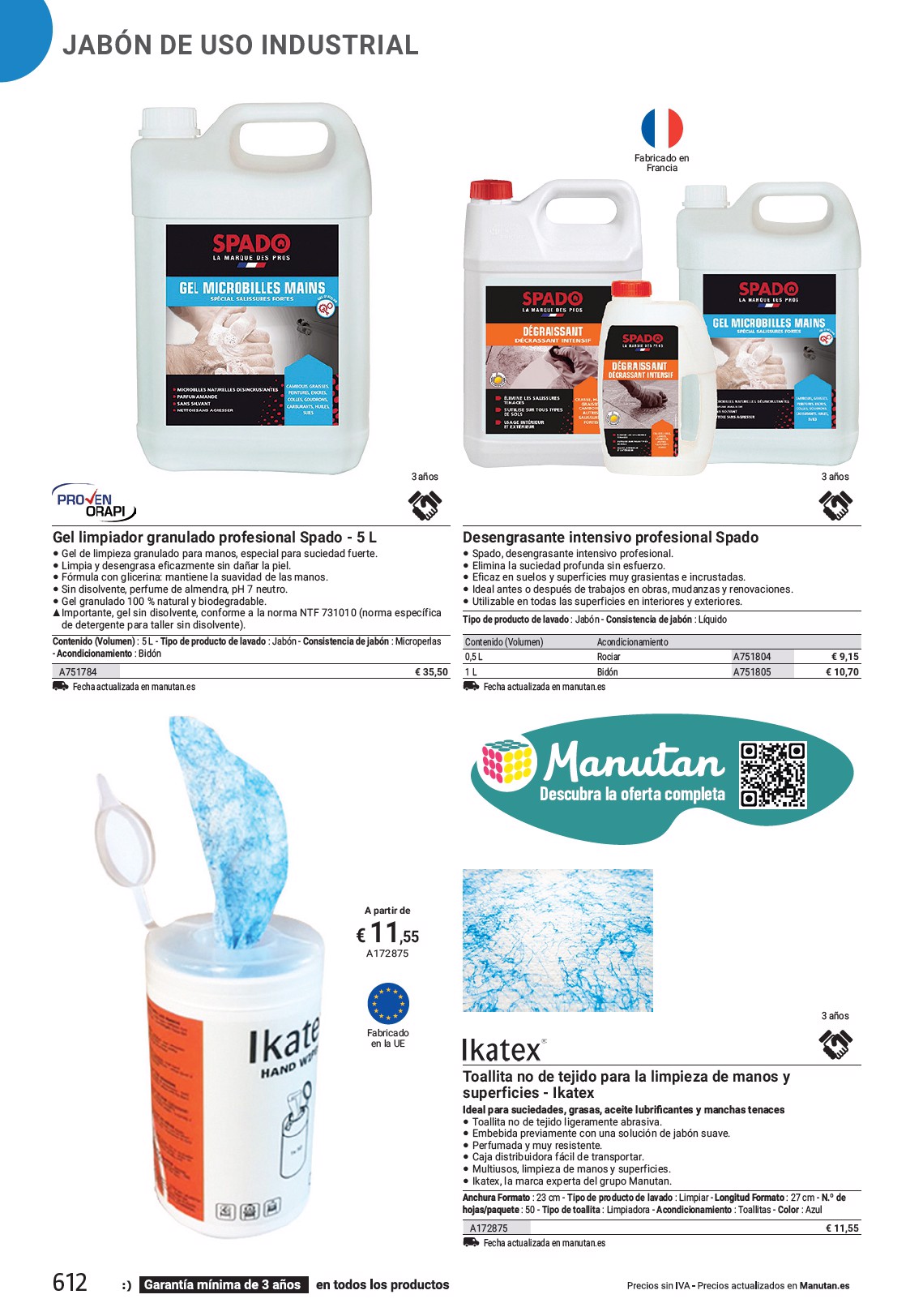 JABÓN DE USO INDUSTRIAL Fabricado en Francia 3 años 3 años Gel limpiador granulado profesional Spado - 5 L • Gel de limpieza granulado para manos, especial para suciedad fuerte. • Limpia y desengrasa eficazmente sin dañar la piel. • Fórmula con glicerina: mantiene la suavidad de las manos. • Sin disolvente, perfume de almendra, pH 7 neutro. • Gel granulado 100 % natural y biodegradable. SS Importante, gel sin disolvente, conforme a la norma NTF 731010 (norma específica de detergente para taller sin disolvente). Contenido (Volumen) : 5 L - Tipo de producto de lavado : Jabón - Consistencia de jabón : Microperlas - Acondicionamiento : Bidón A751784 € 35,50 Fecha actualizada en manutan.es Desengrasante intensivo profesional Spado • Spado, desengrasante intensivo profesional. • Elimina la suciedad profunda sin esfuerzo. • Eficaz en suelos y superficies muy grasientas e incrustadas. • Ideal antes o después de trabajos en obras, mudanzas y renovaciones. • Utilizable en todas las superficies en interiores y exteriores. Tipo de producto de lavado : Jabón - Consistencia de jabón : Líquido Contenido (Volumen) Acondicionamiento 0,5 L Rociar 1 L Bidón Fecha actualizada en manutan.es A751804 A751805 € 9,15 € 10,70 Descubra la oferta completa 612 11 A partir de € ,55 A172875 Fabricado en la UE 3 años Toallita no de tejido para la limpieza de manos y superficies - Ikatex Ideal para suciedades, grasas, aceite lubrificantes y manchas tenaces • Toallita no de tejido ligeramente abrasiva. • Embebida previamente con una solución de jabón suave. • Perfumada y muy resistente. • Caja distribuidora fácil de transportar. • Multiusos, limpieza de manos y superficies. • Ikatex, la marca experta del grupo Manutan. Anchura Formato : 23 cm - Tipo de producto de lavado : Limpiar - Longitud Formato : 27 cm - N.º de hojas/paquete : 50 - Tipo de toallita : Limpiadora - Acondicionamiento : Toallitas - Color : Azul A172875 € 11,55 Fecha actualizada en manutan.es