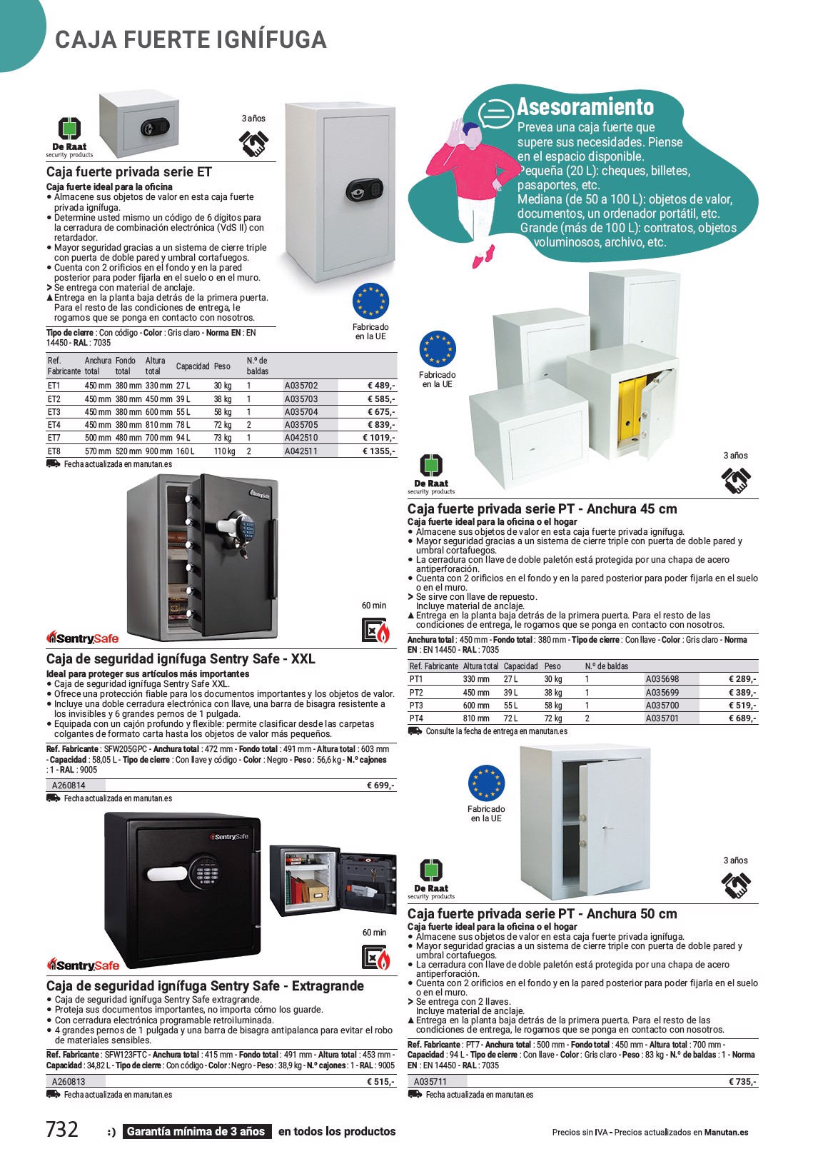 CAJA FUERTE IGNÍFUGA 3 años Caja fuerte privada serie ET Caja fuerte ideal para la oficina • Almacene sus objetos de valor en esta caja fuerte privada ignífuga. • Determine usted mismo un código de 6 dígitos para la cerradura de combinación electrónica (VdS II) con retardador. • Mayor seguridad gracias a un sistema de cierre triple con puerta de doble pared y umbral cortafuegos. • Cuenta con 2 orificios en el fondo y en la pared posterior para poder fijarla en el suelo o en el muro. O Se entrega con material de anclaje. SS Entrega en la planta baja detrás de la primera puerta. Para el resto de las condiciones de entrega, le rogamos que se ponga en contacto con nosotros. Tipo de cierre : Con código - Color : Gris claro - Norma EN : EN 14450 - RAL : 7035 Ref. Anchura Fondo Altura Fabricante total total total ET1 450 mm 380 mm 330 mm ET2 450 mm 380 mm 450 mm ET3 450 mm 380 mm 600 mm ET4 450 mm 380 mm 810 mm ET7 500 mm 480 mm 700 mm ET8 570 mm 520 mm 900 mm Fecha actualizada en manutan.es Capacidad 27 L 39 L 55 L 78 L 94 L 160 L Peso 30 kg 38 kg 58 kg 72 kg 73 kg 110 kg N.º de baldas 1 1 1 2 1 2 A035702 A035703 A035704 A035705 A042510 A042511 Fabricado en la UE € 489,- € 585,- € 675,- € 839,- € 1019,- € 1355,- Fabricado en la UE Asesoramiento Prevea una caja fuerte que supere sus necesidades. Piense en el espacio disponible. Pequeña (20 L): cheques, billetes, pasaportes, etc. Mediana (de 50 a 100 L): objetos de valor, documentos, un ordenador portátil, etc. Grande (más de 100 L): contratos, objetos voluminosos, archivo, etc. 3 años 60 min Caja de seguridad ignífuga Sentry Safe - XXL Ideal para proteger sus artículos más importantes • Caja de seguridad ignífuga Sentry Safe XXL. • Ofrece una protección fiable para los documentos importantes y los objetos de valor. • Incluye una doble cerradura electrónica con llave, una barra de bisagra resistente a los invisibles y 6 grandes pernos de 1 pulgada. • Equipada con un cajón profundo y flexible: permite clasificar desde las carpetas colgantes de formato carta hasta los objetos de valor más pequeños. Ref. Fabricante : SFW205GPC - Anchura total : 472 mm - Fondo total : 491 mm - Altura total : 603 mm - Capacidad : 58,05 L - Tipo de cierre : Con llave y código - Color : Negro - Peso : 56,6 kg - N.º cajones : 1 - RAL : 9005 A260814 Fecha actualizada en manutan.es € 699,- Caja fuerte privada serie PT - Anchura 45 cm Caja fuerte ideal para la oficina o el hogar • Almacene sus objetos de valor en esta caja fuerte privada ignífuga. • Mayor seguridad gracias a un sistema de cierre triple con puerta de doble pared y umbral cortafuegos. • La cerradura con llave de doble paletón está protegida por una chapa de acero antiperforación. • Cuenta con 2 orificios en el fondo y en la pared posterior para poder fijarla en el suelo o en el muro. O Se sirve con llave de repuesto. Incluye material de anclaje. SS Entrega en la planta baja detrás de la primera puerta. Para el resto de las condiciones de entrega, le rogamos que se ponga en contacto con nosotros. Anchura total : 450 mm - Fondo total : 380 mm - Tipo de cierre : Con llave - Color : Gris claro - Norma EN : EN 14450 - RAL : 7035 Ref. Fabricante Altura total Capacidad Peso PT1 330 mm 27 L 30 kg PT2 450 mm 39 L 38 kg PT3 600 mm 55 L 58 kg PT4 810 mm 72 L 72 kg Consulte la fecha de entrega en manutan.es N.º de baldas 1 1 1 2 A035698 A035699 A035700 A035701 € 289,- € 389,- € 519,- € 689,- Fabricado en la UE 3 años 60 min Caja de seguridad ignífuga Sentry Safe - Extragrande • Caja de seguridad ignífuga Sentry Safe extragrande. • Proteja sus documentos importantes, no importa cómo los guarde. • Con cerradura electrónica programable retroiluminada. • 4 grandes pernos de 1 pulgada y una barra de bisagra antipalanca para evitar el robo de materiales sensibles. Ref. Fabricante : SFW123FTC - Anchura total : 415 mm - Fondo total : 491 mm - Altura total : 453 mm - Capacidad : 34,82 L - Tipo de cierre : Con código - Color : Negro - Peso : 38,9 kg - N.º cajones : 1 - RAL : 9005 A260813 Fecha actualizada en manutan.es € 515,- Caja fuerte privada serie PT - Anchura 50 cm Caja fuerte ideal para la oficina o el hogar • Almacene sus objetos de valor en esta caja fuerte privada ignífuga. • Mayor seguridad gracias a un sistema de cierre triple con puerta de doble pared y umbral cortafuegos. • La cerradura con llave de doble paletón está protegida por una chapa de acero antiperforación. • Cuenta con 2 orificios en el fondo y en la pared posterior para poder fijarla en el suelo o en el muro. O Se entrega con 2 llaves. Incluye material de anclaje. SS Entrega en la planta baja detrás de la primera puerta. Para el resto de las condiciones de entrega, le rogamos que se ponga en contacto con nosotros. Ref. Fabricante : PT7 - Anchura total : 500 mm - Fondo total : 450 mm - Altura total : 700 mm - Capacidad : 94 L - Tipo de cierre : Con llave - Color : Gris claro - Peso : 83 kg - N.º de baldas : 1 - Norma EN : EN 14450 - RAL : 7035 A035711 Fecha actualizada en manutan.es € 735,- 732
