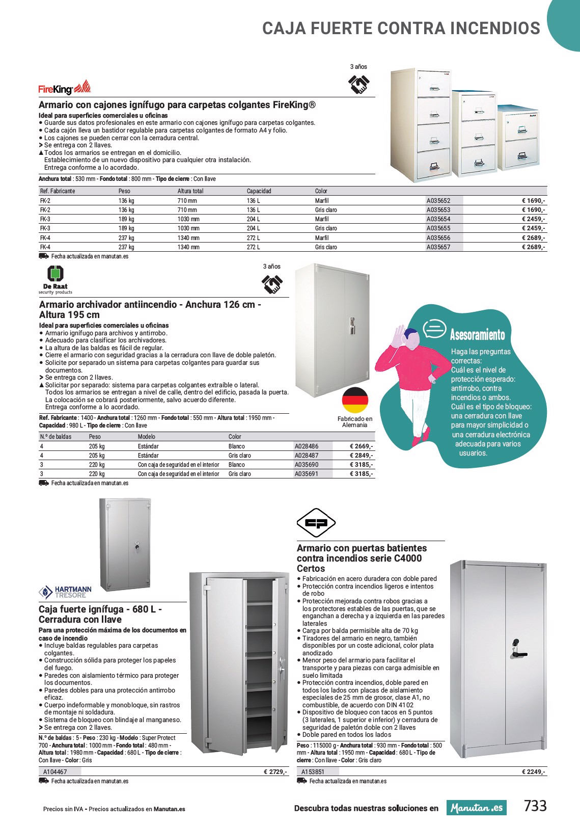 CAJA FUERTE CONTRA INCENDIOS 3 años Armario con cajones ignífugo para carpetas colgantes FireKing® Ideal para superficies comerciales u oficinas • Guarde sus datos profesionales en este armario con cajones ignífugo para carpetas colgantes. • Cada cajón lleva un bastidor regulable para carpetas colgantes de formato A4 y folio. • Los cajones se pueden cerrar con la cerradura central. O Se entrega con 2 llaves. SS Todos los armarios se entregan en el domicilio. Establecimiento de un nuevo dispositivo para cualquier otra instalación. Entrega conforme a lo acordado. Anchura total : 530 mm - Fondo total : 800 mm - Tipo de cierre : Con llave Ref. Fabricante Peso FK-2 136 kg FK-2 136 kg FK-3 189 kg FK-3 189 kg FK-4 237 kg FK-4 237 kg Fecha actualizada en manutan.es Altura total 710 mm 710 mm 1030 mm 1030 mm 1340 mm 1340 mm Capacidad 136 L 136 L 204 L 204 L 272 L 272 L 3 años Color Marfil Gris claro Marfil Gris claro Marfil Gris claro A035652 A035653 A035654 A035655 A035656 A035657 € 1690,- € 1690,- € 2459,- € 2459,- € 2689,- € 2689,- Armario archivador antiincendio - Anchura 126 cm - Altura 195 cm Ideal para superficies comerciales u oficinas • Armario ignífugo para archivos y antirrobo. • Adecuado para clasificar los archivadores. • La altura de las baldas es fácil de regular. • Cierre el armario con seguridad gracias a la cerradura con llave de doble paletón. • Solicite por separado un sistema para carpetas colgantes para guardar sus documentos. O Se entrega con 2 llaves. SS Solicitar por separado: sistema para carpetas colgantes extraíble o lateral. Todos los armarios se entregan a nivel de calle, dentro del edificio, pasada la puerta. La colocación se cobrará posteriormente, salvo acuerdo diferente. Entrega conforme a lo acordado. Ref. Fabricante : 1400 - Anchura total : 1260 mm - Fondo total : 550 mm - Altura total : 1950 mm - Capacidad : 980 L - Tipo de cierre : Con llave N.º de baldas Peso 4 205 kg 4 205 kg 3 220 kg 3 220 kg Fecha actualizada en manutan.es Modelo Estándar Estándar Con caja de seguridad en el interior Con caja de seguridad en el interior Color Blanco Gris claro Blanco Gris claro A028486 A028487 A035690 A035691 Fabricado en Alemania € 2669,- € 2849,- € 3185,- € 3185,- Asesoramiento Haga las preguntas correctas: Cuál es el nivel de protección esperado: antirrobo, contra incendios o ambos. Cuál es el tipo de bloqueo: una cerradura con llave para mayor simplicidad o una cerradura electrónica adecuada para varios usuarios. Caja fuerte ignífuga - 680 L - Cerradura con llave Para una protección máxima de los documentos en caso de incendio • baldas regulables para carpetas colgantes. • Construcción sólida para proteger los papeles del fuego. • Paredes con aislamiento térmico para proteger los documentos. • Paredes dobles para una protección antirrobo eficaz. • Cuerpo indeformable y monobloque, sin rastros de montaje ni soldadura. • Sistema de bloqueo con blindaje al manganeso. O Se entrega con 2 llaves. N.º de baldas : 5 - Peso : 230 kg - Modelo : Super Protect 700 - Anchura total : 1000 mm - Fondo total : 480 mm - Altura total : 1980 mm - Capacidad : 680 L - Tipo de cierre : Con llave - Color : Gris A104467 Fecha actualizada en manutan.es € 2729,- Armario con puertas batientes contra incendios serie C4000 Certos • Fabricación en acero duradera con doble pared • Protección contra incendios ligeros e intentos de robo • Protección mejorada contra robos gracias a los protectores estables de las puertas, que se enganchan a derecha y a izquierda en las paredes laterales • Carga por balda permisible alta de 70 kg • Tiradores del armario en negro, también disponibles por un coste adicional, color plata anodizado • Menor peso del armario para facilitar el transporte y para piezas con carga admisible en suelo limitada • Protección contra incendios, doble pared en todos los lados con placas de aislamiento especiales de 25 mm de grosor, clase A1, no combustible, de acuerdo con DIN 4102 • Dispositivo de bloqueo con tacos en 5 puntos (3 laterales, 1 superior e inferior) y cerradura de seguridad de paletón doble con 2 llaves • Doble pared en todos los lados Peso : 115000 g - Anchura total : 930 mm - Fondo total : 500 mm - Altura total : 1950 mm - Capacidad : 680 L - Tipo de cierre : Con llave - Color : Gris claro A153851 Fecha actualizada en manutan.es € 2249,- 733