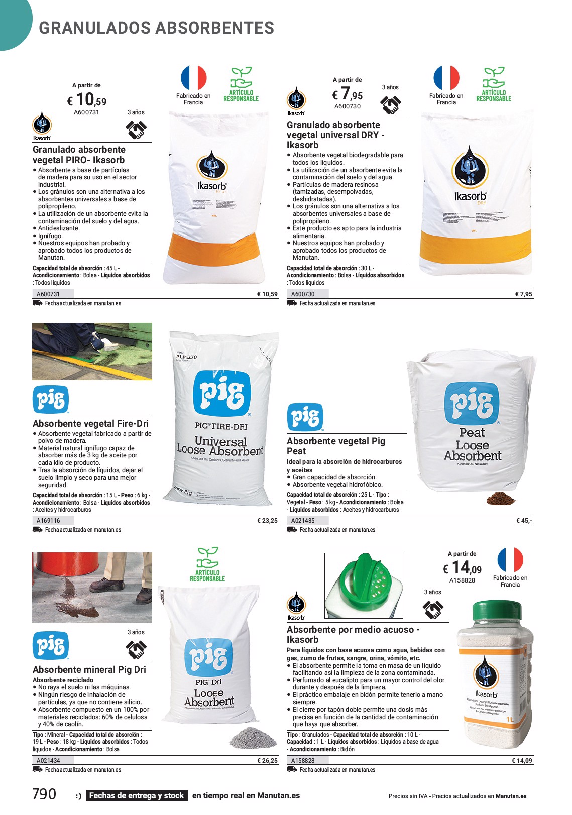 GRANULADOS ABSORBENTES € 10 A partir de ,59 A600731 3 años Fabricado en Francia Granulado absorbente vegetal PIRO- Ikasorb • Absorbente a base de partículas de madera para su uso en el sector industrial. • Los gránulos son una alternativa a los absorbentes universales a base de polipropileno. • La utilización de un absorbente evita la contaminación del suelo y del agua. • Antideslizante. • Ignífugo. • Nuestros equipos han probado y aprobado todos los productos de Manutan. Capacidad total de absorción : 45 L - Acondicionamiento : Bolsa - Líquidos absorbidos : Todos líquidos A600731 Fecha actualizada en manutan.es € 10,59 € 7 A partir de ,95 A600730 3 años Granulado absorbente vegetal universal DRY - Ikasorb • Absorbente vegetal biodegradable para todos los líquidos. • La utilización de un absorbente evita la contaminación del suelo y del agua. • Partículas de madera resinosa (tamizadas, desempolvadas, deshidratadas). • Los gránulos son alternativa a los absorbentes universales a base de polipropileno. • Este producto es apto para la industria alimentaria. • Nuestros equipos han probado y aprobado todos los productos de Manutan. Capacidad total de absorción : 30 L - Acondicionamiento : Bolsa - Líquidos absorbidos : Todos líquidos A600730 Fecha actualizada en manutan.es Fabricado en Francia € 7,95 Absorbente vegetal Fire-Dri • Absorbente vegetal fabricado a partir de polvo de madera. • Material natural ignífugo capaz de absorber más de 3 kg de aceite por cada kilo de producto. • Tras la absorción de líquidos, dejar el suelo limpio y seco para una mejor seguridad. Capacidad total de absorción : 15 L - Peso : 6 kg - Acondicionamiento : Bolsa - Líquidos absorbidos : Aceites y hidrocarburos A169116 Fecha actualizada en manutan.es 3 años Absorbente mineral Pig Dri Absorbente reciclado • No raya el suelo ni las máquinas. • Ningún riesgo de inhalación de partículas, ya que no contiene silicio. • Absorbente compuesto en un 100% por materiales reciclados: 60% de celulosa y 40% de caolín. Tipo : Mineral - Capacidad total de absorción : 19 L - Peso : 18 kg - Líquidos absorbidos : Todos líquidos - Acondicionamiento : Bolsa A021434 Fecha actualizada en manutan.es 790 € 23,25 Absorbente vegetal Pig Peat Ideal para la absorción de hidrocarburos y aceites • Gran capacidad de absorción. • Absorbente vegetal hidrofóbico. Capacidad total de absorción : 25 L - Tipo : Vegetal - Peso : 5 kg - Acondicionamiento : Bolsa - Líquidos absorbidos : Aceites y hidrocarburos A021435 Fecha actualizada en manutan.es € 45,- € 14 A partir de ,09 A158828 3 años Fabricado en Francia € 26,25 Absorbente por medio acuoso - Ikasorb Para líquidos con base acuosa como agua, bebidas con gas, zumo de frutas, sangre, orina, vómito, etc. • El absorbente permite la toma en masa de un líquido facilitando así la limpieza de la zona contaminada. • Perfumado al eucalipto para un mayor control del olor durante y después de la limpieza. • El práctico embalaje en bidón permite tenerlo a mano siempre. • El cierre por tapón doble permite una dosis más precisa en función de la cantidad de contaminación que haya que absorber. Tipo : Granulados - Capacidad total de absorción : 10 L - Capacidad : 1 L - Líquidos absorbidos : Líquidos a base de agua - Acondicionamiento : Bidón A158828 Fecha actualizada en manutan.es € 14,09