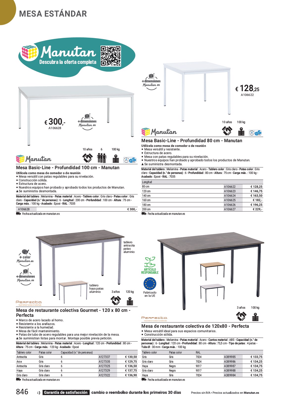 MESA ESTÁNDAR Descubra la oferta completa € 128 ,25 A106622 € 300 ,- A106628 10 años 100 kg 10 años 6 100 kg Mesa Basic-Line - Profundidad 100 cm - Manutan Utilícela como mesa de comedor o de reunión • Mesa versátil con patas regulables para su nivelación. • Construcción sólida. • Estructura de acero. • Nuestros equipos han probado y aprobado todos los productos de Manutan. SS Se suministra desmontada. Material del tablero : Melamina - Patas material : Acero - Tablero color : Gris claro - Patas color : Gris claro - Capacidad (n.° de personas) : 6 - Longitud : 200 cm - Profundidad : 100 cm - Altura : 75 cm - Carga máx. : 100 kg - Acabado : Epoxi - RAL : 7035 A106628 Fecha actualizada en manutan.es € 300,- Mesa Basic-Line - Profundidad 80 cm - Manutan Utilícela como mesa de comedor o de reunión • Mesa versátil y resistente. • Estructura de acero. • Mesa con patas regulables para su nivelación. • Nuestros equipos han probado y aprobado todos los productos de Manutan. SS Se suministra desmontada. Material del tablero : Melamina - Patas material : Acero - Tablero color : Gris claro - Patas color : Gris claro - Capacidad (n.° de personas) : 6 - Profundidad : 80 cm - Altura : 75 cm - Carga máx. : 100 kg - Acabado : Epoxi - RAL : 7035 Longitud 80 cm 120 cm 140 cm 160 cm 180 cm 200 cm Fecha actualizada en manutan.es A106622 A106623 A106624 A106625 A106626 A106627 € 128,25 € 146,75 € 163,50 € 182,- € 196,25 € 229,- tablero antracita patas aluminio tablero haya patas aluminio 3 años 120 kg Fabricado en la UE Mesa de restaurante colectiva Gourmet - 120 x 80 cm - Perfecta • Marco de acero lacado al horno. • Resistente a los arañazos. • Resistente a la humedad. • Mesa de fácil mantenimiento. • Patas de tubo de acero regulables para una mejor nivelación de la mesa. SS Se suministran listas para montar. Montaje posible previa petición. Material del tablero : Melamina - Patas material : Acero - Longitud : 120 cm - Profundidad : 80 cm - Altura : 75 cm - Carga máx. : 120 kg - Acabado : Epoxi Tablero color Patas color Capacidad (n.° de personas) Antracita Gris 6 Arce Gris 6 Antracita Gris claro 6 Haya Gris claro 6 Gris claro Gris claro 6 Fecha actualizada en manutan.es A127337 A127335 A127325 A127329 A127322 € 130,50 € 129,75 € 136,50 € 137,75 € 136,90 3 años 100 kg Mesa de restaurante colectiva de 120x80 - Perfecta • Mesa versátil ideal para sus espacios comunitarios. • Construcción sólida. Material del tablero : Melamina - Patas material : Acero - Cantos material : ABS - Capacidad (n.° de personas) : 6 - Longitud : 120 cm - Profundidad : 80 cm - Altura : 73,5 cm - Tipo de patas : 4 patas - Tubo Ø : 30 mm - Carga máx. : 100 kg Tablero color Patas color RAL Gris Gris 7024 Gris claro Gris 7024 Haya Negro 9017 Gris claro Negro 9017 Haya Gris 7024 Fecha actualizada en manutan.es A389985 A389986 A389987 A389988 A389984 € 133,75 € 134,25 € 134,75 € 134,25 € 134,75 846