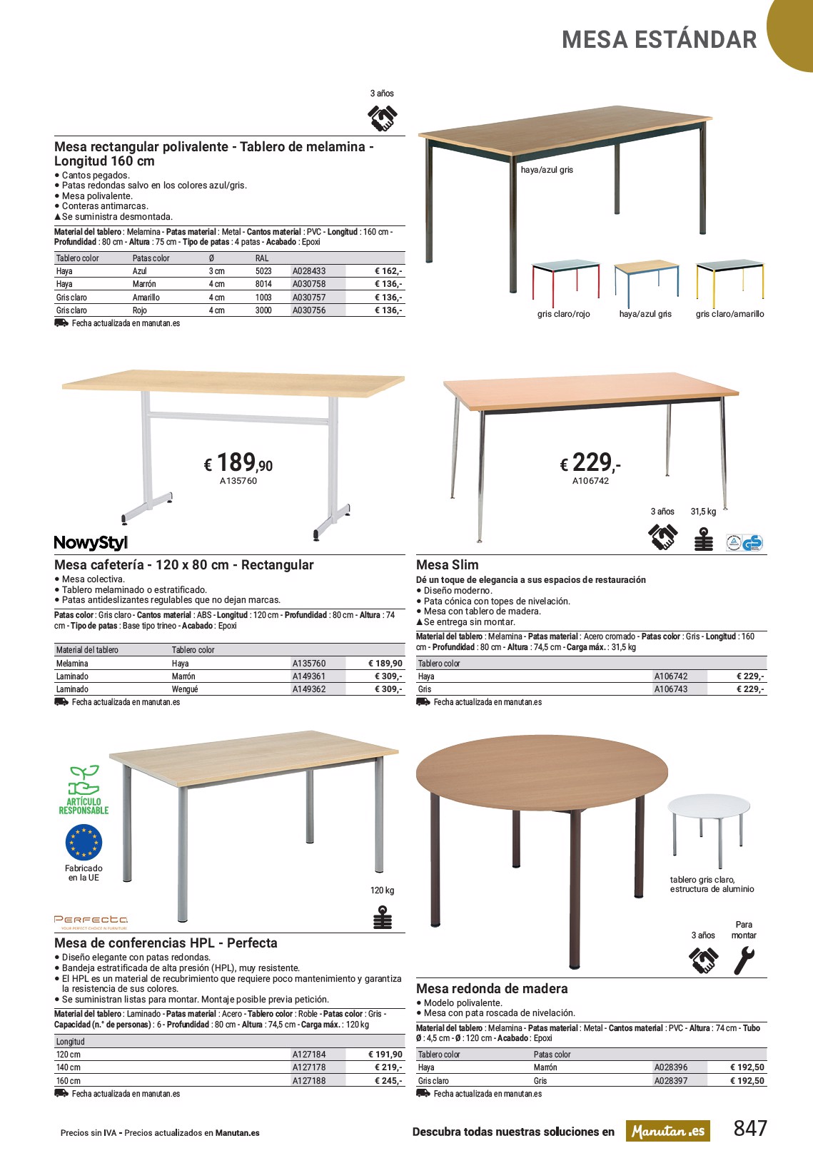 3 años Mesa rectangular polivalente - Tablero de melamina - Longitud 160 cm • Cantos pegados. • Patas redondas salvo en los colores azul/gris. • Mesa polivalente. • Conteras antimarcas. SS Se suministra desmontada. Material del tablero : Melamina - Patas material : Metal - Cantos material : PVC - Longitud : 160 cm - Profundidad : 80 cm - Altura : 75 cm - Tipo de patas : 4 patas - Acabado : Epoxi Tablero color Patas color Ø RAL Haya Azul 3 cm 5023 A028433 Haya Marrón 4 cm 8014 A030758 Gris claro Amarillo 4 cm 1003 A030757 Gris claro Rojo 4 cm 3000 A030756 Fecha actualizada en manutan.es € 162,- € 136,- € 136,- € 136,- MESA ESTÁNDAR haya/azul gris gris claro/rojo haya/azul gris gris claro/amarillo € 189 ,90 A135760 € 229 ,- A106742 3 años 31,5 kg Mesa cafetería - 120 x 80 cm - Rectangular • Mesa colectiva. • Tablero melaminado o estratificado. • Patas antideslizantes regulables que no dejan marcas. Patas color : Gris claro - Cantos material : ABS - Longitud : 120 cm - Profundidad : 80 cm - Altura : 74 cm - Tipo de patas : Base tipo trineo - Acabado : Epoxi Material del tablero Tablero color Melamina Haya Laminado Marrón Laminado Wengué Fecha actualizada en manutan.es A135760 A149361 A149362 € 189,90 € 309,- € 309,- Mesa Slim Dé un toque de elegancia a sus espacios de restauración • Diseño moderno. • Pata cónica con topes de nivelación. • Mesa con tablero de madera. SS Se entrega sin montar. Material del tablero : Melamina - Patas material : Acero cromado - Patas color : Gris - Longitud : 160 cm - Profundidad : 80 cm - Altura : 74,5 cm - Carga máx. : 31,5 kg Tablero color Haya Gris Fecha actualizada en manutan.es A106742 A106743 € 229,- € 229,- Fabricado en la UE 120 kg tablero gris claro, estructura de aluminio Mesa de conferencias HPL - Perfecta • Diseño elegante con patas redondas. • Bandeja estratificada de alta presión (HPL), muy resistente. • El HPL es un material de recubrimiento que requiere poco mantenimiento y garantiza la resistencia de sus colores. • Se suministran listas para montar. Montaje posible previa petición. Material del tablero : Laminado - Patas material : Acero - Tablero color : Roble - Patas color : Gris - Capacidad (n.° de personas) : 6 - Profundidad : 80 cm - Altura : 74,5 cm - Carga máx. : 120 kg Longitud 120 cm 140 cm 160 cm Fecha actualizada en manutan.es A127184 A127178 A127188 € 191,90 € 219,- € 245,- 3 años Para montar Mesa redonda de madera • Modelo polivalente. • Mesa con pata roscada de nivelación. Material del tablero : Melamina - Patas material : Metal - Cantos material : PVC - Altura : 74 cm - Tubo Ø : 4,5 cm - Ø : 120 cm - Acabado : Epoxi Tablero color Patas color Haya Marrón Gris claro Gris Fecha actualizada en manutan.es A028396 A028397 € 192,50 € 192,50 847