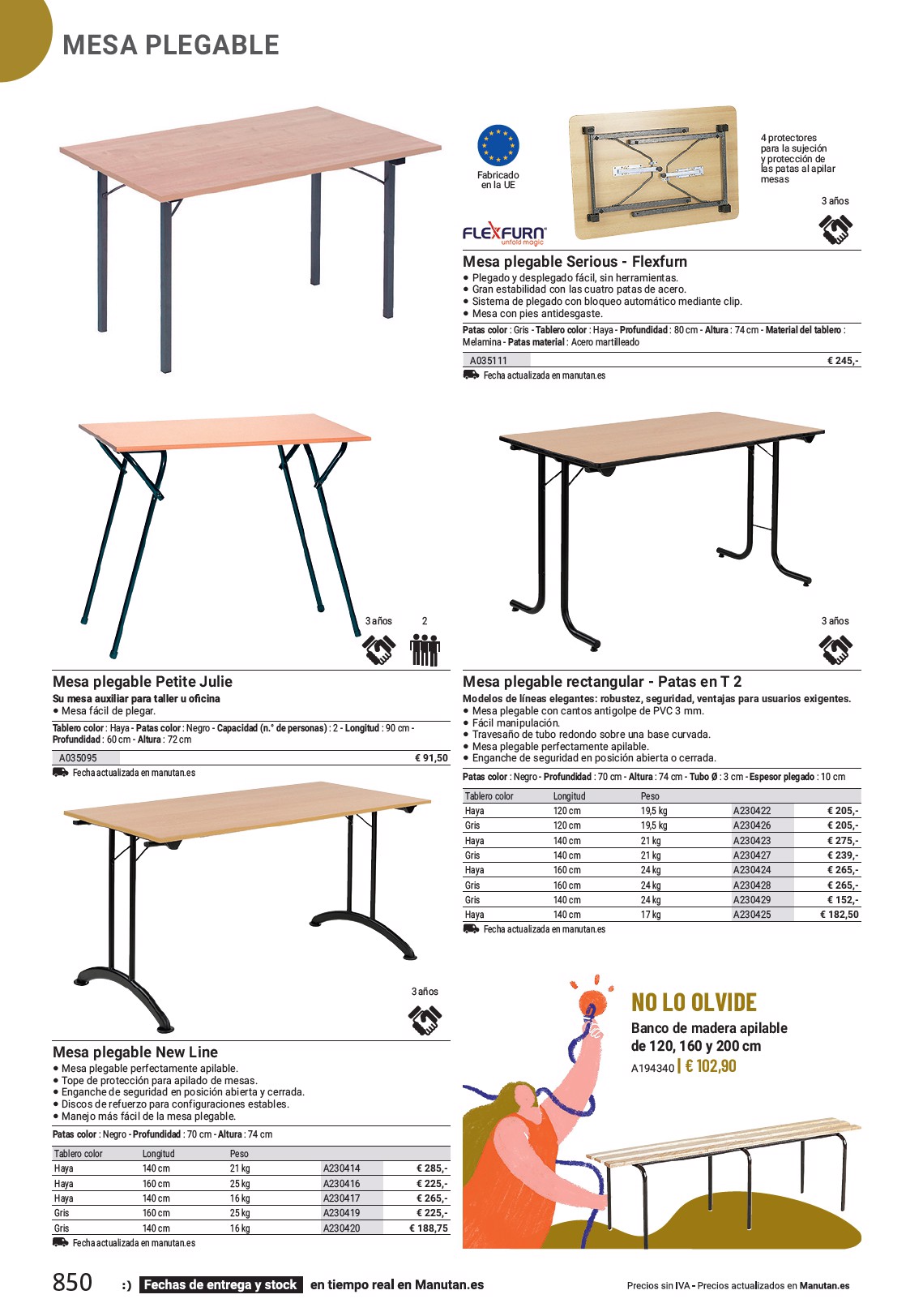 MESA PLEGABLE Fabricado en la UE 4 protectores para la sujeción y protección de las patas al apilar mesas 3 años Mesa plegable Serious - Flexfurn • Plegado y desplegado fácil, sin herramientas. • Gran estabilidad con las cuatro patas de acero. • Sistema de plegado con bloqueo automático mediante clip. • Mesa con pies antidesgaste. Patas color : Gris - Tablero color : Haya - Profundidad : 80 cm - Altura : 74 cm - Material del tablero : Melamina - Patas material : Acero martilleado A035111 € 245,- Fecha actualizada en manutan.es 3 años 2 3 años Mesa plegable Petite Julie Su mesa auxiliar para taller u oficina • Mesa fácil de plegar. Tablero color : Haya - Patas color : Negro - Capacidad (n.° de personas) : 2 - Longitud : 90 cm - Profundidad : 60 cm - Altura : 72 cm A035095 € 91,50 Fecha actualizada en manutan.es Mesa plegable rectangular - Patas en T 2 Modelos de líneas elegantes: robustez, seguridad, ventajas para usuarios exigentes. • Mesa plegable con cantos antigolpe de PVC 3 mm. • Fácil manipulación. • Travesaño de tubo redondo sobre una base curvada. • Mesa plegable perfectamente apilable. • Enganche de seguridad en posición abierta o cerrada. Patas color : Negro - Profundidad : 70 cm - Altura : 74 cm - Tubo Ø : 3 cm - Espesor plegado : 10 cm Tablero color Longitud Haya 120 cm Gris 120 cm Haya 140 cm Gris 140 cm Haya 160 cm Gris 160 cm Gris 140 cm Haya 140 cm Fecha actualizada en manutan.es Peso 19,5 kg 19,5 kg 21 kg 21 kg 24 kg 24 kg 24 kg 17 kg A230422 A230426 A230423 A230427 A230424 A230428 A230429 A230425 € 205,- € 205,- € 275,- € 239,- € 265,- € 265,- € 152,- € 182,50 Mesa plegable New Line • Mesa plegable perfectamente apilable. • Tope de protección para apilado de mesas. • Enganche de seguridad en posición abierta y cerrada. • Discos de refuerzo para configuraciones estables. • Manejo más fácil de la mesa plegable. Patas color : Negro - Profundidad : 70 cm - Altura : 74 cm Tablero color Longitud Peso Haya 140 cm 21 kg Haya 160 cm 25 kg Haya 140 cm 16 kg Gris 160 cm 25 kg Gris 140 cm 16 kg Fecha actualizada en manutan.es A230414 A230416 A230417 A230419 A230420 850 3 años € 285,- € 225,- € 265,- € 225,- € 188,75 NO LO OLVIDE Banco de madera apilable de 120, 160 y 200 cm A194340 | € 102,90