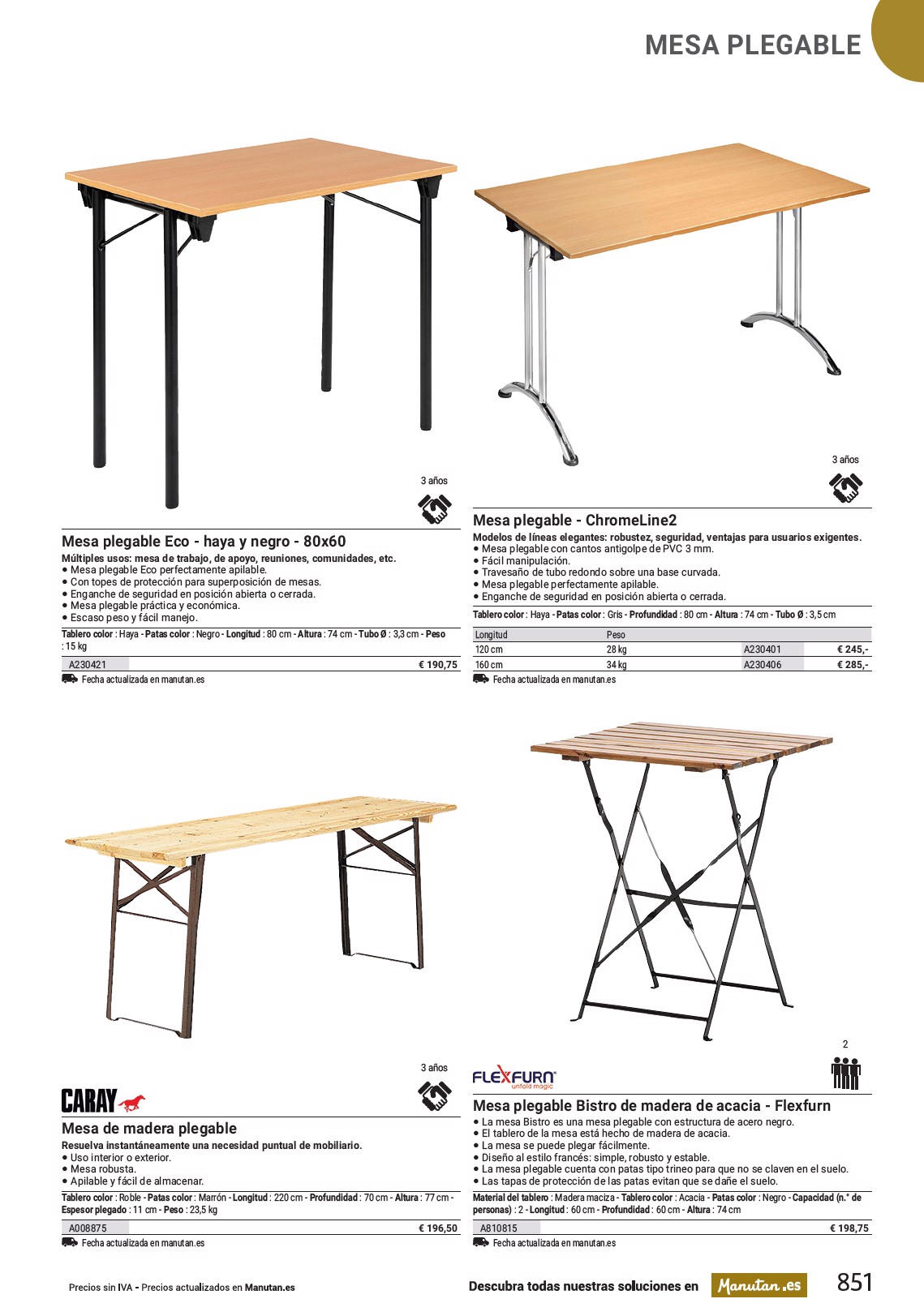 MESA PLEGABLE 3 años 3 años Mesa plegable Eco - haya y negro - 80x60 Múltiples usos: mesa de trabajo, de apoyo, reuniones, comunidades, etc. • Mesa plegable Eco perfectamente apilable. • Con topes de protección para superposición de mesas. • Enganche de seguridad en posición abierta o cerrada. • Mesa plegable práctica y económica. • Escaso peso y fácil manejo. Tablero color : Haya - Patas color : Negro - Longitud : 80 cm - Altura : 74 cm - Tubo Ø : 3,3 cm - Peso : 15 kg A230421 € 190,75 Fecha actualizada en manutan.es Mesa plegable - ChromeLine2 Modelos de líneas elegantes: robustez, seguridad, ventajas para usuarios exigentes. • Mesa plegable con cantos antigolpe de PVC 3 mm. • Fácil manipulación. • Travesaño de tubo redondo sobre una base curvada. • Mesa plegable perfectamente apilable. • Enganche de seguridad en posición abierta o cerrada. Tablero color : Haya - Patas color : Gris - Profundidad : 80 cm - Altura : 74 cm - Tubo Ø : 3,5 cm Longitud Peso 120 cm 28 kg 160 cm 34 kg Fecha actualizada en manutan.es A230401 A230406 € 245,- € 285,- 2 3 años Mesa de madera plegable Resuelva instantáneamente una necesidad puntual de mobiliario. • Uso interior o exterior. • Mesa robusta. • Apilable y fácil de almacenar. Tablero color : Roble - Patas color : Marrón - Longitud : 220 cm - Profundidad : 70 cm - Altura : 77 cm - Espesor plegado : 11 cm - Peso : 23,5 kg A008875 € 196,50 Fecha actualizada en manutan.es Mesa plegable Bistro de madera de acacia - Flexfurn • La mesa Bistro es una mesa plegable con estructura de acero negro. • El tablero de la mesa está hecho de madera de acacia. • La mesa se puede plegar fácilmente. • Diseño al estilo francés: simple, robusto y estable. • La mesa plegable cuenta con patas tipo trineo para que no se claven en el suelo. • Las tapas de protección de las patas evitan que se dañe el suelo. Material del tablero : Madera maciza - Tablero color : Acacia - Patas color : Negro - Capacidad (n.° de personas) : 2 - Longitud : 60 cm - Profundidad : 60 cm - Altura : 74 cm A810815 € 198,75 Fecha actualizada en manutan.es 851