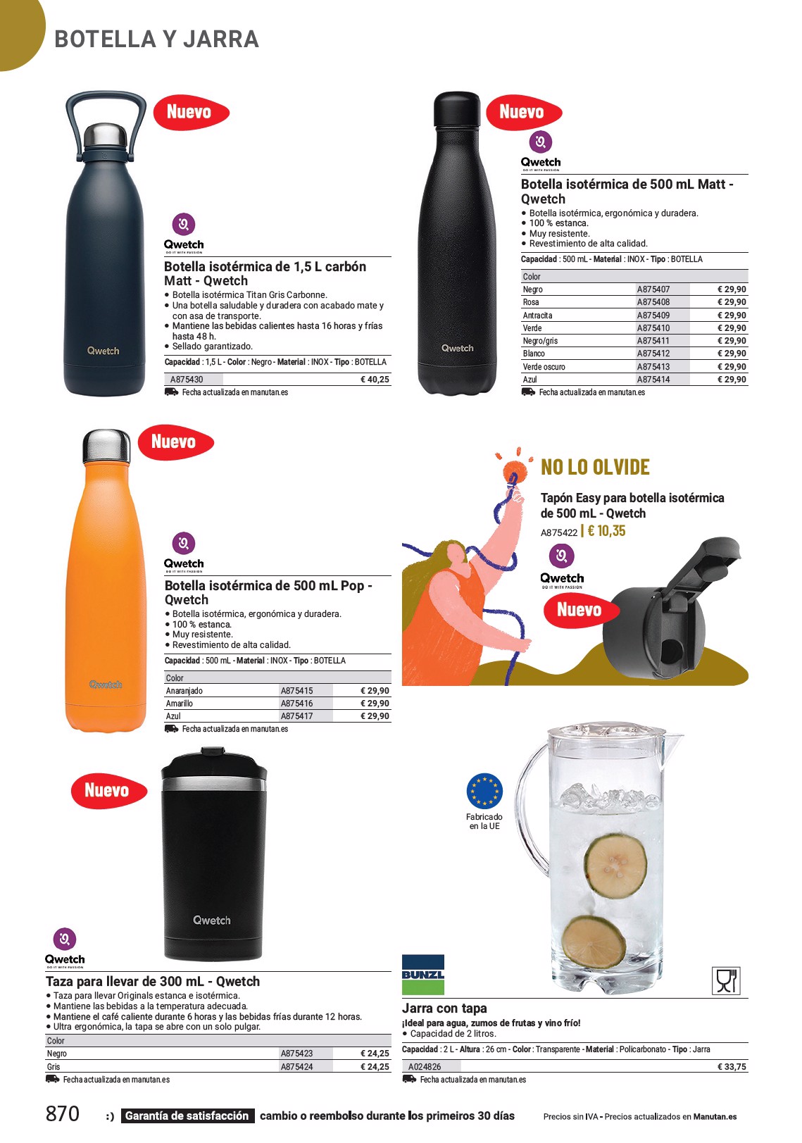 BOTELLA Y JARRA Botella isotérmica de 1,5 L carbón Matt - Qwetch • Botella isotérmica Titan Gris Carbonne. • Una botella saludable y duradera con acabado mate y con asa de transporte. • Mantiene las bebidas calientes hasta 16 horas y frías hasta 48 h. • Sellado garantizado. Capacidad : 1,5 L - Color : Negro - Material : INOX - Tipo : BOTELLA A875430 Fecha actualizada en manutan.es € 40,25 Botella isotérmica de 500 mL Pop - Qwetch • Botella isotérmica, ergonómica y duradera. • 100 % estanca. • Muy resistente. • Revestimiento de alta calidad. Capacidad : 500 mL - Material : INOX - Tipo : BOTELLA Color Anaranjado A875415 Amarillo A875416 Azul A875417 Fecha actualizada en manutan.es € 29,90 € 29,90 € 29,90 Botella isotérmica de 500 mL Matt - Qwetch • Botella isotérmica, ergonómica y duradera. • 100 % estanca. • Muy resistente. • Revestimiento de alta calidad. Capacidad : 500 mL - Material : INOX - Tipo : BOTELLA Color Negro A875407 Rosa A875408 Antracita A875409 Verde A875410 Negro/gris A875411 Blanco A875412 Verde oscuro A875413 Azul A875414 Fecha actualizada en manutan.es € 29,90 € 29,90 € 29,90 € 29,90 € 29,90 € 29,90 € 29,90 € 29,90 NO LO OLVIDE Tapón Easy para botella isotérmica de 500 mL - Qwetch A875422 | € 10,35 Fabricado en la UE Taza para llevar de 300 mL - Qwetch • Taza para llevar Originals estanca e isotérmica. • Mantiene las bebidas a la temperatura adecuada. • Mantiene el café caliente durante 6 horas y las bebidas frías durante 12 horas. • Ultra ergonómica, la tapa se abre con un solo pulgar. Color Negro A875423 € 24,25 Gris A875424 € 24,25 Fecha actualizada en manutan.es Jarra con tapa ¡Ideal para agua, zumos de frutas y vino frío! • Capacidad de 2 litros. Capacidad : 2 L - Altura : 26 cm - Color : Transparente - Material : Policarbonato - Tipo : Jarra A024826 Fecha actualizada en manutan.es € 33,75 870
