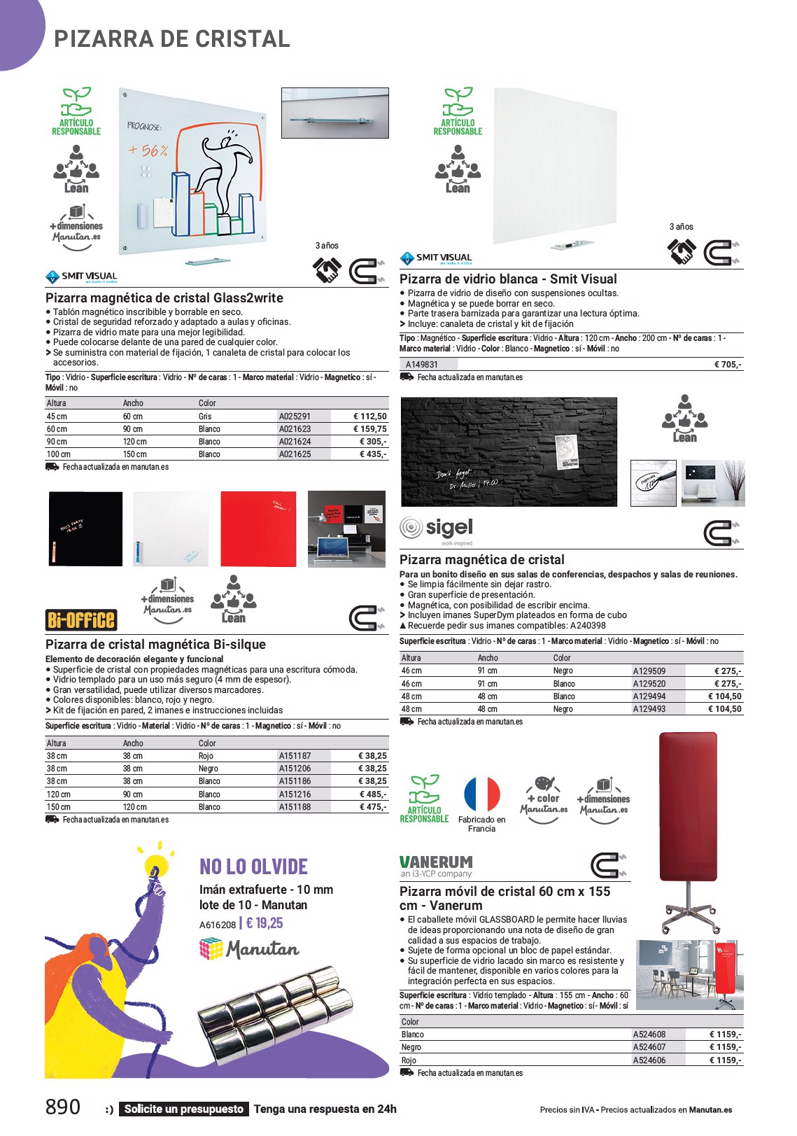 PIZARRA DE CRISTAL Lean Lean 3 años 3 años Pizarra magnética de cristal Glass2write • Tablón magnético inscribible y borrable en seco. • Cristal de seguridad reforzado y adaptado a aulas y oficinas. • Pizarra de vidrio mate para una mejor legibilidad. • Puede colocarse delante de una pared de cualquier color. O Se suministra con material de fijación, 1 canaleta de cristal para colocar los accesorios. Tipo : Vidrio - Superficie escritura : Vidrio - Nº de caras : 1 - Marco material : Vidrio - Magnetico : sí - Móvil : no Altura Ancho 45 cm 60 cm 60 cm 90 cm 90 cm 120 cm 100 cm 150 cm Fecha actualizada en manutan.es Color Gris Blanco Blanco Blanco A025291 A021623 A021624 A021625 € 112,50 € 159,75 € 305,- € 435,- Pizarra de vidrio blanca - Smit Visual • Pizarra de vidrio de diseño con suspensiones ocultas. • Magnética y se puede borrar en seco. • Parte trasera barnizada para garantizar una lectura óptima. O Incluye: canaleta de cristal y kit de fijación Tipo : Magnético - Superficie escritura : Vidrio - Altura : 120 cm - Ancho : 200 cm - Nº de caras : 1 - Marco material : Vidrio - Color : Blanco - Magnetico : sí - Móvil : no A149831 Fecha actualizada en manutan.es € 705,- Lean Lean Pizarra de cristal magnética Bi-silque Elemento de decoración elegante y funcional • Superficie de cristal con propiedades magnéticas para una escritura cómoda. • Vidrio templado para un uso más seguro (4 mm de espesor). • Gran versatilidad, puede utilizar diversos marcadores. • Colores disponibles: blanco, rojo y negro. O Kit de fijación en pared, 2 imanes e instrucciones incluidas Superficie escritura : Vidrio - Material : Vidrio - Nº de caras : 1 - Magnetico : sí - Móvil : no Altura Ancho 38 cm 38 cm 38 cm 38 cm 38 cm 38 cm 120 cm 90 cm 150 cm 120 cm Fecha actualizada en manutan.es Color Rojo Negro Blanco Blanco Blanco A151187 A151206 A151186 A151216 A151188 € 38,25 € 38,25 € 38,25 € 485,- € 475,- Pizarra magnética de cristal Para un bonito diseño en sus salas de conferencias, despachos y salas de reuniones. • Se limpia fácilmente sin dejar rastro. • Gran superficie de presentación. • Magnética, con posibilidad de escribir encima. O Incluyen imanes SuperDym plateados en forma de cubo SS Recuerde pedir sus imanes compatibles: A240398 Superficie escritura : Vidrio - Nº de caras : 1 - Marco material : Vidrio - Magnetico : sí - Móvil : no Altura Ancho 46 cm 91 cm 46 cm 91 cm 48 cm 48 cm 48 cm 48 cm Fecha actualizada en manutan.es Color Negro Blanco Blanco Negro A129509 A129520 A129494 A129493 € 275,- € 275,- € 104,50 € 104,50 Fabricado en Francia NO LO OLVIDE Imán extrafuerte - 10 mm lote de 10 - Manutan A616208 | € 19,25 Pizarra móvil de cristal 60 cm x 155 cm - Vanerum • El caballete móvil GLASSBOARD le permite hacer lluvias de ideas proporcionando una nota de diseño de gran calidad a sus espacios de trabajo. • Sujete de forma opcional un bloc de papel estándar. • Su superficie de vidrio lacado sin marco es resistente y fácil de mantener, disponible en varios colores para la integración perfecta en sus espacios. Superficie escritura : Vidrio templado - Altura : 155 cm - Ancho : 60 cm - Nº de caras : 1 - Marco material : Vidrio - Magnetico : sí - Móvil : sí Color Blanco Negro Rojo Fecha actualizada en manutan.es A524608 A524607 A524606 € 1159,- € 1159,- € 1159,- 890