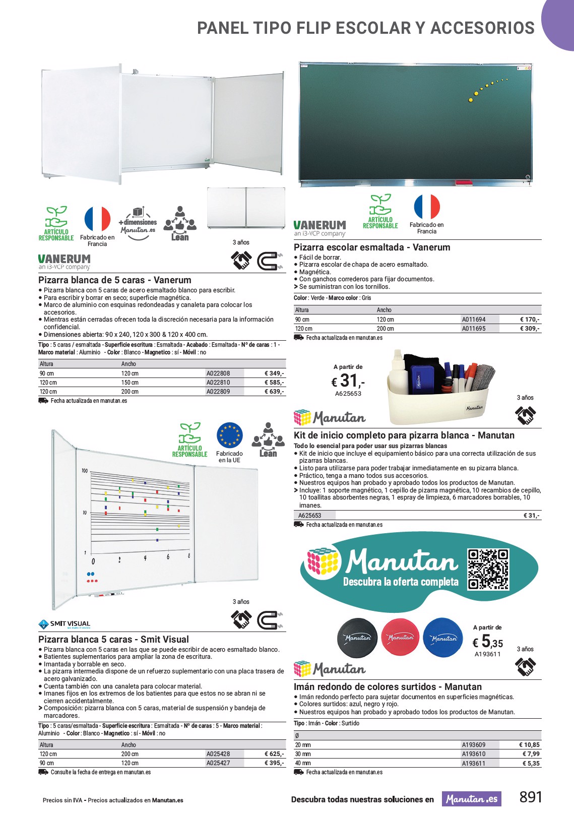 PANEL TIPO FLIP ESCOLAR Y ACCESORIOS Fabricado en Francia Lean 3 años Pizarra blanca de 5 caras - Vanerum • Pizarra blanca con 5 caras de acero esmaltado blanco para escribir. • Para escribir y borrar en seco; superficie magnética. • Marco de aluminio con esquinas redondeadas y canaleta para colocar los accesorios. • Mientras están cerradas ofrecen toda la discreción necesaria para la información confidencial. • Dimensiones abierta: 90 x 240, 120 x 300 & 120 x 400 cm. Tipo : 5 caras / esmaltada - Superficie escritura : Esmaltada - Acabado : Esmaltada - Nº de caras : 1 - Marco material : Aluminio - Color : Blanco - Magnetico : sí - Móvil : no Altura Ancho 90 cm 120 cm 120 cm 150 cm 120 cm 200 cm Fecha actualizada en manutan.es A022808 A022810 A022809 € 349,- € 585,- € 639,- Fabricado en Francia Pizarra escolar esmaltada - Vanerum • Fácil de borrar. • Pizarra escolar de chapa de acero esmaltado. • Magnética. • Con ganchos correderos para fijar documentos. O Se suministran con los tornillos. Color : Verde - Marco color : Gris Altura Ancho 90 cm 120 cm 120 cm 200 cm Fecha actualizada en manutan.es € 31 ,- A partir de A625653 A011694 A011695 € 170,- € 309,- 3 años Fabricado en la UE Lean Kit de inicio completo para pizarra blanca - Manutan Todo lo esencial para poder usar sus pizarras blancas • Kit de inicio que incluye el equipamiento básico para una correcta utilización de sus pizarras blancas. • Listo para utilizarse para poder trabajar inmediatamente en su pizarra blanca. • Práctico, tenga a mano todos sus accesorios. • Nuestros equipos han probado y aprobado todos los productos de Manutan. O Incluye: 1 soporte magnético, 1 cepillo de pizarra magnética, 10 recambios de cepillo, 10 toallitas absorbentes negras, 1 espray de limpieza, 6 marcadores borrables, 10 imanes. A625653 € 31,- Fecha actualizada en manutan.es Descubra la oferta completa 3 años Pizarra blanca 5 caras - Smit Visual • Pizarra blanca con 5 caras en las que se puede escribir de acero esmaltado blanco. • Batientes suplementarios para ampliar la zona de escritura. • Imantada y borrable en seco. • La pizarra intermedia dispone de un refuerzo suplementario con una placa trasera de acero galvanizado. • Cuenta también con una canaleta para colocar material. • Imanes fijos en los extremos de los batientes para que estos no se abran ni se cierren accidentalmente. O Composición: pizarra blanca con 5 caras, material de suspensión y bandeja de marcadores. Tipo : 5 caras/esmaltada - Superficie escritura : Esmaltada - Nº de caras : 5 - Marco material : Aluminio - Color : Blanco - Magnetico : sí - Móvil : no Altura Ancho 120 cm 200 cm 90 cm 120 cm Consulte la fecha de entrega en manutan.es A025428 A025427 € 625,- € 395,- € 5 A partir de ,35 A193611 3 años Imán redondo de colores surtidos - Manutan • Imán redondo perfecto para sujetar documentos en superficies magnéticas. • Colores surtidos: azul, negro y rojo. • Nuestros equipos han probado y aprobado todos los productos de Manutan. Tipo : Imán - Color : Surtido Ø 20 mm 30 mm 40 mm Fecha actualizada en manutan.es A193609 A193610 A193611 € 10,85 € 7,99 € 5,35 891