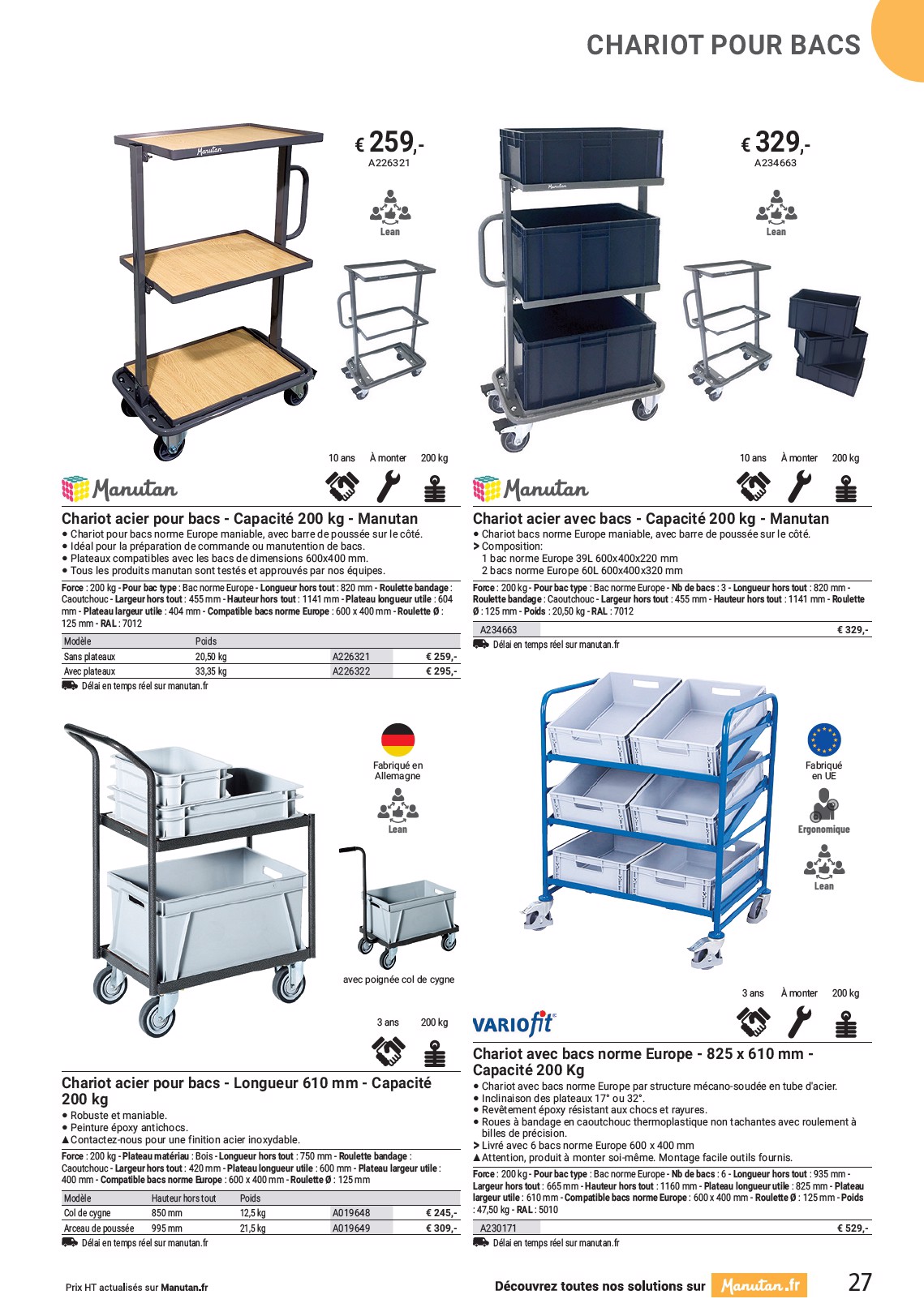 € 259 ,- A226321 Lean CHARIOT POUR BACS € 329 ,- A234663 Lean 10 ans À monter 200 kg 10 ans À monter 200 kg Chariot acier pour bacs - Capacité 200 kg - Manutan • Chariot pour bacs norme Europe maniable, avec barre de poussée sur le côté. • Idéal pour la préparation de commande ou manutention de bacs. • Plateaux compatibles avec les bacs de dimensions 600x400 mm. • Tous les produits manutan sont testés et approuvés par nos équipes. Force : 200 kg - Pour bac type : Bac norme Europe - Longueur hors tout : 820 mm - Roulette bandage : Caoutchouc - Largeur hors tout : 455 mm - Hauteur hors tout : 1141 mm - Plateau longueur utile : 604 mm - Plateau largeur utile : 404 mm - Compatible bacs norme Europe : 600 x 400 mm - Roulette Ø : 125 mm - RAL : 7012 Modèle Poids Sans plateaux 20,50 kg Avec plateaux 33,35 kg Délai en temps réel sur manutan.fr A226321 A226322 € 259,- € 295,- Chariot acier avec bacs - Capacité 200 kg - Manutan • Chariot bacs norme Europe maniable, avec barre de poussée sur le côté. O Composition: 1 bac norme Europe 39L 600x400x220 mm 2 bacs norme Europe 60L 600x400x320 mm Force : 200 kg - Pour bac type : Bac norme Europe - Nb de bacs : 3 - Longueur hors tout : 820 mm - Roulette bandage : Caoutchouc - Largeur hors tout : 455 mm - Hauteur hors tout : 1141 mm - Roulette Ø : 125 mm - Poids : 20,50 kg - RAL : 7012 A234663 Délai en temps réel sur manutan.fr € 329,- Fabriqué en Allemagne Lean Fabriqué en UE Ergonomique Lean avec poignée col de cygne 3 ans À monter 200 kg 3 ans 200 kg Chariot acier pour bacs - Longueur 610 mm - Capacité 200 kg • Robuste et maniable. • Peinture époxy antichocs. SS Contactez-nous pour une finition acier inoxydable. Force : 200 kg - Plateau matériau : Bois - Longueur hors tout : 750 mm - Roulette bandage : Caoutchouc - Largeur hors tout : 420 mm - Plateau longueur utile : 600 mm - Plateau largeur utile : 400 - Compatible bacs norme Europe : 600 x 400 mm - Roulette Ø : 125 mm Modèle Hauteur hors tout Col de cygne 850 mm Arceau de poussée 995 mm Délai en temps réel sur manutan.fr Poids 12,5 kg 21,5 kg A019648 A019649 € 245,- € 309,- Chariot avec bacs norme Europe - 825 x 610 mm - Capacité 200 Kg • Chariot avec bacs norme Europe par structure mécano-soudée en tube d'acier. • Inclinaison des plateaux 17° ou 32°. • Revêtement époxy résistant aux chocs et rayures. • Roues à bandage en caoutchouc thermoplastique non tachantes avec roulement à billes de précision. O Livré avec 6 bacs norme Europe 600 x 400 mm SS Attention, produit à monter soi-même. Montage facile outils fournis. Force : 200 kg - Pour bac type : Bac norme Europe - Nb de bacs : 6 - Longueur hors tout : 935 mm - Largeur hors tout : 665 mm - Hauteur hors tout : 1160 mm - Plateau longueur utile : 825 mm - Plateau largeur utile : 610 mm - Compatible bacs norme Europe : 600 x 400 mm - Roulette Ø : 125 mm - Poids : 47,50 kg - RAL : 5010 A230171 Délai en temps réel sur manutan.fr € 529,- 27