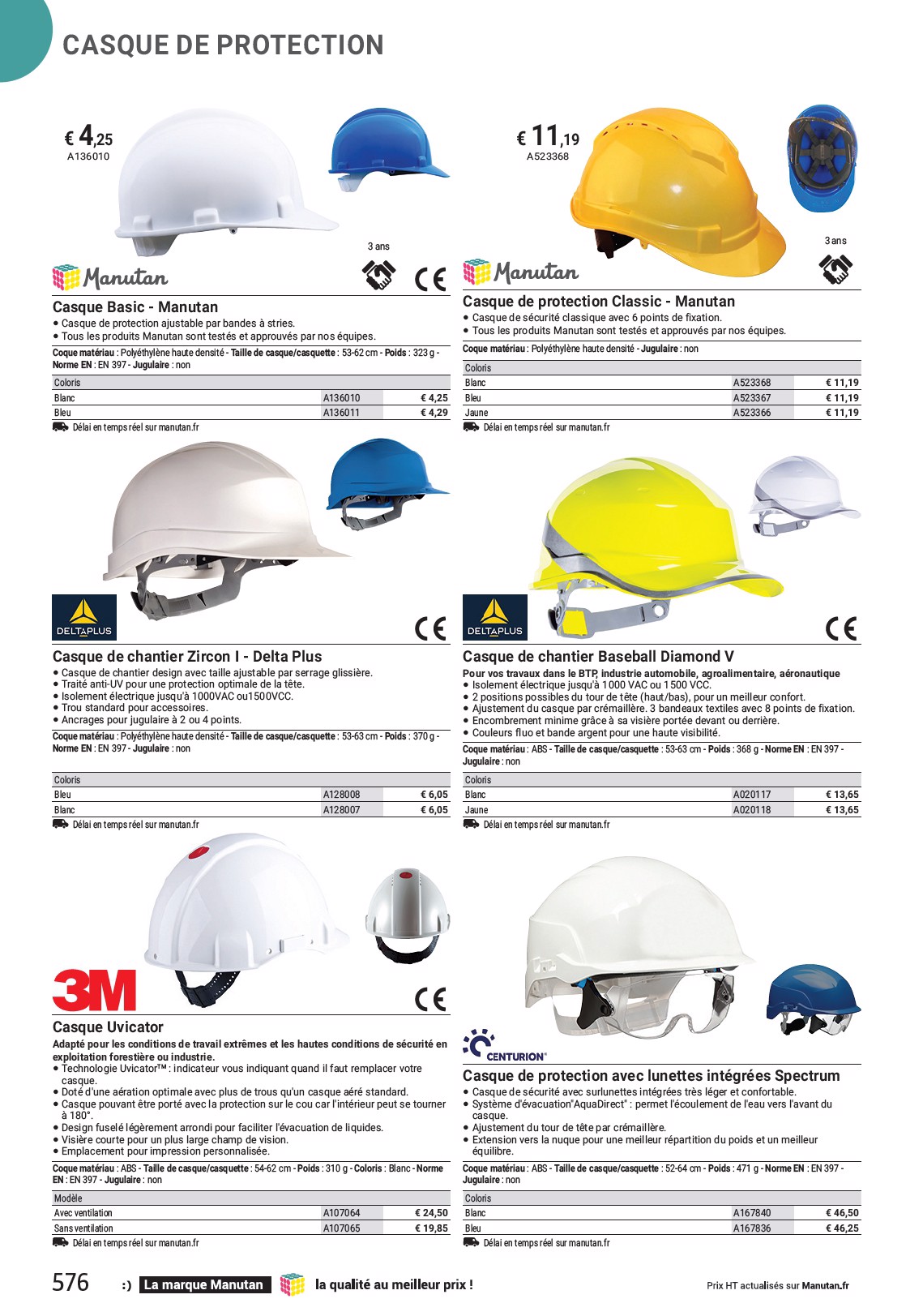 CASQUE DE PROTECTION 4 € ,25 A136010 11 € ,19 A523368 3 ans 3 ans Casque Basic - Manutan • Casque de protection ajustable par bandes à stries. • Tous les produits Manutan sont testés et approuvés par nos équipes. Coque matériau : Polyéthylène haute densité - Taille de casque/casquette : 53-62 cm - Poids : 323 g - Norme EN : EN 397 - Jugulaire : non Coloris Blanc Bleu Délai en temps réel sur manutan.fr A136010 A136011 € 4,25 € 4,29 Casque de protection Classic - Manutan • Casque de sécurité classique avec 6 points de fixation. • Tous les produits Manutan sont testés et approuvés par nos équipes. Coque matériau : Polyéthylène haute densité - Jugulaire : non Coloris Blanc Bleu Jaune Délai en temps réel sur manutan.fr A523368 A523367 A523366 € 11,19 € 11,19 € 11,19 Casque de chantier Zircon I - Delta Plus • Casque de chantier design avec taille ajustable par serrage glissière. • Traité anti-UV pour une protection optimale de la tête. • Isolement électrique jusqu'à 1000VAC ou1500VCC. • Trou standard pour accessoires. • Ancrages pour jugulaire à 2 ou 4 points. Coque matériau : Polyéthylène haute densité - Taille de casque/casquette : 53-63 cm - Poids : 370 g - Norme EN : EN 397 - Jugulaire : non Coloris Bleu Blanc Délai en temps réel sur manutan.fr A128008 A128007 € 6,05 € 6,05 Casque de chantier Baseball Diamond V Pour vos travaux dans le BTP, industrie automobile, agroalimentaire, aéronautique • Isolement électrique jusqu'à 1000 VAC ou 1500 VCC. • 2 positions possibles du tour de tête (haut/bas), pour un meilleur confort. • Ajustement du casque par crémaillère. 3 bandeaux textiles avec 8 points de fixation. • Encombrement minime grâce à sa visière portée devant ou derrière. • Couleurs fluo et bande argent pour une haute visibilité. Coque matériau : ABS - Taille de casque/casquette : 53-63 cm - Poids : 368 g - Norme EN : EN 397 - Jugulaire : non Coloris Blanc Jaune Délai en temps réel sur manutan.fr A020117 A020118 € 13,65 € 13,65 Casque Uvicator Adapté pour les conditions de travail extrêmes et les hautes conditions de sécurité en exploitation forestière ou industrie. • Technologie Uvicator TM : indicateur vous indiquant quand il faut remplacer votre casque. • Doté d'une aération optimale avec plus de trous qu'un casque aéré standard. • Casque pouvant être porté avec la protection sur le cou car l'intérieur peut se tourner à 180°. • Design fuselé légèrement arrondi pour faciliter l'évacuation de liquides. • Visière courte pour un plus large champ de vision. • Emplacement pour impression personnalisée. Coque matériau : ABS - Taille de casque/casquette : 54-62 cm - Poids : 310 g - Coloris : Blanc - Norme EN : EN 397 - Jugulaire : non Modèle Avec ventilation Sans ventilation Délai en temps réel sur manutan.fr A107064 A107065 € 24,50 € 19,85 Casque de protection avec lunettes intégrées Spectrum • Casque de sécurité avec surlunettes intégrées très léger et confortable. • Système d'évacuation"AquaDirect" : permet l'écoulement de l'eau vers l'avant du casque. • Ajustement du tour de tête par crémaillère. • Extension vers la nuque pour une meilleur répartition du poids et un meilleur équilibre. Coque matériau : ABS - Taille de casque/casquette : 52-64 cm - Poids : 471 g - Norme EN : EN 397 - Jugulaire : non Coloris Blanc Bleu Délai en temps réel sur manutan.fr A167840 A167836 € 46,50 € 46,25 576