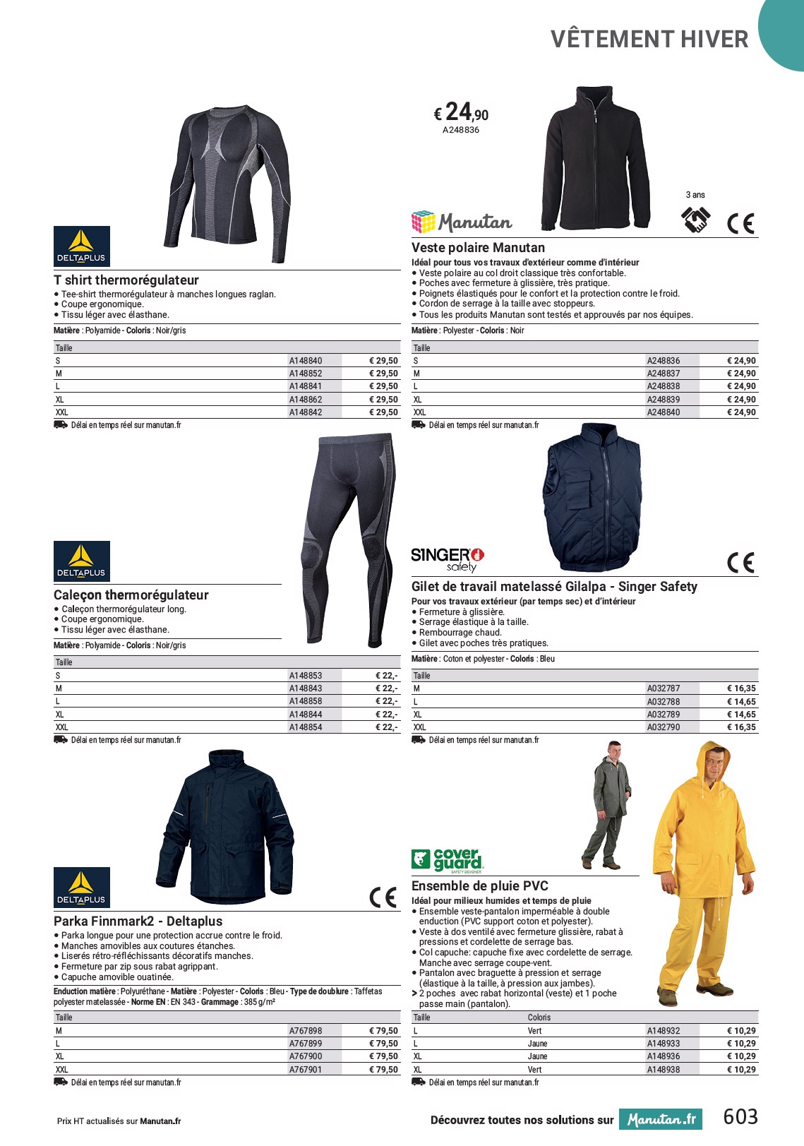 € 24 ,90 A248836 VÊTEMENT HIVER T shirt thermorégulateur • Tee-shirt thermorégulateur à manches longues raglan. • Coupe ergonomique. • Tissu léger avec élasthane. Matière : Polyamide - Coloris : Noir/gris Taille S M L XL XXL Délai en temps réel sur manutan.fr A148840 A148852 A148841 A148862 A148842 3 ans € 29,50 € 29,50 € 29,50 € 29,50 € 29,50 Veste polaire Manutan Idéal pour tous vos travaux d'extérieur comme d'intérieur • Veste polaire au col droit classique très confortable. • Poches avec fermeture à glissière, très pratique. • Poignets élastiqués pour le confort et la protection contre le froid. • Cordon de serrage à la taille avec stoppeurs. • Tous les produits Manutan sont testés et approuvés par nos équipes. Matière : Polyester - Coloris : Noir Taille S M L XL XXL Délai en temps réel sur manutan.fr A248836 A248837 A248838 A248839 A248840 € 24,90 € 24,90 € 24,90 € 24,90 € 24,90 Cale rmorégulateur • égulateur long. • Coupe ergonomique. • Tissu léger avec élasthane. Matière : Polyamide - Coloris : Noir/gris Taille S M L XL XXL Délai en temps réel sur manutan.fr A148853 A148843 A148858 A148844 A148854 € 22,- € 22,- € 22,- € 22,- € 22,- Gilet de travail matelassé Gilalpa - Singer Safety Pour vos travaux extérieur (par temps sec) et d’intérieur • Fermeture à glissière. • Serrage élastique à la taille. • Rembourrage chaud. • Gilet avec poches très pratiques. Matière : Coton et polyester - Coloris : Bleu Taille M L XL XXL Délai en temps réel sur manutan.fr A032787 A032788 A032789 A032790 € 16,35 € 14,65 € 14,65 € 16,35 Parka Finnmark2 - Deltaplus • Parka longue pour une protection accrue contre le froid. • Manches amovibles aux coutures étanches. • Liserés rétro-réfléchissants décoratifs manches. • Fermeture par zip sous rabat agrippant. • Capuche amovible ouatinée. Enduction matière : Polyuréthane - Matière : Polyester - Coloris : Bleu - Type de doublure : Taffetas polyester matelassée - Norme EN : EN 343 - Grammage : 385 g/m² Taille M L XL XXL Délai en temps réel sur manutan.fr A767898 A767899 A767900 A767901 € 79,50 € 79,50 € 79,50 € 79,50 Ensemble de pluie PVC Idéal pour milieux humides et temps de pluie • Ensemble veste-pantalon imperméable à double enduction (PVC support coton et polyester). • Veste à dos ventilé avec fermeture glissière, rabat à pressions et cordelette de serrage bas. • Col capuche: capuche fixe avec cordelette de serrage. Manche avec serrage coupe-vent. • Pantalon avec braguette à pression et serrage (élastique à la taille, à pression aux jambes). O 2 poches avec rabat horizontal (veste) et 1 poche passe main (pantalon). Taille Coloris L Vert L Jaune XL Jaune XL Vert Délai en temps réel sur manutan.fr A148932 A148933 A148936 A148938 € 10,29 € 10,29 € 10,29 € 10,29 603