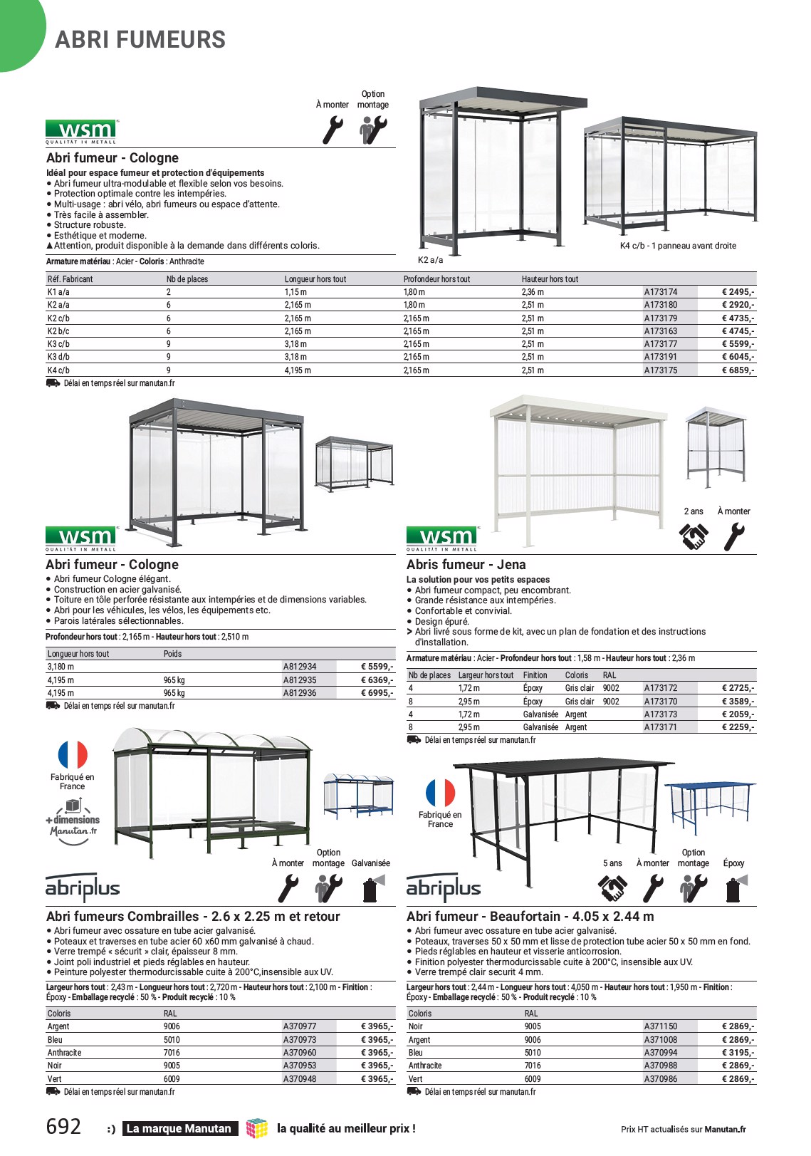 ABRI FUMEURS Option À monter montage Abri fumeur - Cologne Idéal pour espace fumeur et protection d'équipements • Abri fumeur ultra-modulable et flexible selon vos besoins. • Protection optimale contre les intempéries. • Multi-usage : abri vélo, abri fumeurs ou espace d’attente. • Très facile à assembler. • Structure robuste. • Esthétique et moderne. SS Attention, produit disponible à la demande dans différents coloris. Armature matériau : Acier - Coloris : Anthracite Réf. Fabricant Nb de places K1 a/a 2 K2 a/a 6 K2 c/b 6 K2 b/c 6 K3 c/b 9 K3 d/b 9 K4 c/b 9 Délai en temps réel sur manutan.fr Longueur hors tout 1,15 m 2,165 m 2,165 m 2,165 m 3,18 m 3,18 m 4,195 m K2 a/a Profondeur hors tout 1,80 m 1,80 m 2,165 m 2,165 m 2,165 m 2,165 m 2,165 m Hauteur hors tout 2,36 m 2,51 m 2,51 m 2,51 m 2,51 m 2,51 m 2,51 m K4 c/b - 1 panneau avant droite A173174 A173180 A173179 A173163 A173177 A173191 A173175 € 2495,- € 2920,- € 4735,- € 4745,- € 5599,- € 6045,- € 6859,- 2 ans À monter Abri fumeur - Cologne • Abri fumeur Cologne élégant. • Construction en acier galvanisé. • Toiture en tôle perforée résistante aux intempéries et de dimensions variables. • Abri pour les véhicules, les vélos, les équipements etc. • Parois latérales sélectionnables. Profondeur hors tout : 2,165 m - Hauteur hors tout : 2,510 m Longueur hors tout Poids 3,180 m 4,195 m 965 kg 4,195 m 965 kg Délai en temps réel sur manutan.fr A812934 A812935 A812936 € 5599,- € 6369,- € 6995,- Abris fumeur - Jena La solution pour vos petits espaces • Abri fumeur compact, peu encombrant. • Grande résistance aux intempéries. • Confortable et convivial. • Design épuré. O Abri livré sous forme de kit, avec un plan de fondation et des instructions d'installation. Armature matériau : Acier - Profondeur hors tout : 1,58 m - Hauteur hors tout : 2,36 m Nb de places Largeur hors tout Finition Coloris RAL 4 1,72 m Époxy Gris clair 9002 8 2,95 m Époxy Gris clair 9002 4 1,72 m Galvanisée Argent 8 2,95 m Galvanisée Argent Délai en temps réel sur manutan.fr A173172 A173170 A173173 A173171 € 2725,- € 3589,- € 2059,- € 2259,- Fabriqué en France Option À monter montage Galvanisée Fabriqué en France 5 ans Option À monter montage Époxy Abri fumeurs Combrailles - 2.6 x 2.25 m et retour • Abri fumeur avec ossature en tube acier galvanisé. • Poteaux et traverses en tube acier 60 x60 mm galvanisé à chaud. • Verre trempé « sécurit » clair, épaisseur 8 mm. • Joint poli industriel et pieds réglables en hauteur. • Peinture polyester thermodurcissable cuite à 200°C,insensible aux UV. Largeur hors tout : 2,43 m - Longueur hors tout : 2,720 m - Hauteur hors tout : 2,100 m - Finition : Époxy - Emballage recyclé : 50 % - Produit recyclé : 10 % Coloris RAL Argent 9006 Bleu 5010 Anthracite 7016 Noir 9005 Vert 6009 Délai en temps réel sur manutan.fr A370977 A370973 A370960 A370953 A370948 € 3965,- € 3965,- € 3965,- € 3965,- € 3965,- Abri fumeur - Beaufortain - 4.05 x 2.44 m • Abri fumeur avec ossature en tube acier galvanisé. • Poteaux, traverses 50 x 50 mm et lisse de protection tube acier 50 x 50 mm en fond. • Pieds réglables en hauteur et visserie anticorrosion. • Finition polyester thermodurcissable cuite à 200°C, insensible aux UV. • Verre trempé clair securit 4 mm. Largeur hors tout : 2,44 m - Longueur hors tout : 4,050 m - Hauteur hors tout : 1,950 m - Finition : Époxy - Emballage recyclé : 50 % - Produit recyclé : 10 % Coloris RAL Noir 9005 Argent 9006 Bleu 5010 Anthracite 7016 Vert 6009 Délai en temps réel sur manutan.fr A371150 A371008 A370994 A370988 A370986 € 2869,- € 2869,- € 3195,- € 2869,- € 2869,- 692