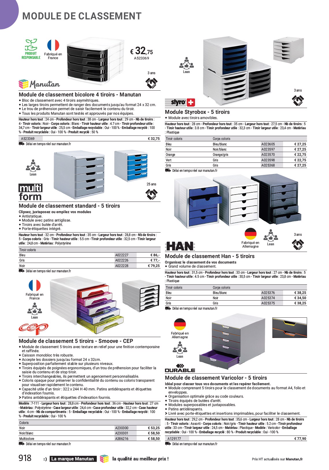 MODULE DE CLASSEMENT PRODUIT Fabriqué en RESPONSABLE France € 32 ,75 A523369 3 ans Lean Module de classement bicolore 4 tiroirs - Manutan • Bloc de classement avec 4 tiroirs asymétriques. • Les larges tiroirs permettent de ranger des documents jusqu'au format 24 x 32 cm. • Le trou de préhension permet de saisir facilement le contenu du tiroir. • Tous les produits Manutan sont testés et approuvés par nos équipes. Hauteur hors tout : 24 cm - Profondeur hors tout : 38 cm - Largeur hors tout : 29 cm - Nb de tiroirs : 4 - Tiroir coloris : Noir - Corps coloris : Blanc - Tiroir hauteur utile : 4.7 cm - Tiroir profondeur utile : 34,7 cm - Tiroir largeur utile : 25,5 cm - Emballage recyclable : Oui - 100 % - Emballage recyclé : 100 % - Produit recyclable : Oui - 100 % - Produit recyclé : 50 % A523369 Délai en temps réel sur manutan.fr € 32,75 Lean 3 ans Module Styrobox - 5 tiroirs • Module avec tiroirs amovibles. Hauteur hors tout : 28 cm - Profondeur hors tout : 35 cm - Largeur hors tout : 27,5 cm - Nb de tiroirs : 5 - Tiroir hauteur utile : 3.8 cm - Tiroir profondeur utile : 32,3 cm - Tiroir largeur utile : 23,4 cm - Matériau : Plastique Tiroir coloris Corps coloris Bleu Bleu/blanc Noir Noir/blanc Orange Orange/gris Vert Gris Gris Gris Délai en temps réel sur manutan.fr A023605 A023597 A023570 A023598 A025368 € 27,25 € 27,25 € 22,75 € 22,75 € 27,25 25 ans Module de classement standard - 5 tiroirs Clipsez, juxtaposez ou empilez vos modules • Antistatique. • Module avec patins antiglisse. • Tiroirs avec butée d'arrêt. • Porte-étiquettes intégré. Hauteur hors tout : 32 cm - Profondeur hors tout : 35 cm - Largeur hors tout : 28,8 cm - Nb de tiroirs : 5 - Corps coloris : Gris - Tiroir hauteur utile : 5.5 cm - Tiroir profondeur utile : 32,5 cm - Tiroir largeur utile : 24,8 cm - Matériau : Polystyrène Tiroir coloris Bleu Gris Noir Délai en temps réel sur manutan.fr A022227 A022226 A022228 € 86,- € 77,- € 79,25 Fabriqué en France Lean 3 ans Fabriqué en Lean Allemagne Module de classement Han - 5 tiroirs Organisez le classement de vos documents • Grand volume de classement. Hauteur hors tout : 31,5 cm - Profondeur hors tout : 33 cm - Largeur hors tout : 27 cm - Nb de tiroirs : 5 - Tiroir hauteur utile : 4.5 cm - Tiroir profondeur utile : 30,5 cm - Tiroir largeur utile : 23,8 cm - Matériau : Plastique Tiroir coloris Corps coloris Bleu Bleu/blanc Noir Noir Gris Gris Délai en temps réel sur manutan.fr A025376 A025374 A025375 € 38,25 € 34,50 € 38,25 Module de classement 5 tiroirs - Smoove - CEP • Module de classement 5 tiroirs avec texture en relief pour une finition contemporaine et raffinée. • Caisson monobloc très robuste. • Accepte les dossiers jusqu’au format 24 x 32cm. • Superposition parfaitement stable sur plusieurs niveaux. • Tiroirs équipés de poignées ergonomiques, d’un trou de préhension pour faciliter la saisie du contenu et de stop tiroir. • Tiroirs interchangeables, ils permettent un agencement personnalisable. • Coloris opaque pour préserver la confidentialité du contenu ou coloris transparent pour visualiser rapidement le contenu. • Capacité utile d'un tiroir : 322 x 244 H 40 mm. Patins antidérapants et étiquettes d’indexation fournis. O Patins antidérapants et étiquettes d’indexation fournis. Modèle : 7-111 - Largeur hors tout : 28,8 cm - Profondeur hors tout : 36 cm - Hauteur hors tout : 27 cm - Matériau : Polystyrène - Case largeur utile : 24,4 cm - Case profondeur utile : 32,2 cm - Case hauteur utile : 4 cm - Nb de compartiments : 5 - Emballage recyclable : Oui - 100 % - Emballage recyclé : 100 % - Produit recyclable : Oui - 100 % Coloris Noir Noir/blanc Multicolore Délai en temps réel sur manutan.fr A230300 A230301 A386216 € 53,25 € 58,50 € 58,50 Fabriqué en Allemagne Lean Module de classement Varicolor - 5 tiroirs Idéal pour classer tous vos documents et les repérer facilement. • Module comprenant 5 tiroirs pour le classement de documents au format A4, folio et enveloppes. • Organisation optimale grâce au code couleurs. • Tiroirs équipés de butées d'arrêt. • Modules superposables et juxtaposables. • Patins antidérapants. O Livré avec porte-étiquettes et insertions imprimables, pour faciliter le classement. Hauteur hors tout : 29,2 cm - Profondeur hors tout : 35,6 cm - Largeur hors tout : 28 cm - Nb de tiroirs : 5 - Tiroir coloris : Assorti - Corps coloris : Noir/gris - Tiroir hauteur utile : 5.2 cm - Tiroir profondeur utile : 33 cm - Tiroir largeur utile : 24,5 cm - Matériau : Plastique - Modèle : Varicolor - Emballage recyclable : Oui - 100 % - Emballage recyclé : 80 % - Produit recyclable : Oui - 100 % A129177 Délai en temps réel sur manutan.fr € 77,90 918