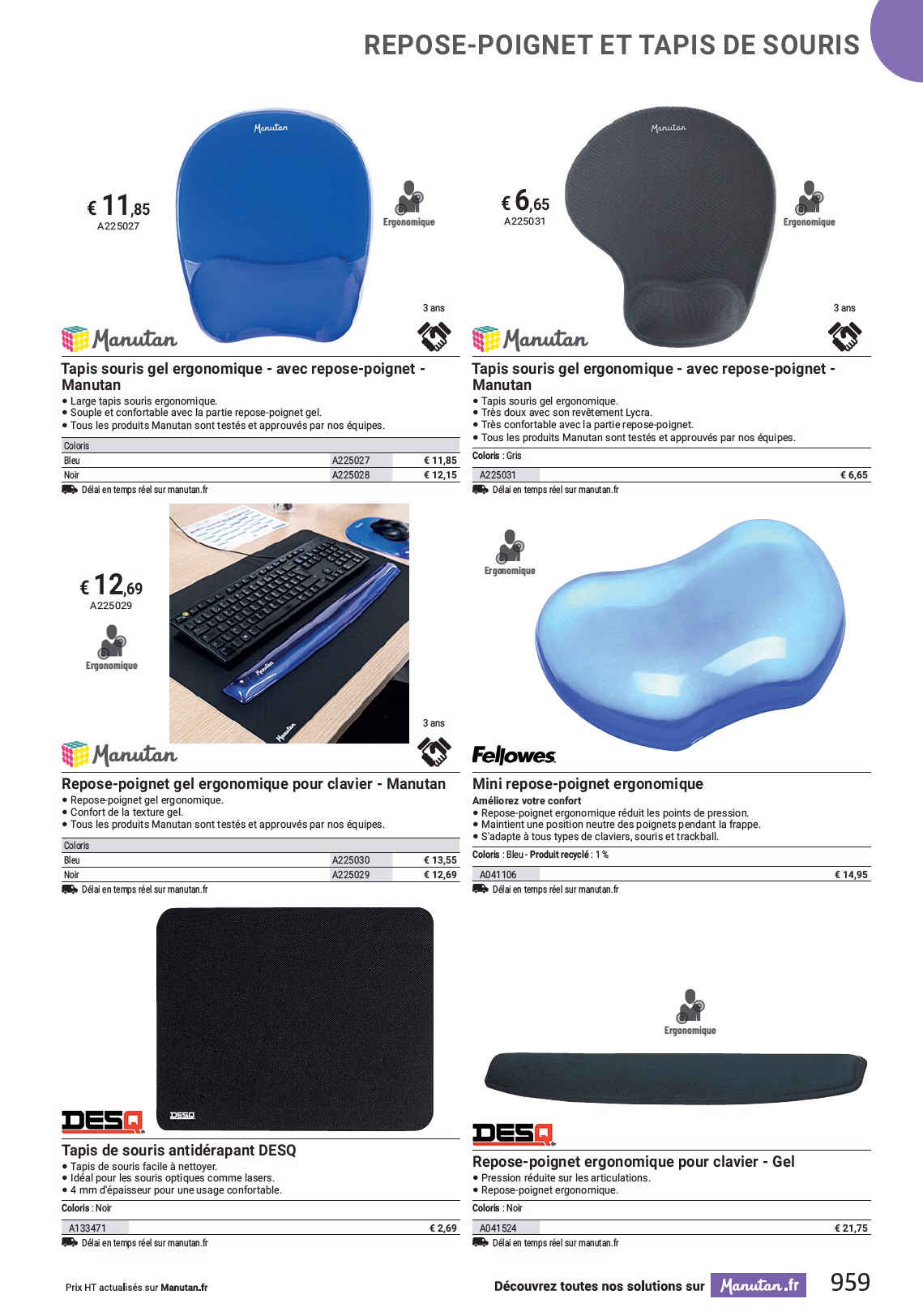 REPOSE-POIGNET ET TAPIS DE SOURIS € 11 ,85 A225027 Ergonomique € 6 ,65 A225031 Ergonomique 3 ans 3 ans Tapis souris gel ergonomique - avec repose-poignet - Manutan • Large tapis souris ergonomique. • Souple et confortable avec la partie repose-poignet gel. • Tous les produits Manutan sont testés et approuvés par nos équipes. Coloris Bleu Noir Délai en temps réel sur manutan.fr A225027 A225028 € 11,85 € 12,15 Tapis souris gel ergonomique - avec repose-poignet - Manutan • Tapis souris gel ergonomique. • Très doux avec son revêtement Lycra. • Très confortable avec la partie repose-poignet. • Tous les produits Manutan sont testés et approuvés par nos équipes. Coloris : Gris A225031 Délai en temps réel sur manutan.fr € 6,65 € 12 ,69 A225029 Ergonomique Ergonomique 3 ans Repose-poignet gel ergonomique pour clavier - Manutan • Repose-poignet gel ergonomique. • Confort de la texture gel. • Tous les produits Manutan sont testés et approuvés par nos équipes. Coloris Bleu Noir Délai en temps réel sur manutan.fr A225030 A225029 € 13,55 € 12,69 Mini repose-poignet ergonomique Améliorez votre confort • Repose-poignet ergonomique réduit les points de pression. • Maintient une position neutre des poignets pendant la frappe. • S'adapte à tous types de claviers, souris et trackball. Coloris : Bleu - Produit recyclé : 1 % A041106 Délai en temps réel sur manutan.fr € 14,95 Tapis de souris antidérapant DESQ • Tapis de souris facile à nettoyer. • Idéal pour les souris optiques comme lasers. • 4 mm d'épaisseur pour une usage confortable. Coloris : Noir A133471 Délai en temps réel sur manutan.fr Ergonomique € 2,69 Repose-poignet ergonomique pour clavier - Gel • Pression réduite sur les articulations. • Repose-poignet ergonomique. Coloris : Noir A041524 Délai en temps réel sur manutan.fr € 21,75 959
